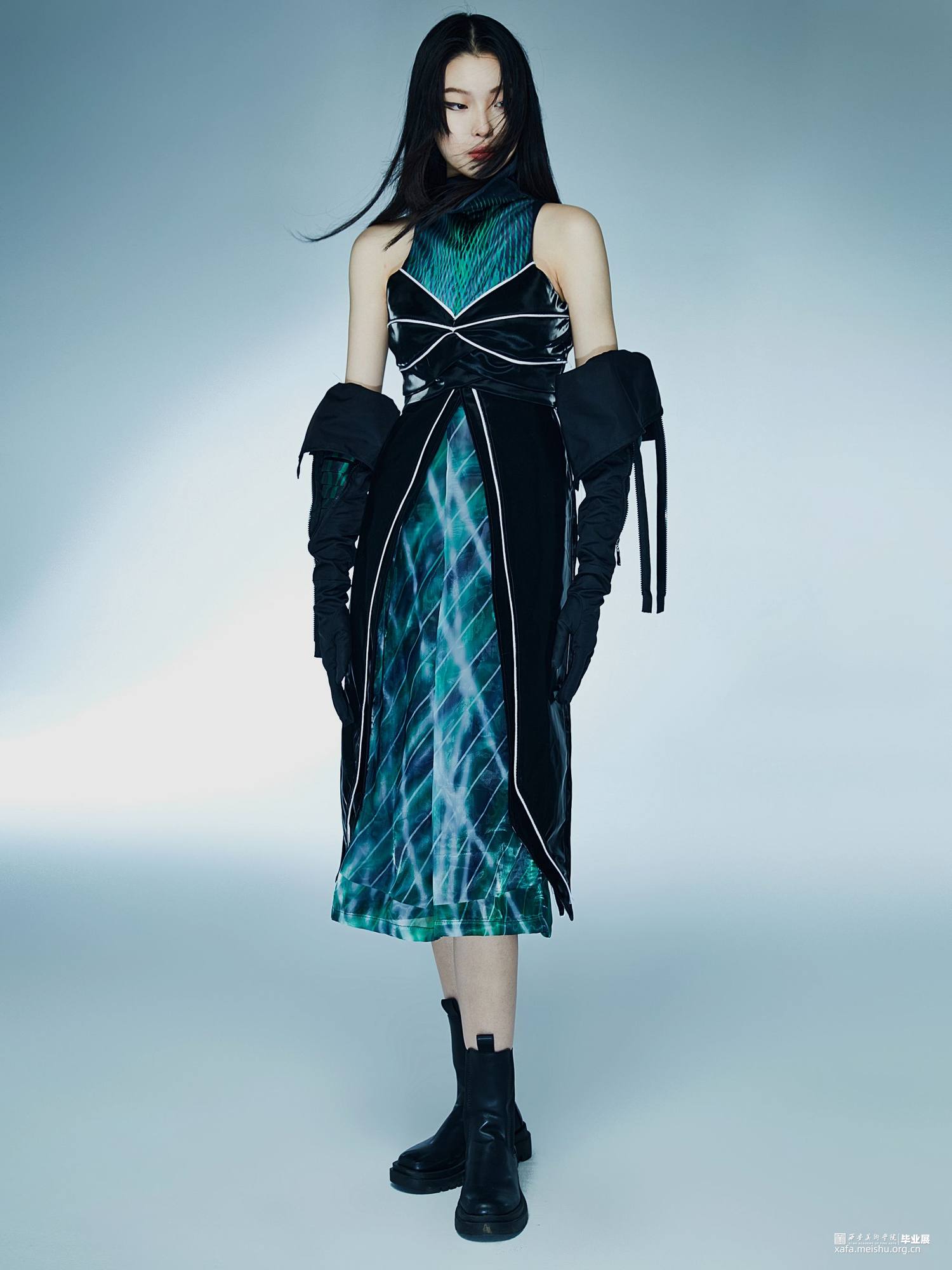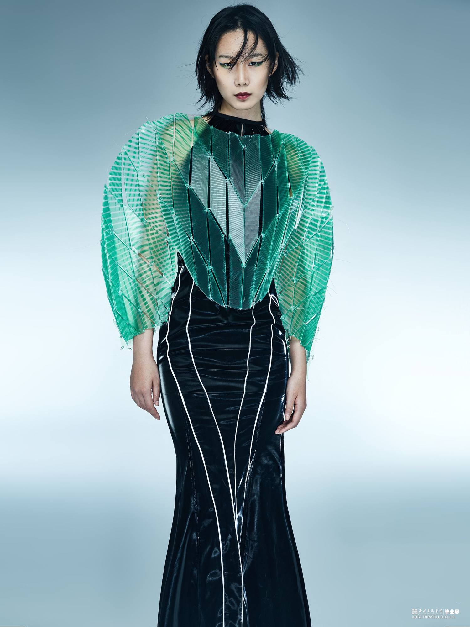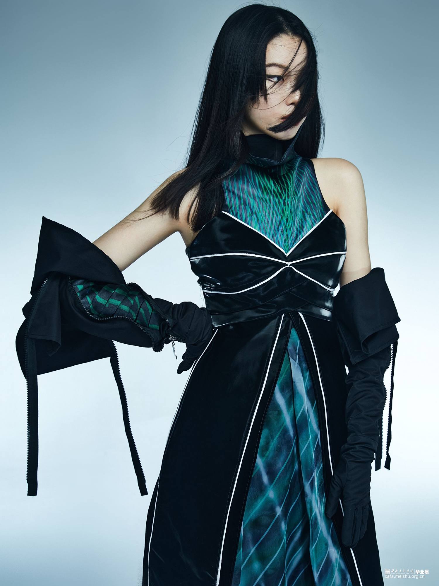 毕业设计运用了黑绿两色作为主色调,将数字技术与现实世界的交互、融合“行为”进行视觉化,绘制出具有科技感的线性纹样,展现数字世界讯息链接的输入与输出。并结合TPU材料与光珊板探索未来服饰的可能性,将数字科技与人类之间的共生关系写进创意服装中。
