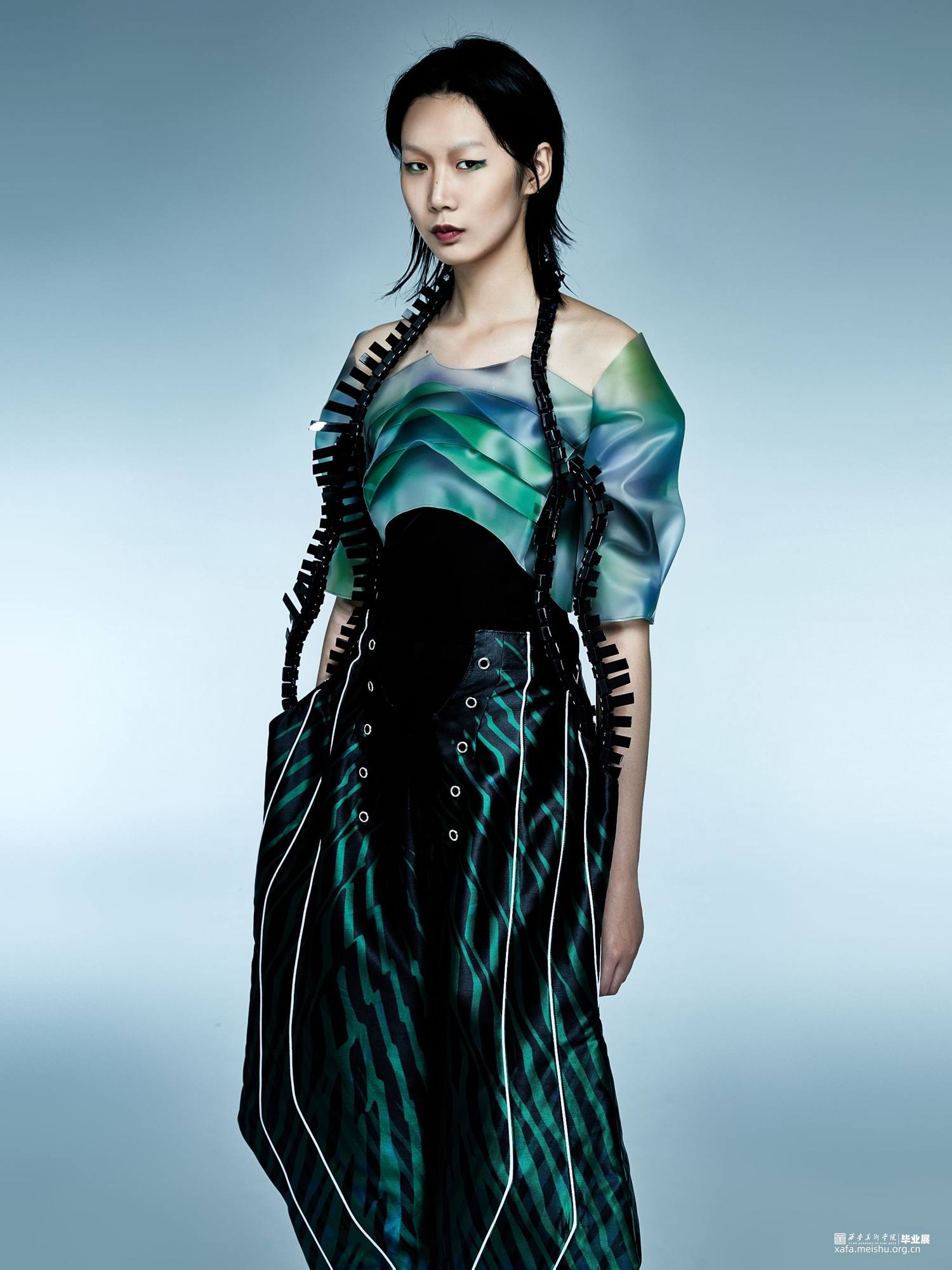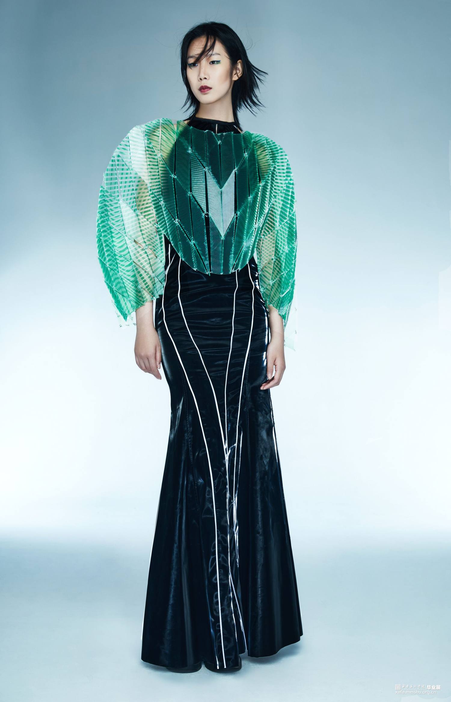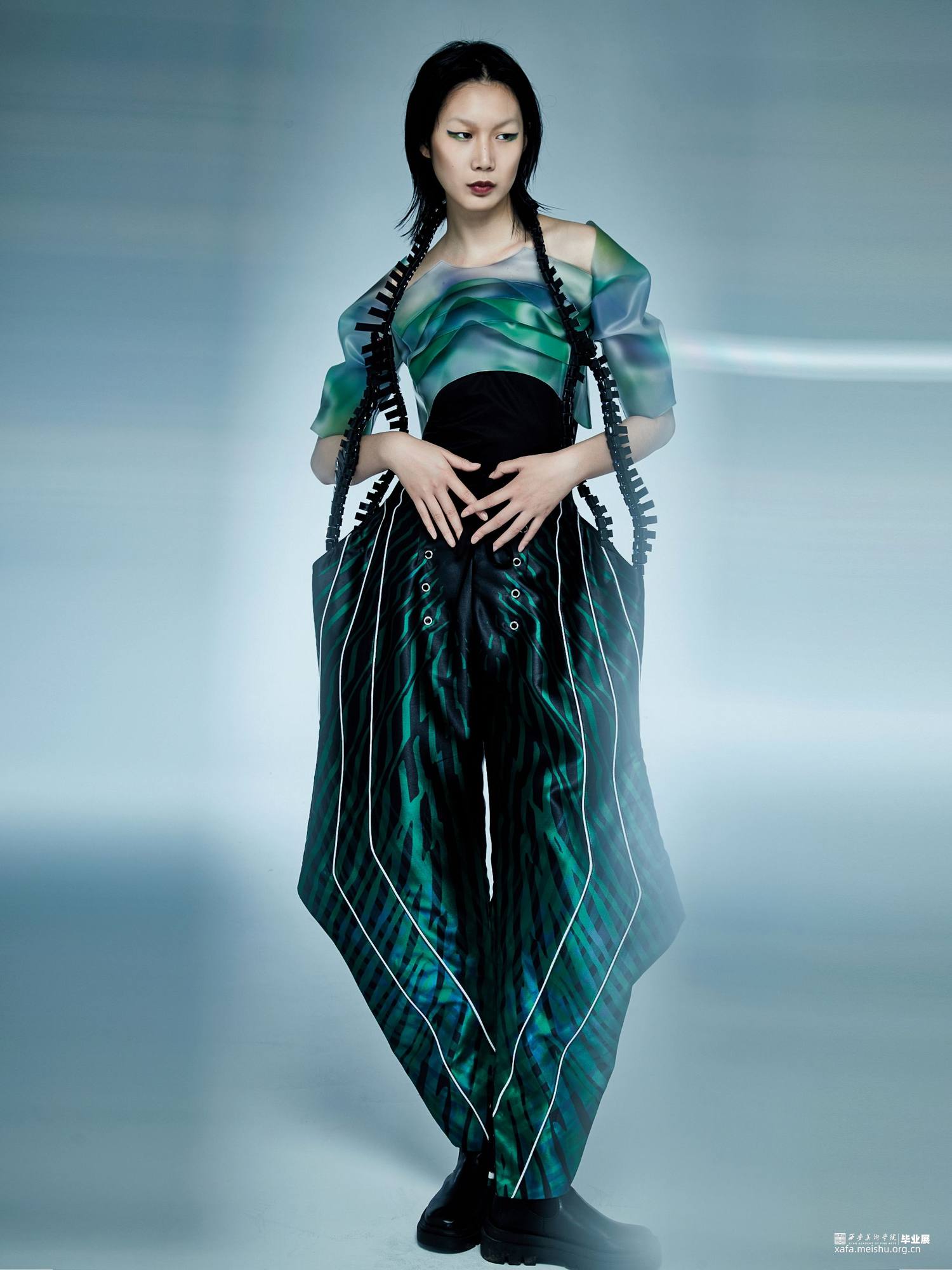 毕业设计运用了黑绿两色作为主色调,将数字技术与现实世界的交互、融合“行为”进行视觉化,绘制出具有科技感的线性纹样,展现数字世界讯息链接的输入与输出。并结合TPU材料与光珊板探索未来服饰的可能性,将数字科技与人类之间的共生关系写进创意服装中。