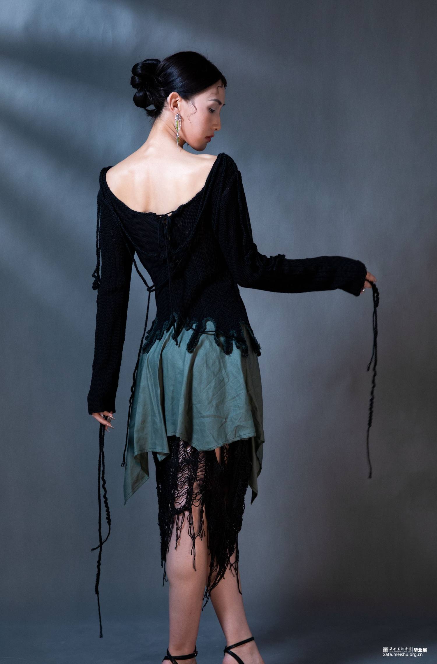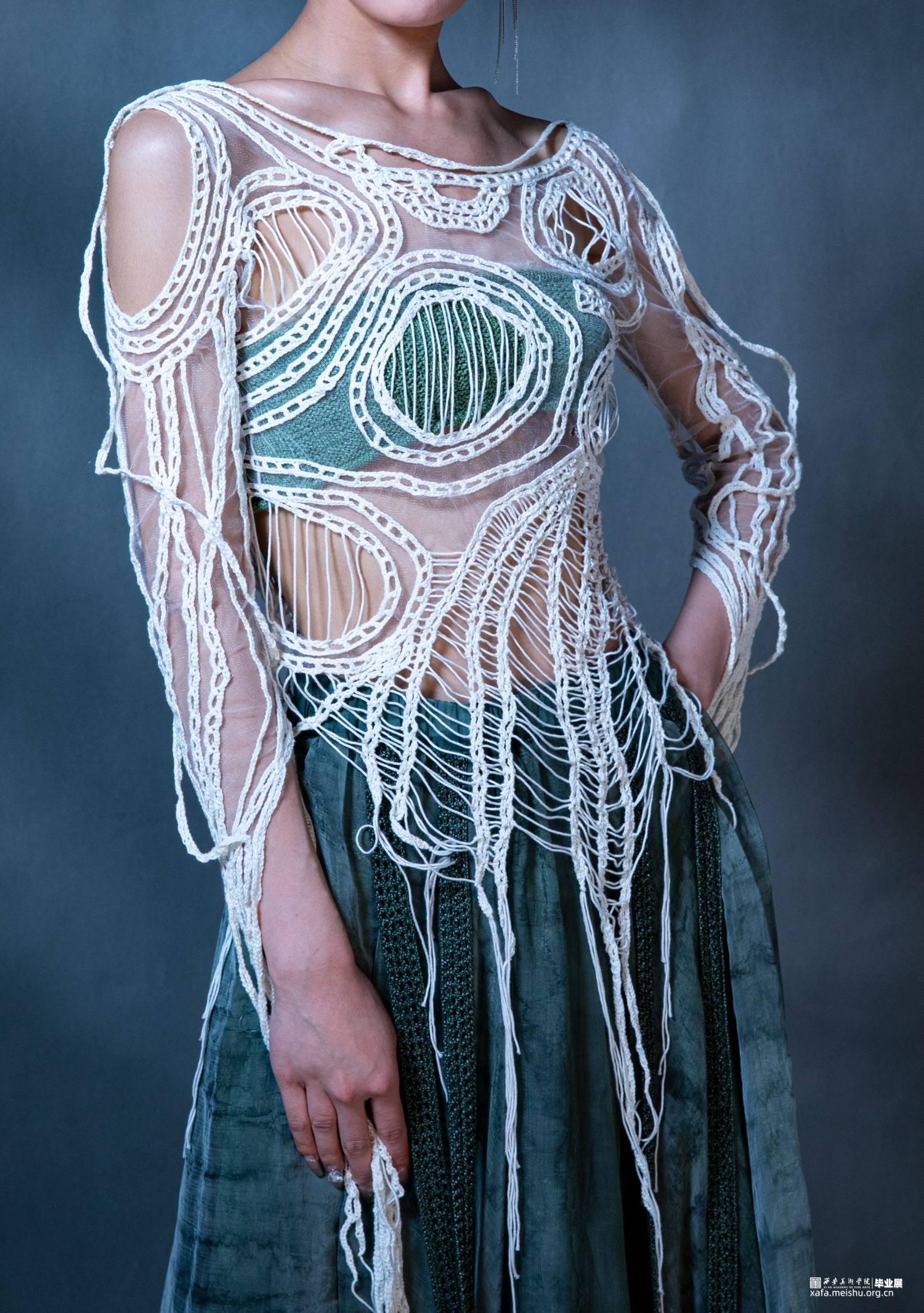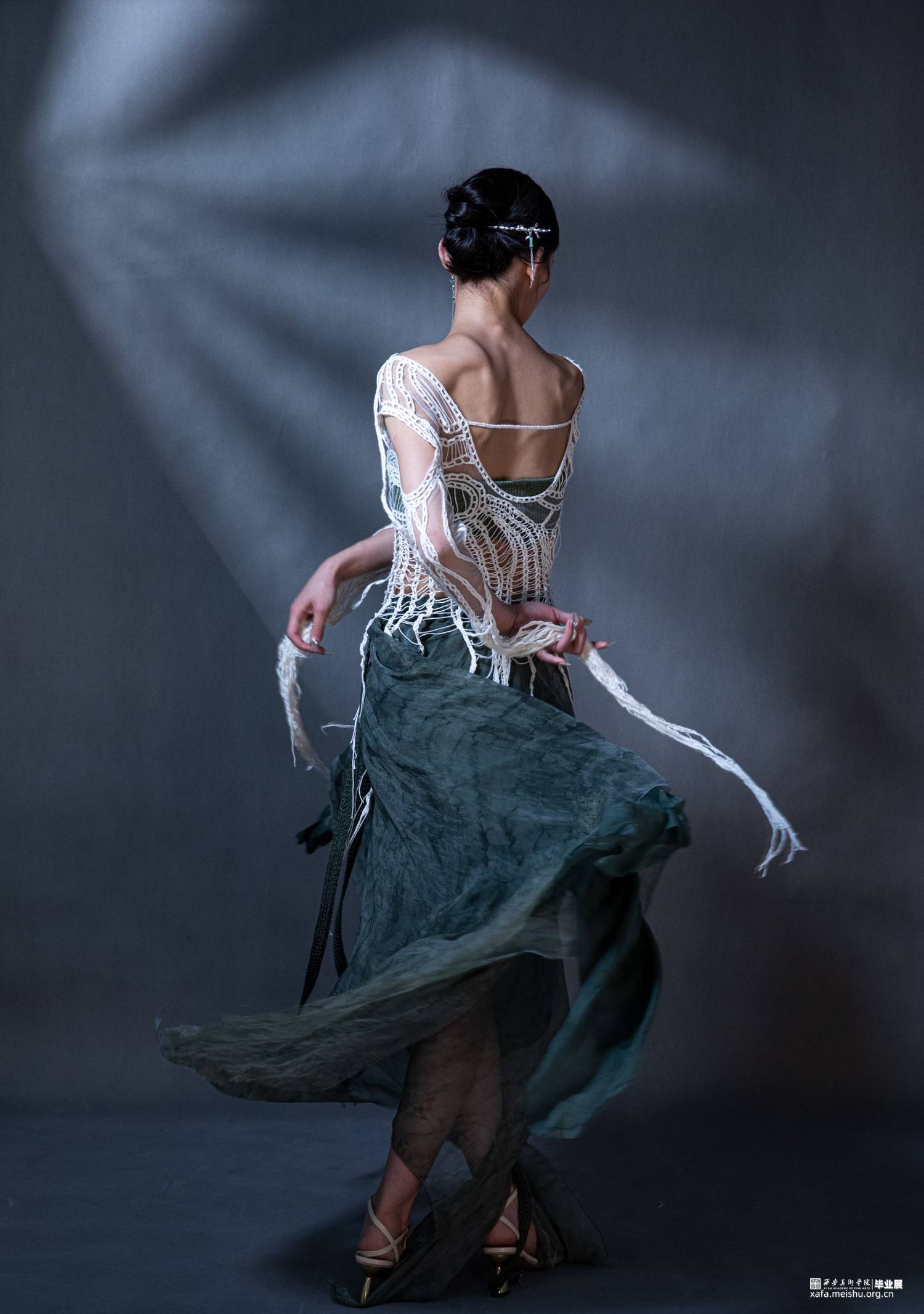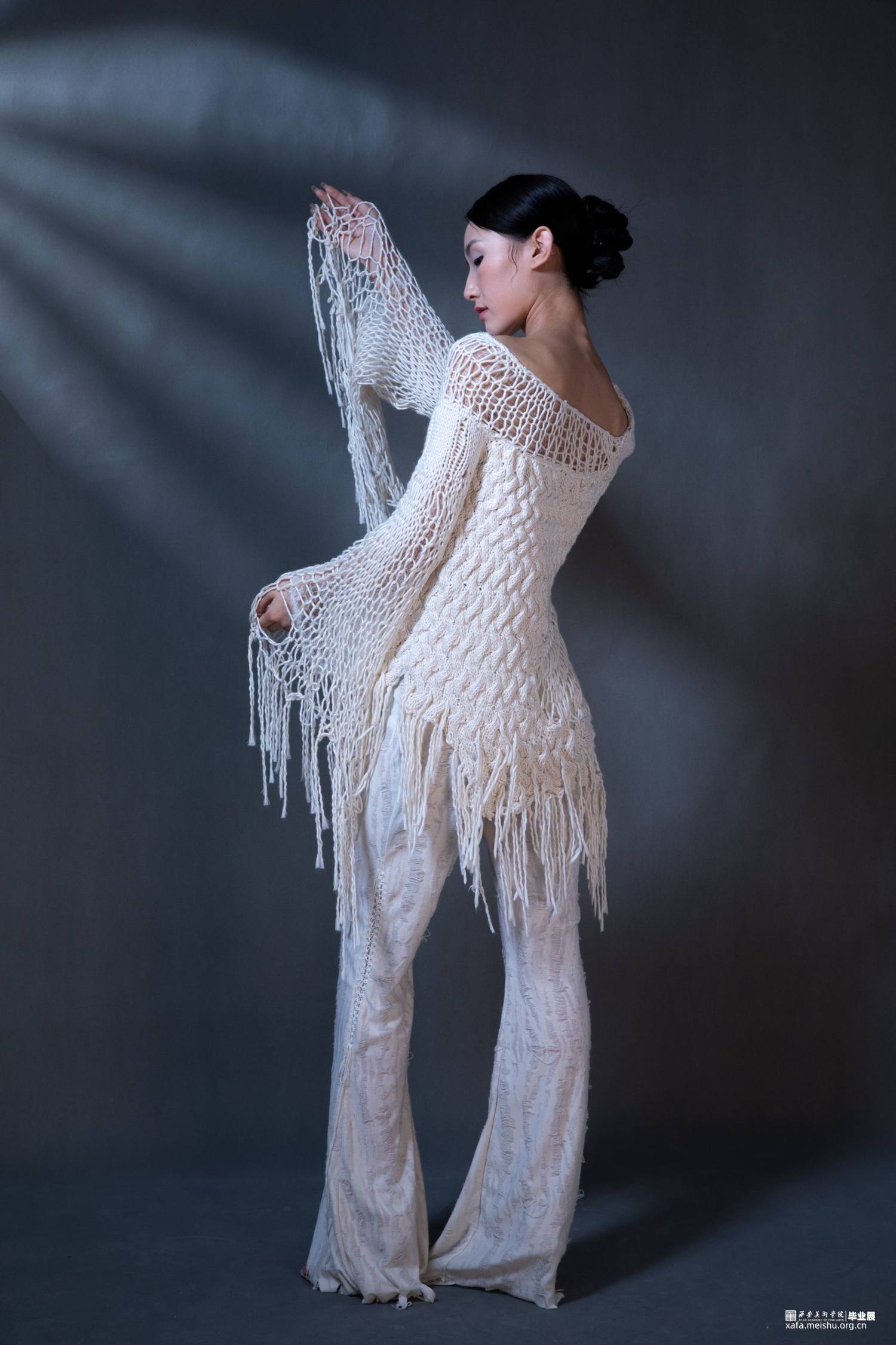通过微观感受植物组织细胞结构为灵感进行设计,以华州竹编编织工艺为依托,色彩多以低饱和的灰色调性为主,廓形选用不对称解构设计,选择纯手工编织面料进行设计,不规则网眼形式的镂空,加上飘带、流苏等设计元素,增加设计的层次效果,设计整体调性为舒适自然,希望穿着者能够回归身处自然、自由随性的本我状态。