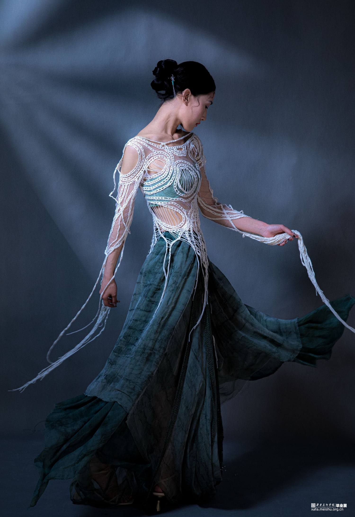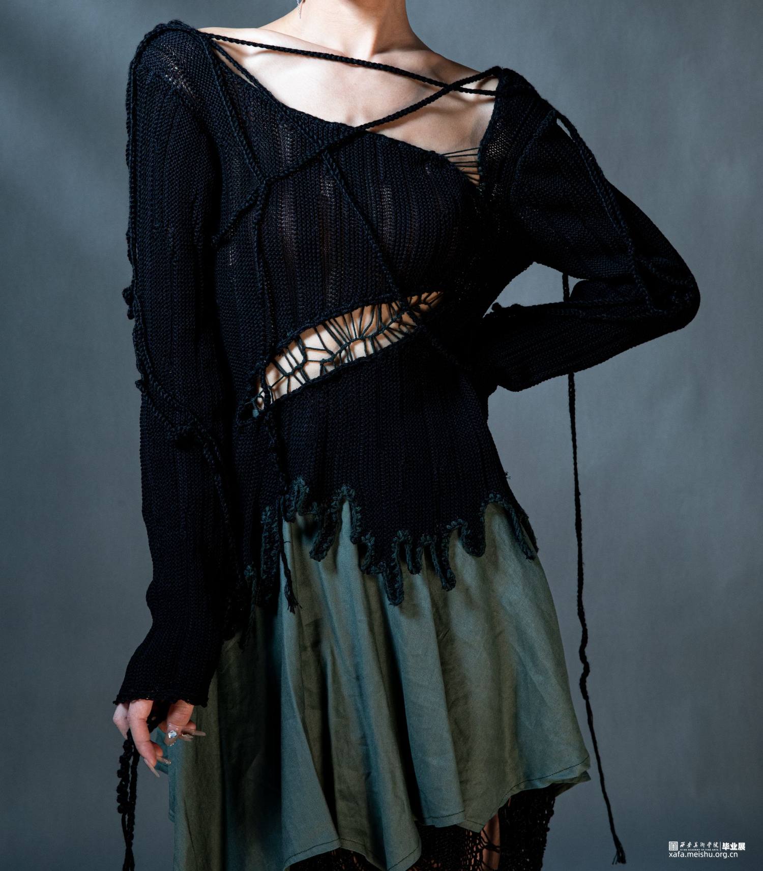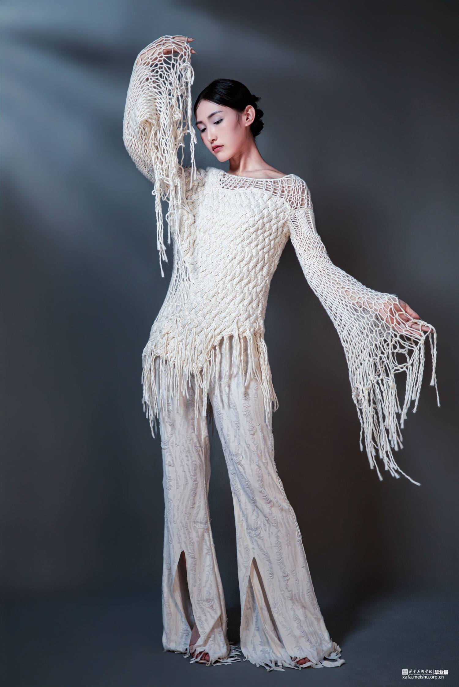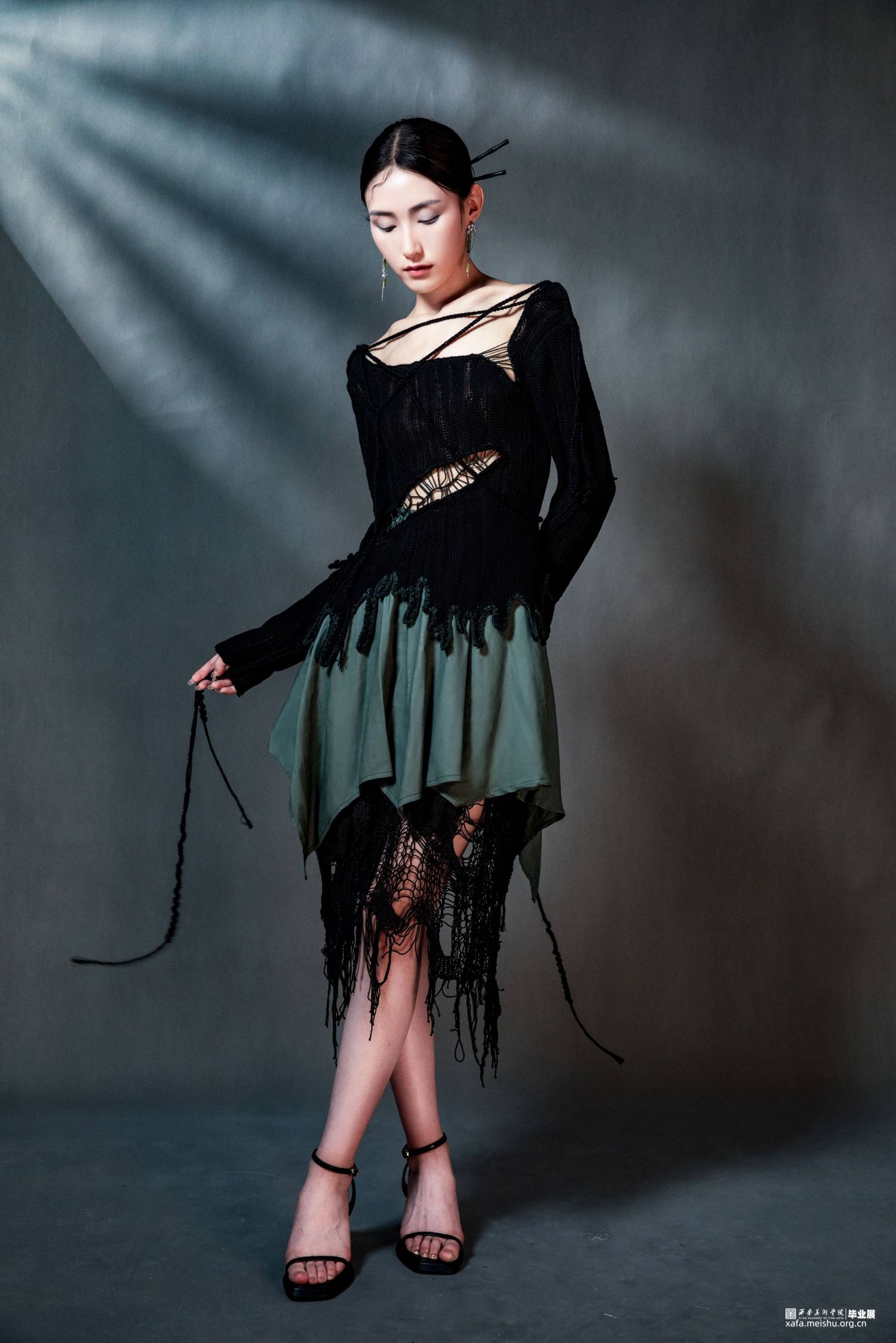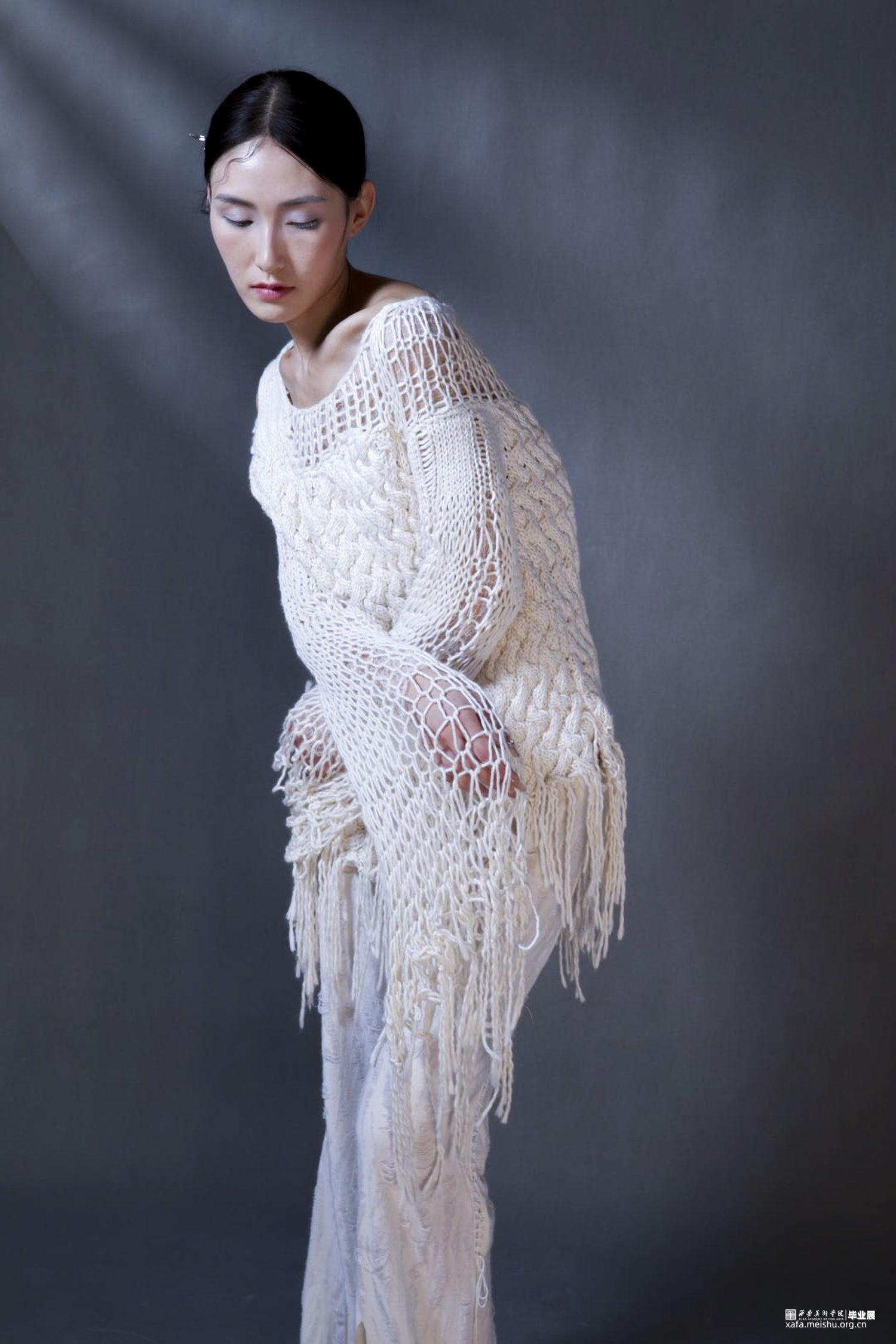 通过微观感受植物组织细胞结构为灵感进行设计,以华州竹编编织工艺为依托,色彩多以低饱和的灰色调性为主,廓形选用不对称解构设计,选择纯手工编织面料进行设计,不规则网眼形式的镂空,加上飘带、流苏等设计元素,增加设计的层次效果,设计整体调性为舒适自然,希望穿着者能够回归身处自然、自由随性的本我状态。