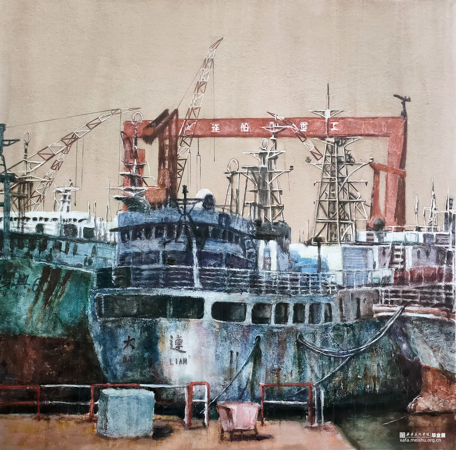 水蚀的斑驳是远航归来的痕迹,也是中国工业的坚韧和沉淀;驻港的休整是船员难得的歇息,也是中国海运的安全和责任。货船在大连停靠,货物在全国流通,航路在世界开拓。整装待发的货船展现了中国海运的蓬勃发展,更是对工匠精神的致敬。水彩笔触描绘出时光痕迹,货船满载希望等待着下一次的远航。在大连港湾,中国海运的脉搏跳动,传递着中国梦的永恒价值。