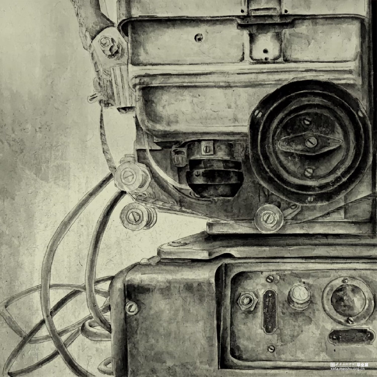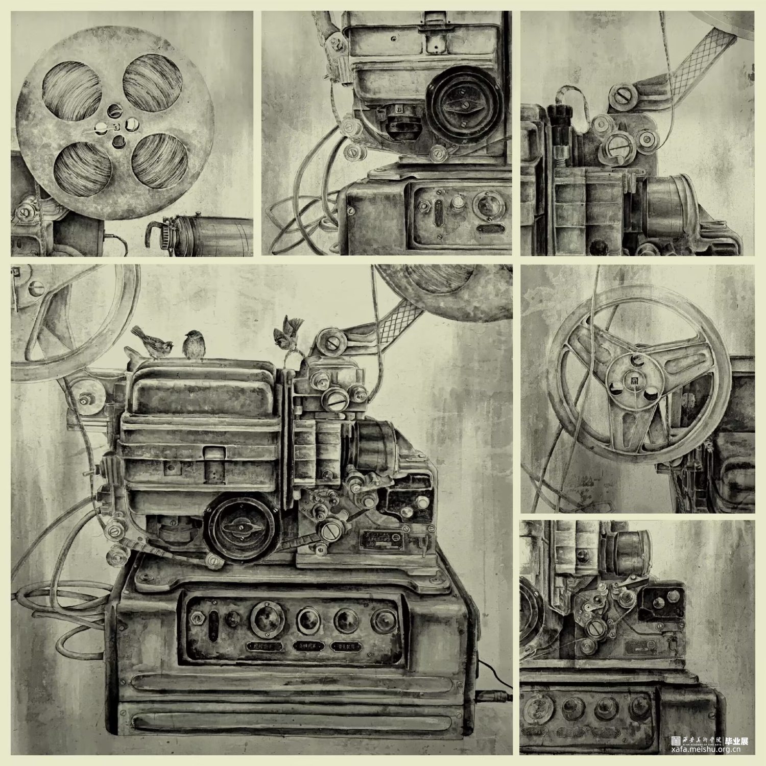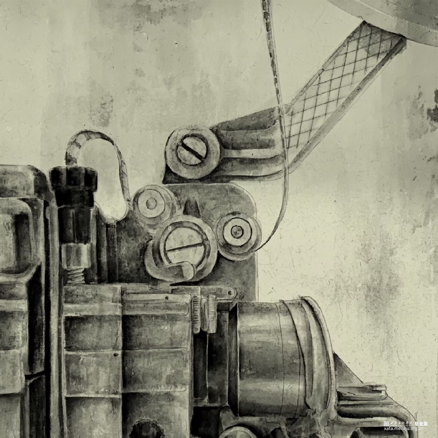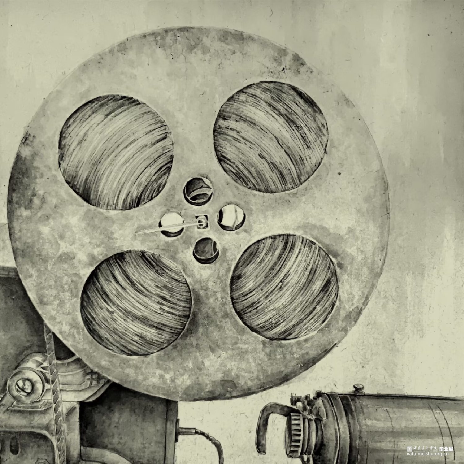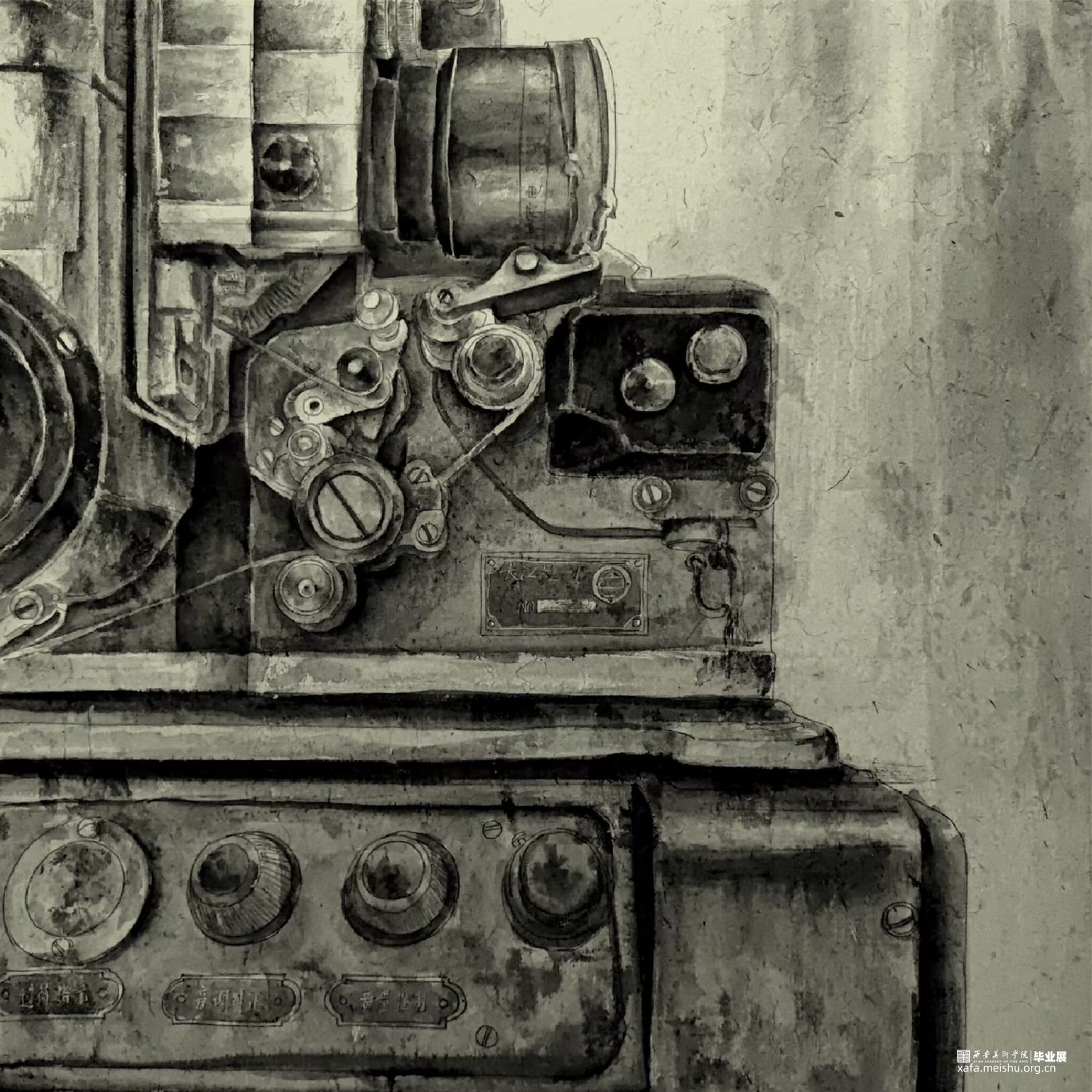 2023年金秋,我跟随学校去建川博物馆采风,在那里我偶然发现了这一台老式放映机,在《时光机映》这幅作品中,我试图捕捉放映机承载的历史记忆和文化情感,它不仅是影像技术发展的见证,更是新中国奋斗历程中的一抹温暖回忆。每一幅画作都透过水墨皴擦的韵律和层次,传递出岁月的静美与流逝,唤起人们对那段光影时光的深刻记忆。