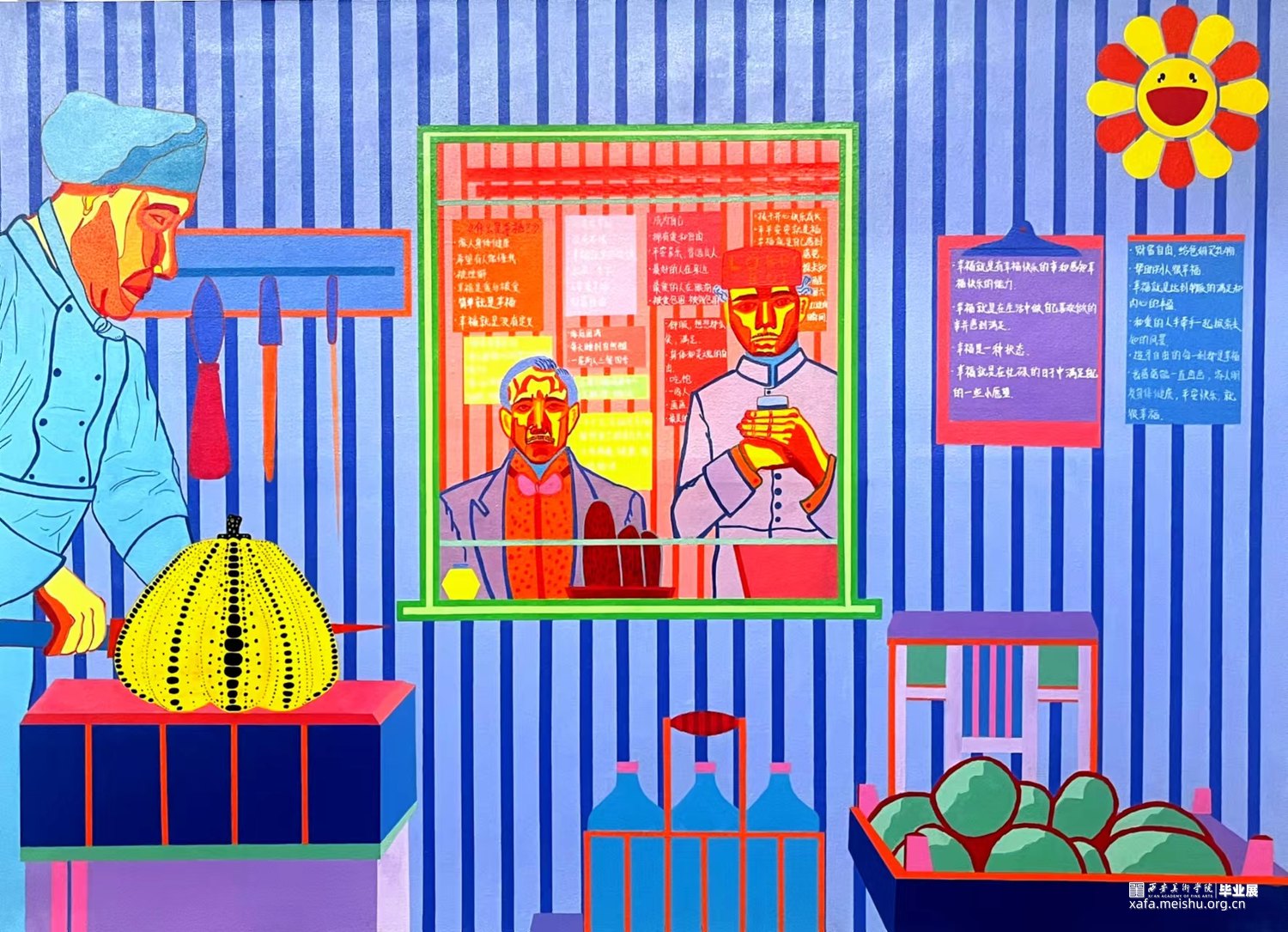 什么是幸福?这是一个从古至今都有的问题,或许每个人的感受都不一样,每个人对他的定义也都不一样,但幸福往往经常伴随着我们。如何看待幸福?如何幸福?当你感到悲伤时,或许回头幸福就在我们身边。该作品以《布达佩斯大饭店》为原型进行二次创作,其中加入了新波普艺术领军人物草间弥生的波点南瓜和村上隆太阳花,用高明度的色彩以及很强的色彩对比,将什么是幸福?这一主题表现出来。