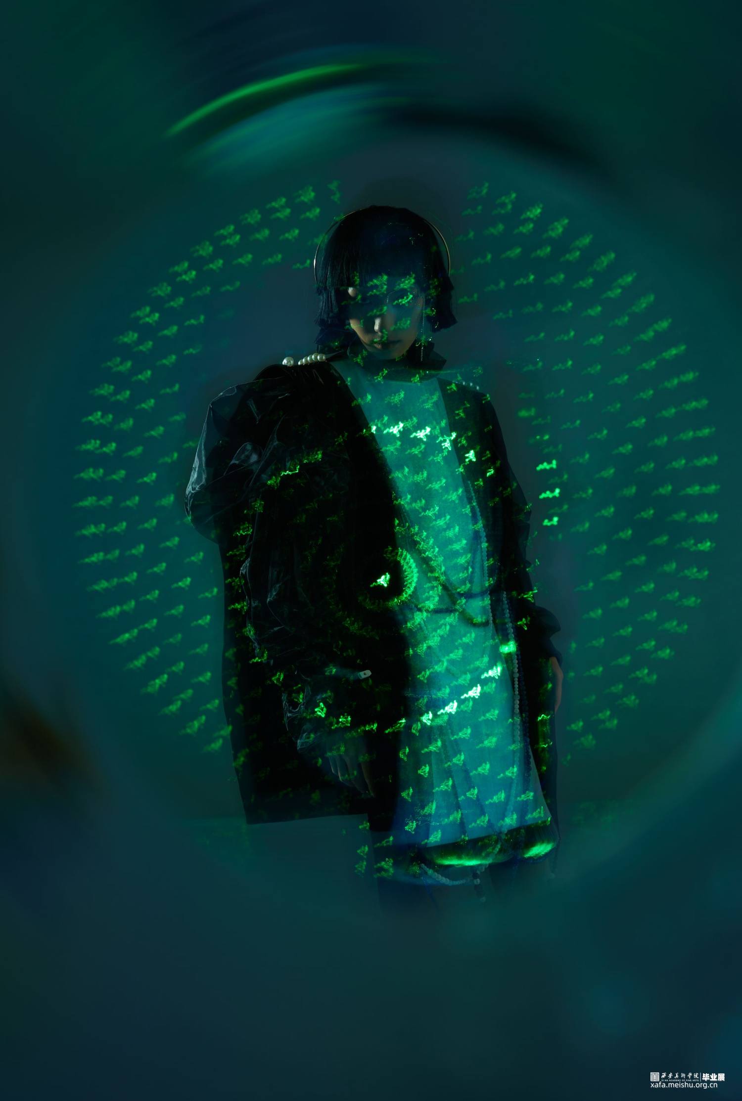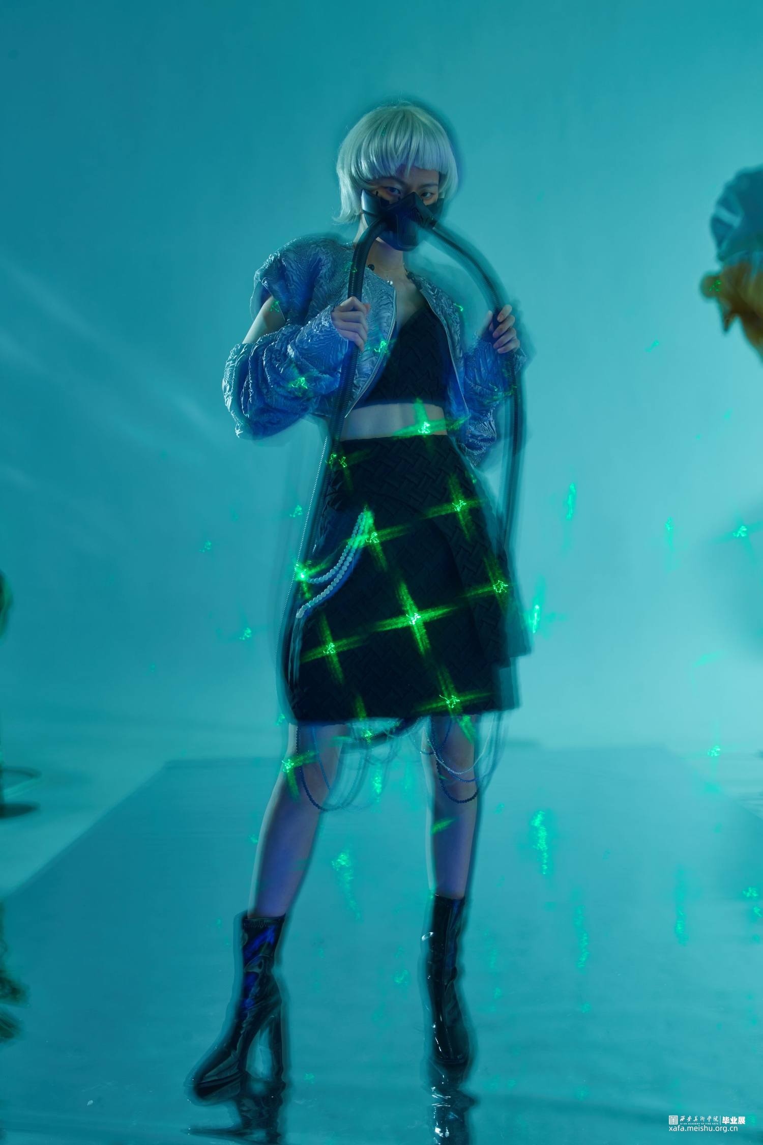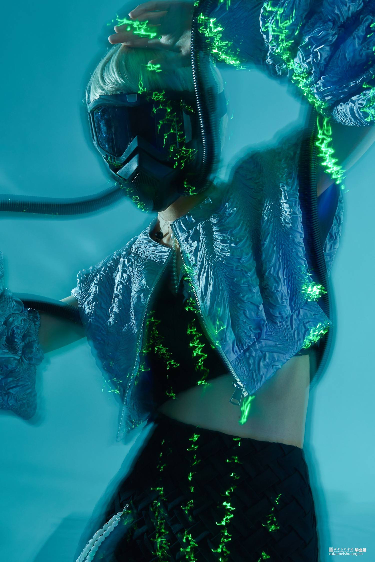 本系列作品《衍生》主题为对未来科技与进化的结合。对于身体表面的触觉,有着时尚带有社会性的意义以及一定的记号性。衣服理想化,不再只是蔽体的作用,更多是身体的时尚。时尚激发着人们对新的东西,别的东西的欲望,而在同时又不断的推翻自己已经完美铸造的模型。作品以“衍生”的探索为切题,为传达前卫,对未来的美好期待来展现服装理念。对知识的探索。知道的越多,越渺小。对于身体表面的触觉,有着时尚带有社会性的意义以及一定的记号性。衣服理想化,不再只是蔽体的作用,更多是身体的时尚。罗兰-巴特的《流行体系》中写过:“为了保证其无秩序的发展,时尚往往存有一种秩序。”时尚激发着人们对新的东西,别的东西的欲望,而在同时又不断的推翻自己已经完美铸造的模型。作品以“衍生”的探索为切题,为传达前卫,对未来的美好期待来展现服装理念。廓形上采用的是A型和X型,简化解构的同时整体给人一种干净利落的感觉,干练为此次设计的廓形主旨。面料采用光纤面料,将科技元素进行最大化展现,配以LED辅助,同时采用面改设计师面料,进行加工设计。本次设计中主要以功能性为目的,加入科技元素,如光纤面料,LED灯带等科技产物,结合镂空形态平衡环型做出最终形态。