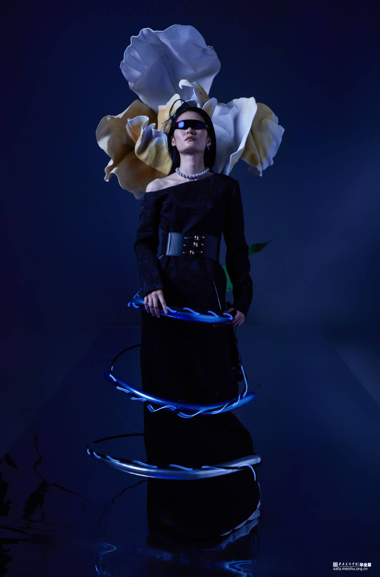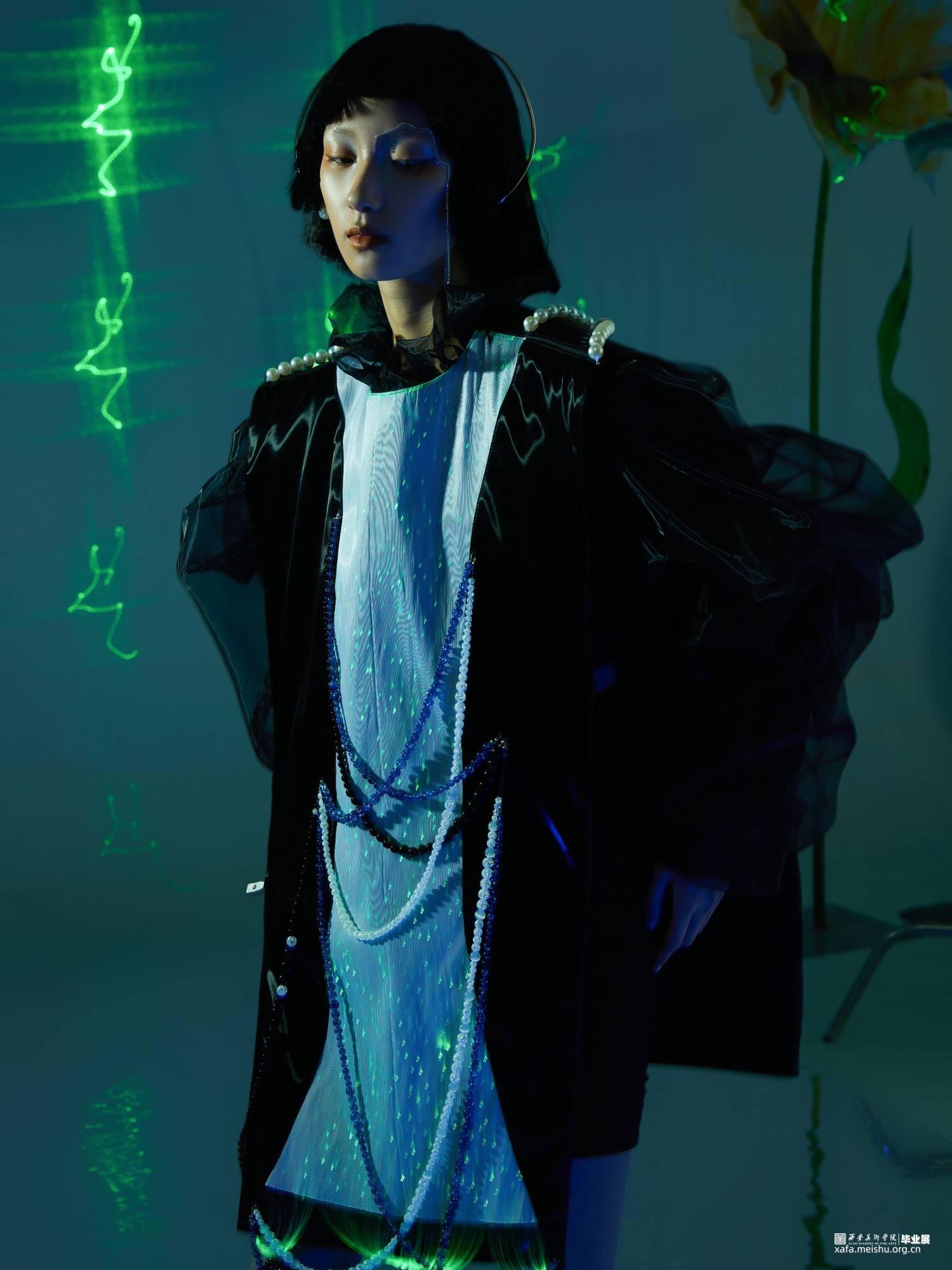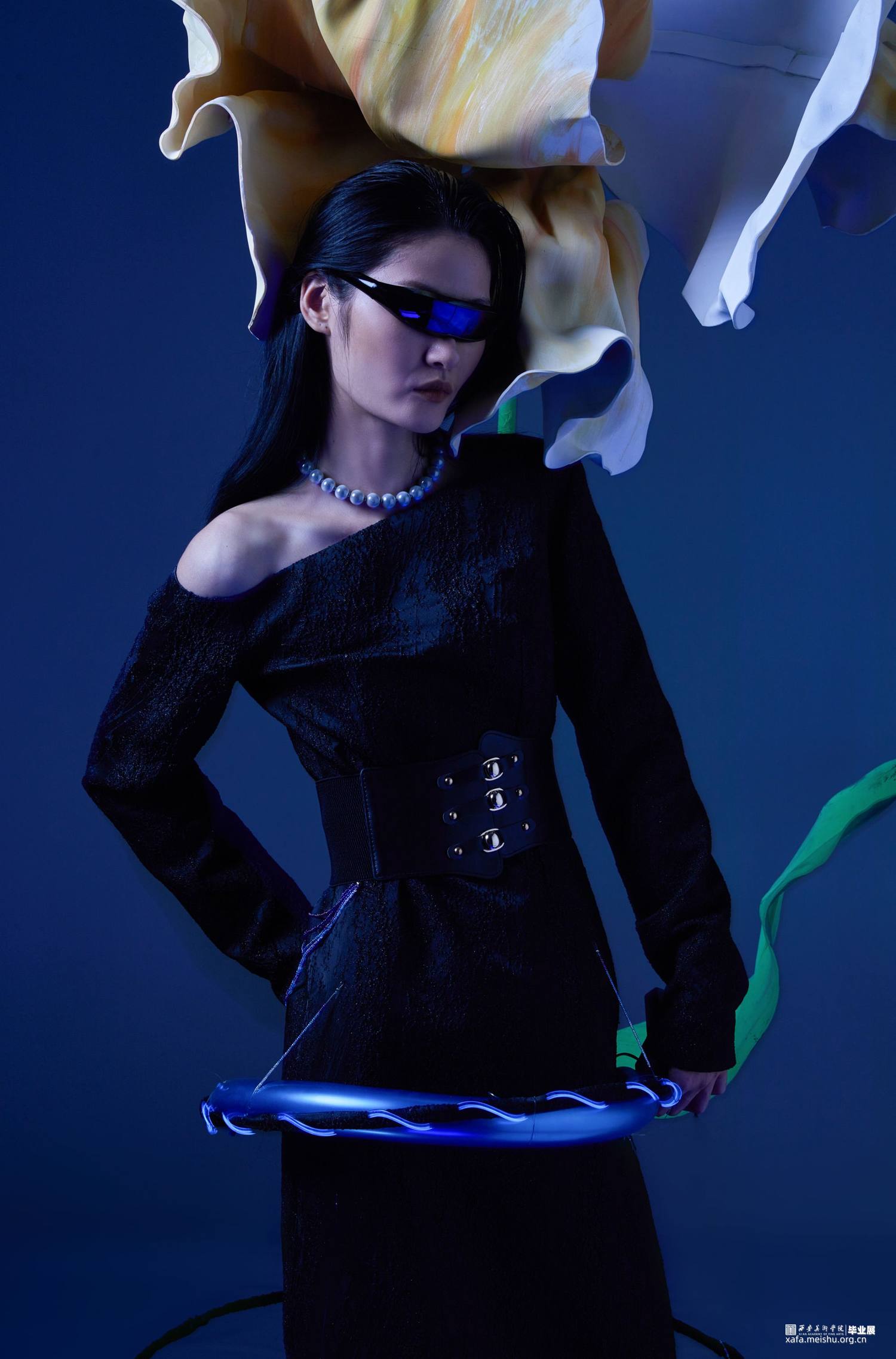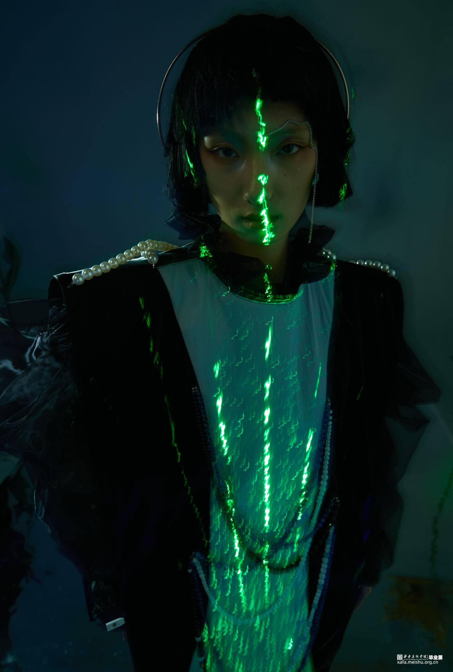 本系列作品《衍生》主题为对未来科技与进化的结合。对于身体表面的触觉,有着时尚带有社会性的意义以及一定的记号性。衣服理想化,不再只是蔽体的作用,更多是身体的时尚。时尚激发着人们对新的东西,别的东西的欲望,而在同时又不断的推翻自己已经完美铸造的模型。作品以“衍生”的探索为切题,为传达前卫,对未来的美好期待来展现服装理念。对知识的探索。知道的越多,越渺小。对于身体表面的触觉,有着时尚带有社会性的意义以及一定的记号性。衣服理想化,不再只是蔽体的作用,更多是身体的时尚。罗兰-巴特的《流行体系》中写过:“为了保证其无秩序的发展,时尚往往存有一种秩序。”时尚激发着人们对新的东西,别的东西的欲望,而在同时又不断的推翻自己已经完美铸造的模型。作品以“衍生”的探索为切题,为传达前卫,对未来的美好期待来展现服装理念。廓形上采用的是A型和X型,简化解构的同时整体给人一种干净利落的感觉,干练为此次设计的廓形主旨。面料采用光纤面料,将科技元素进行最大化展现,配以LED辅助,同时采用面改设计师面料,进行加工设计。本次设计中主要以功能性为目的,加入科技元素,如光纤面料,LED灯带等科技产物,结合镂空形态平衡环型做出最终形态。