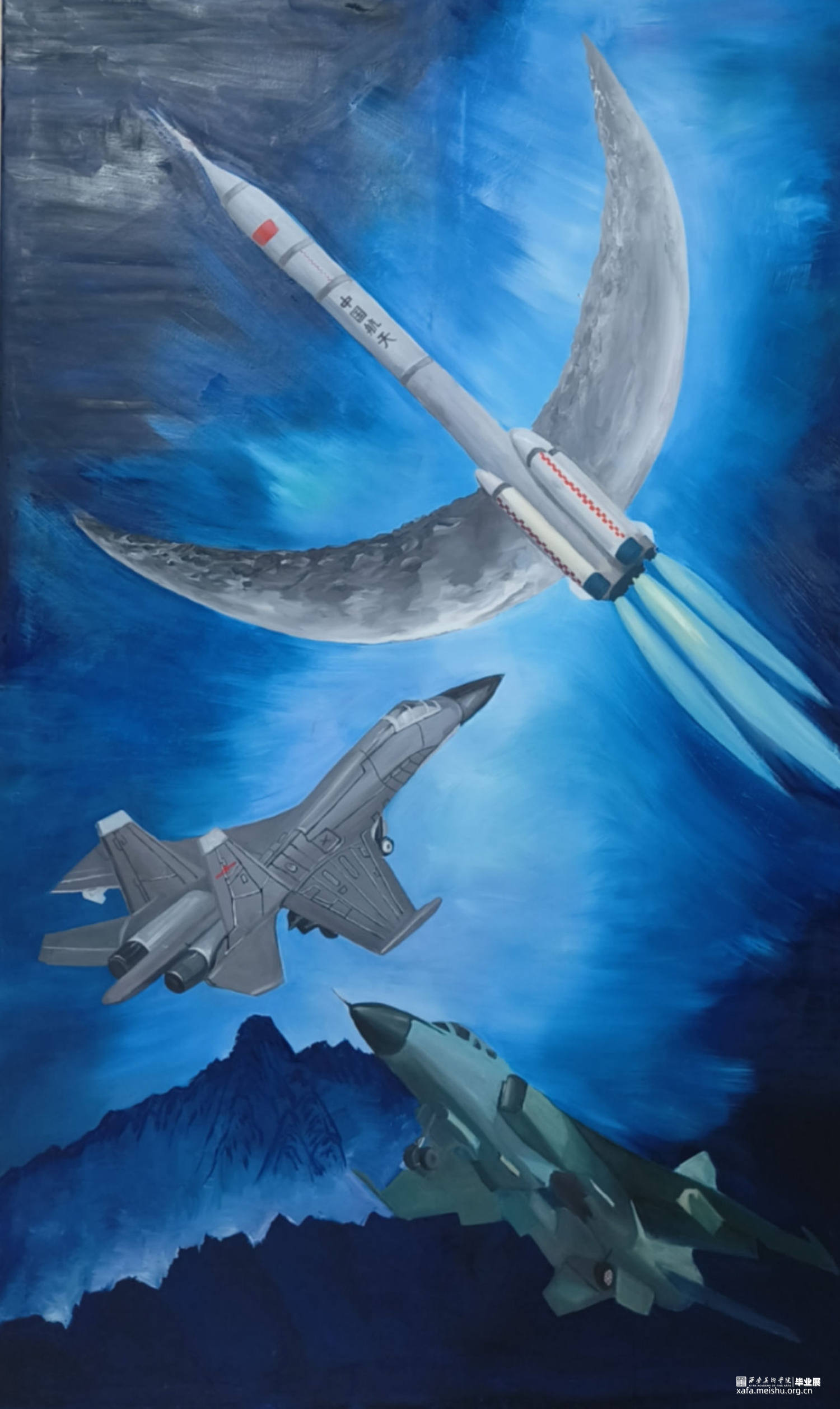 创作出一幅具有创新性和视觉冲击力的油画作品,表现对国家航空航天事业和人民的崇高敬意,