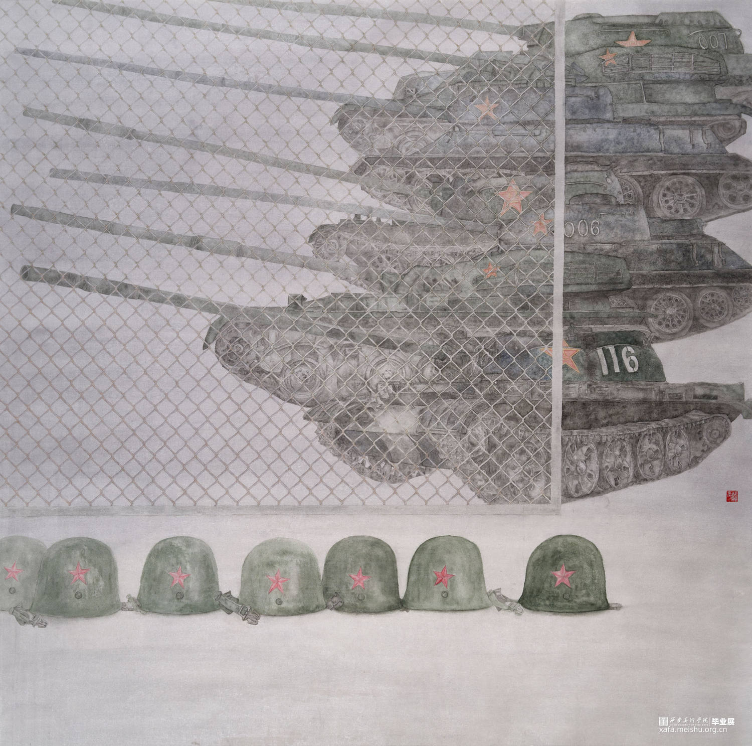 作品《山河已无恙》构思源于建川博物馆,通过对其参观和探索,展馆内一件件兵器映入眼帘,深受震撼,使我触动并支撑我完成画作。它是对过往岁月的缅怀,对英雄战士的崇拜,愿国无战争,和平繁荣!