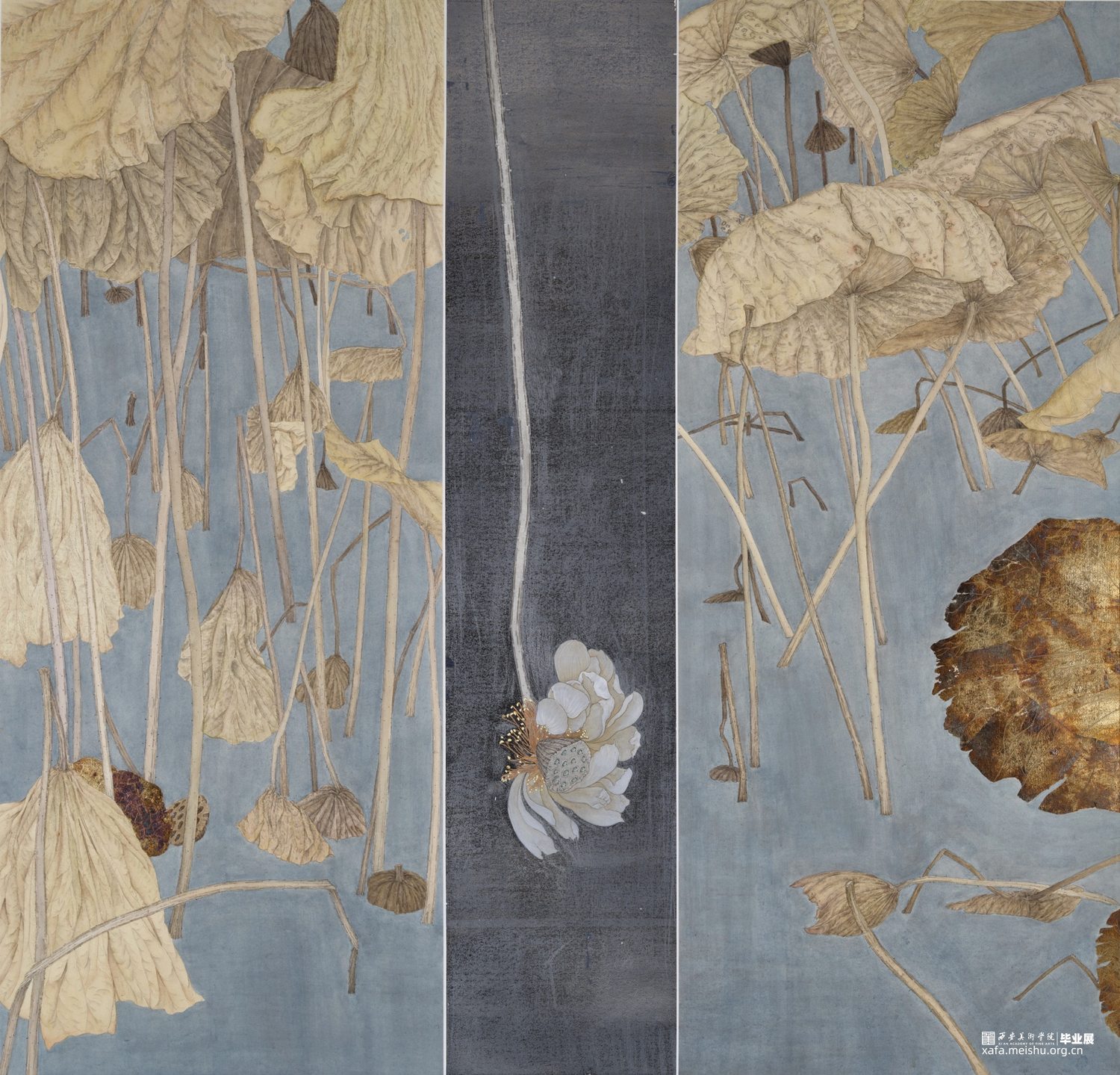 在这幅画作的创作过程中,作者大胆而新颖的手法将传统的国画技巧与现代材料完美结合。细腻的传统国画颜料为主,色彩鲜明,层次丰富;辅助的新岩材料则赋予了画面一种独特的质感和触感,让人联想到大自然的原始风貌。此外,为了增加画面的层次感和视觉冲击力,作者特别选用了铝箔和烧制铜箔进行点缀,这些金属元素的加入,不仅增强了作品的现代感,也为传统绘画带来了新的生命力。整体来看,画面的尺寸被精心设计为165×165cm,这是一个既能体现中国画的精细笔法,又能够容纳各种创意元素的适中比例,经过专业装裱后,其实际尺寸达到了185×185cm,展现出更加宏伟的气势,画面分为上三条屏,左右两侧均为枯萎破碎的荷叶,似乎在诉说季节的更迭与自然的无常,中央部分,是一朵倒置的残破的荷花,这朵倒置的荷花,打破了传统的设计规则,以一种新颖独特的方式呈现在世人面前,它不是简单地复制前人的样式,而是赋予了荷花新生命和活力,彰显出作者独到的创意和非凡的技艺,这样的荷花无疑会让人眼前一亮,给人带来耳目一新的视觉享受。在配色上,作者采用了清新大胆又不失雅致的色调,蓝色和黄色交织出属于夏末荷塘的沉静与萧条。整部作品经过八个月的深思熟虑和不断尝试,不仅仅是对某个季节的致敬,更是一段时光和记忆的凝结。每一片残败的荷叶都蕴含着一个过去的故事,它们仿佛在对我们诉说着夏天结束的最后篇章。