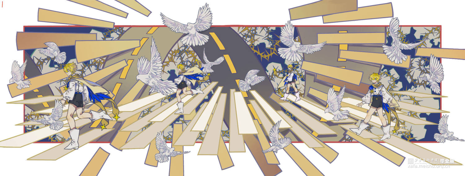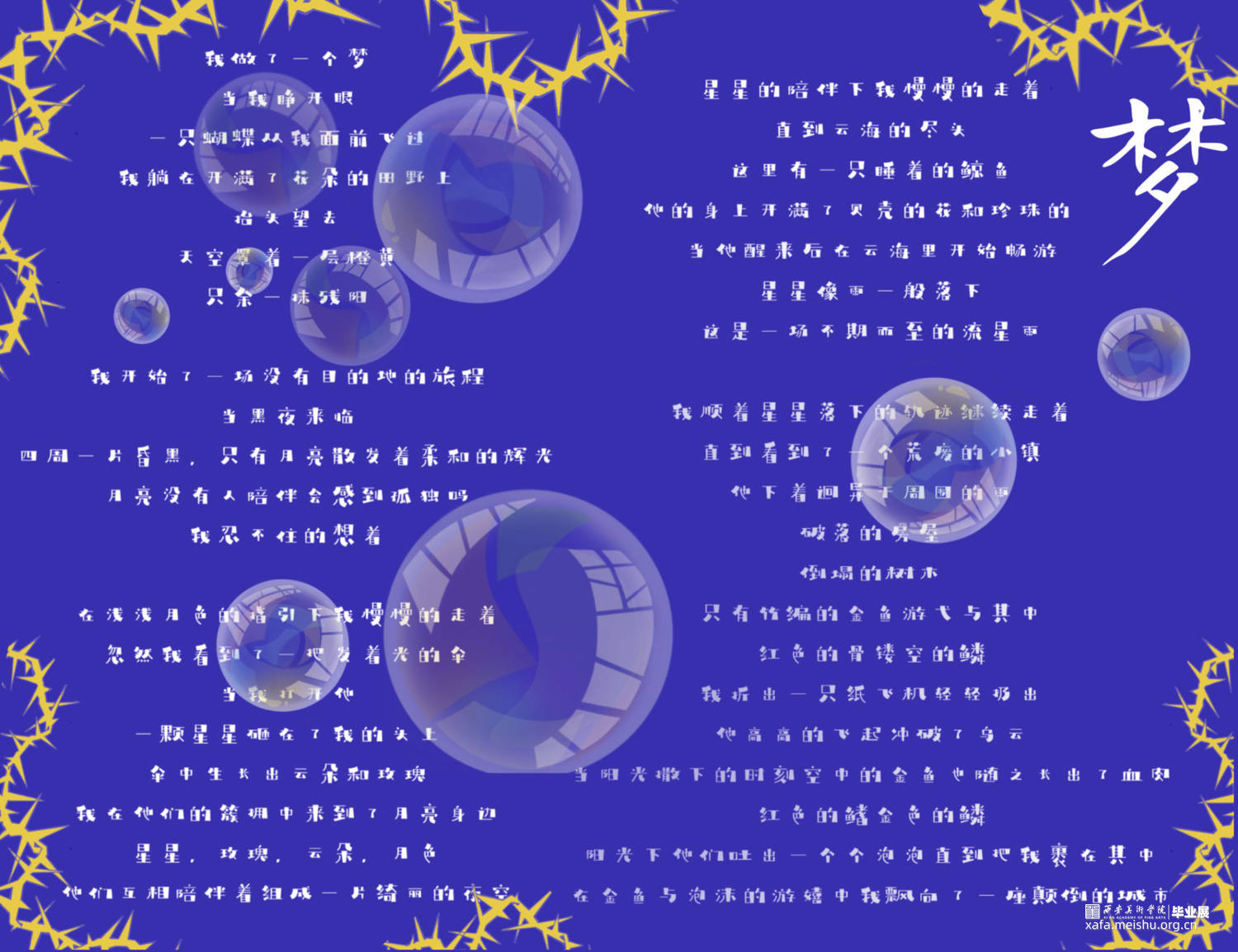 《梦》 我做了一个梦 当我睁开眼 一只蝴蝶从我面前飞过 我躺在开满了花朵的田野上 抬头望去 天空罩着一层橙黄 只余一抹残阳 我开始了一场没有目的地的旅程 当黑夜来临 四周一片昏黑,只有月亮散发着柔和的辉光 月亮没有人陪伴会感到孤独吗 我忍不住的想着 在浅浅月色的指引下我慢慢的走着 忽然我看到了一把发着光的伞 当我打开他 一颗星星砸在了我的头上 伞中生长出云朵和玫瑰 我在他们的簇拥中来到了月亮身边 星星,玫瑰,云朵,月色 他们互相陪伴着组成一片绮丽的夜空