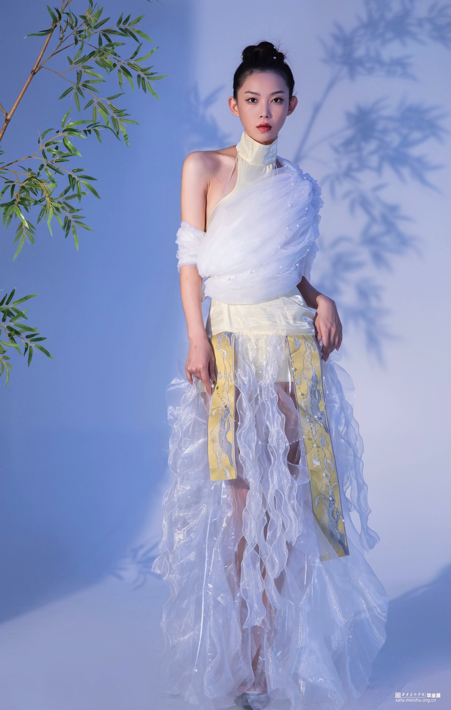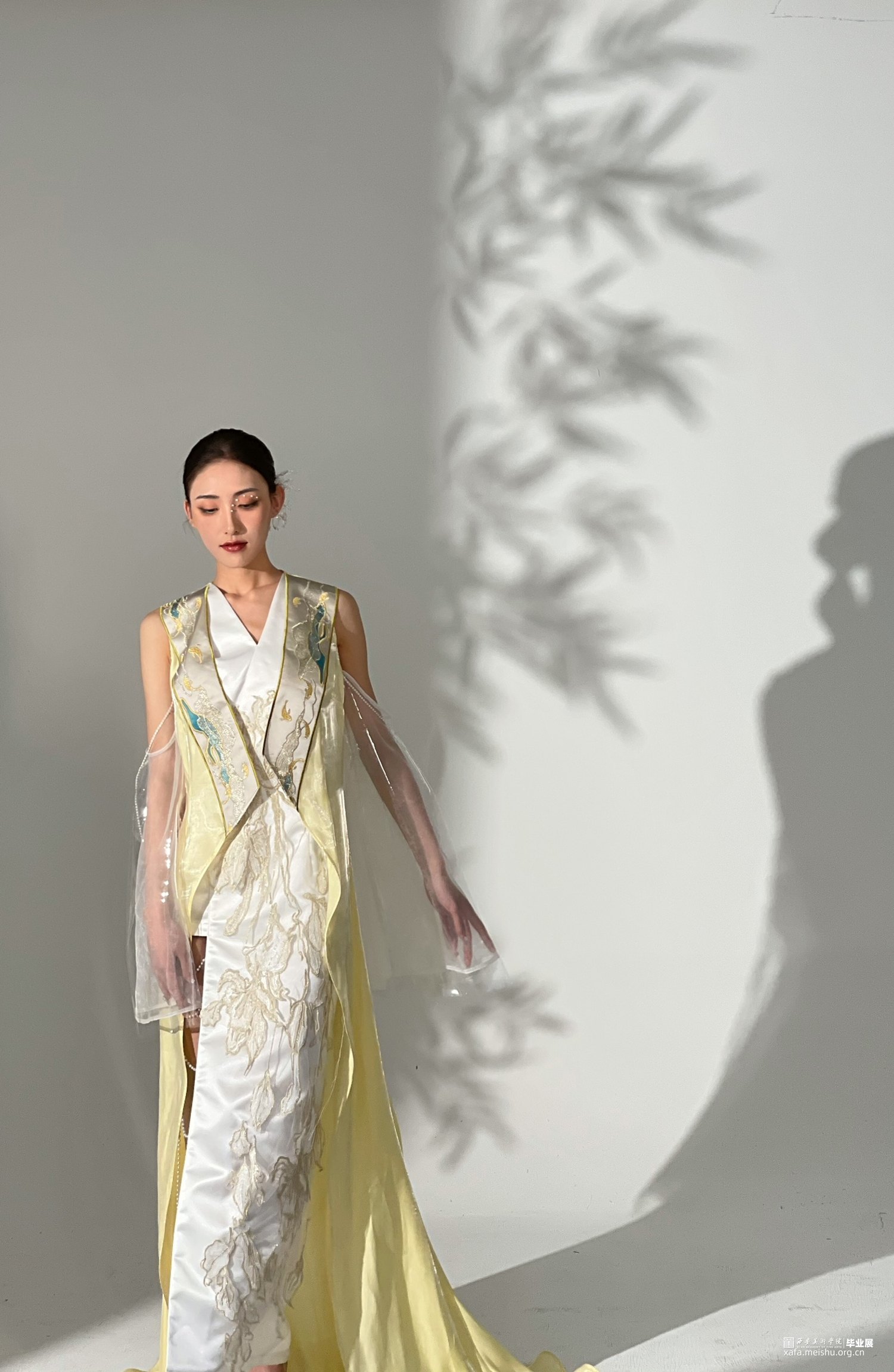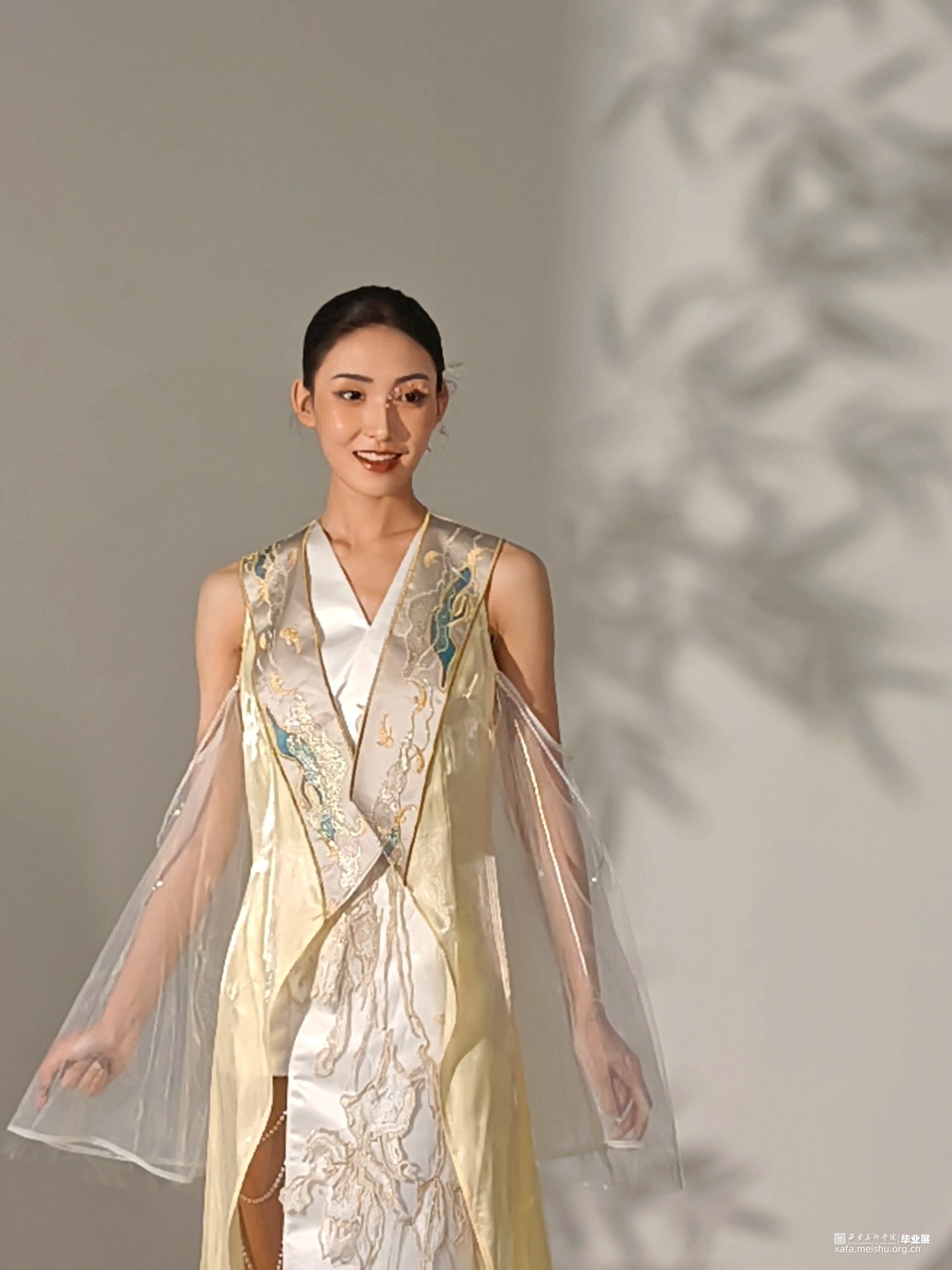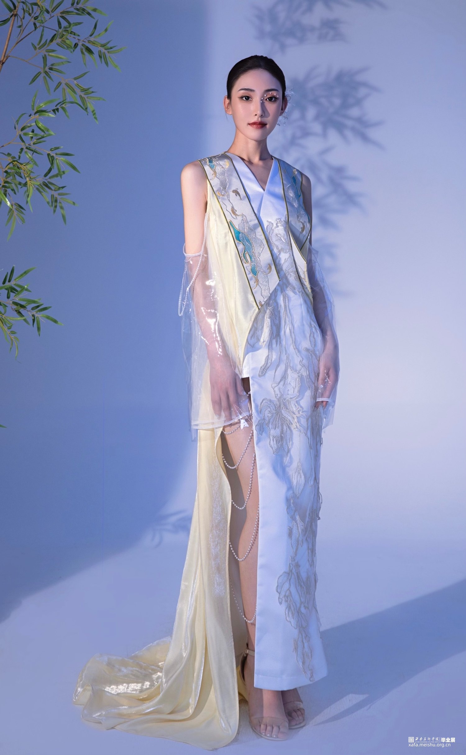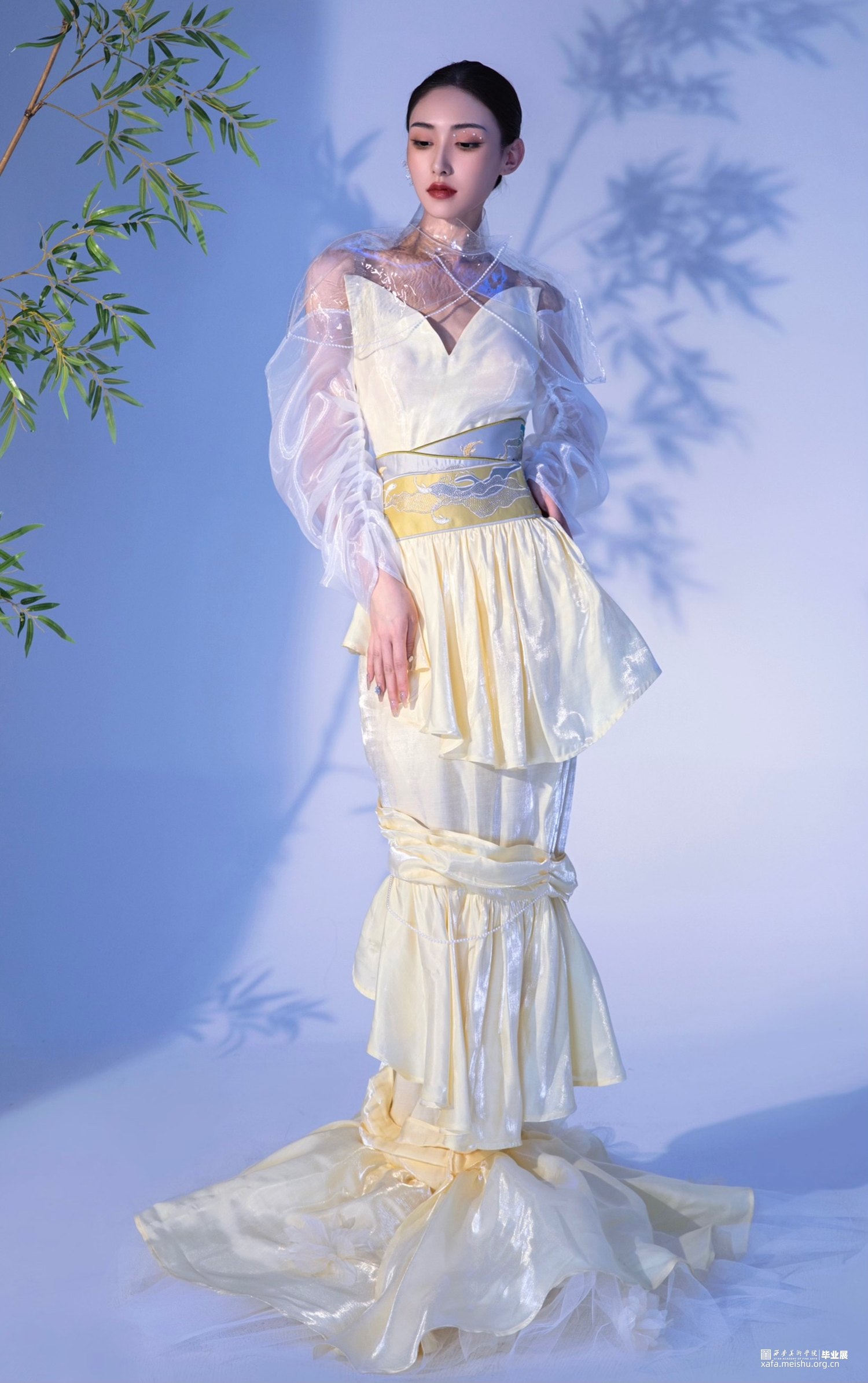我的作品灵感来源于《山海经》里的月神常羲,以新中式的风格创作的这系列礼服,想要描绘一副柔美淡雅的月光伴着竹影斑驳,静谧又温润的月夜美景,让人深深陶醉在美月佳景梦柔乡。
