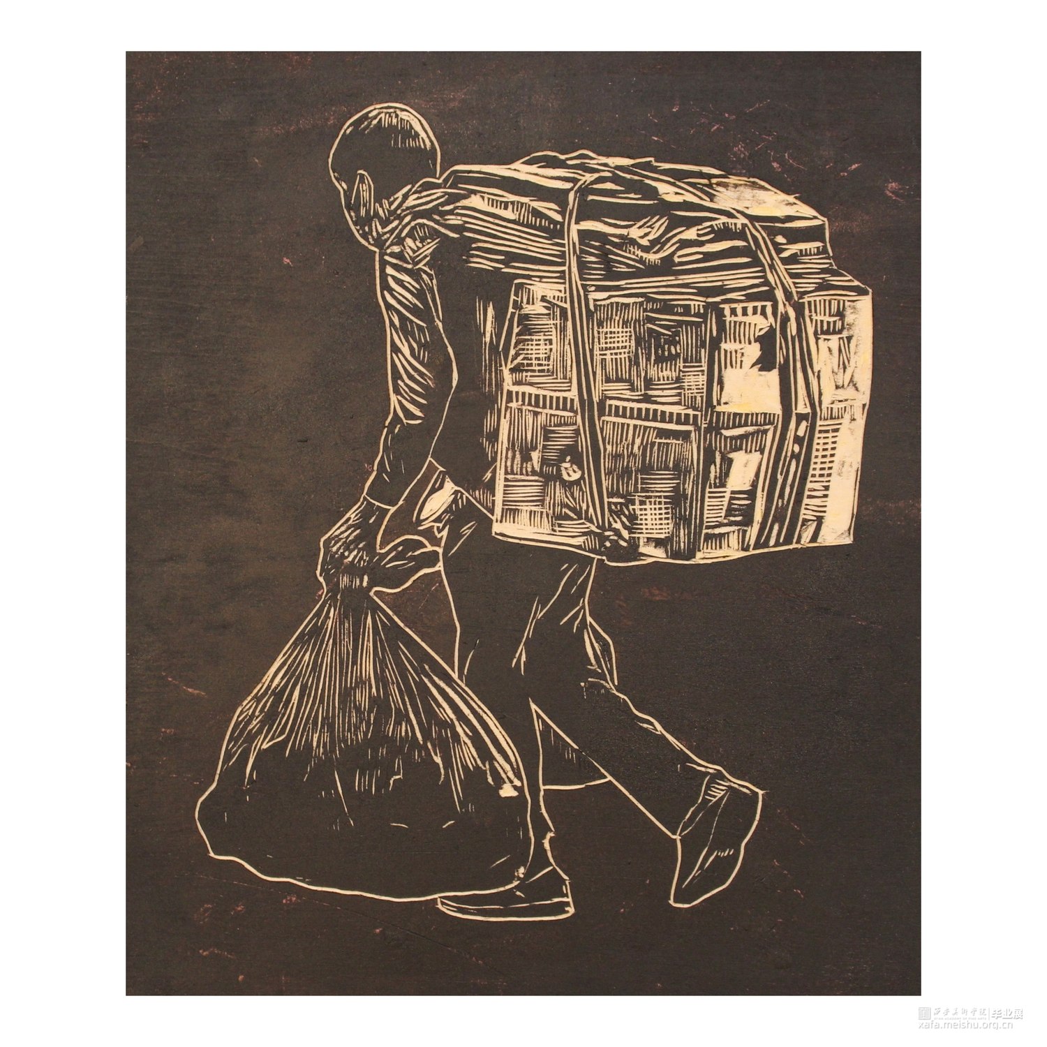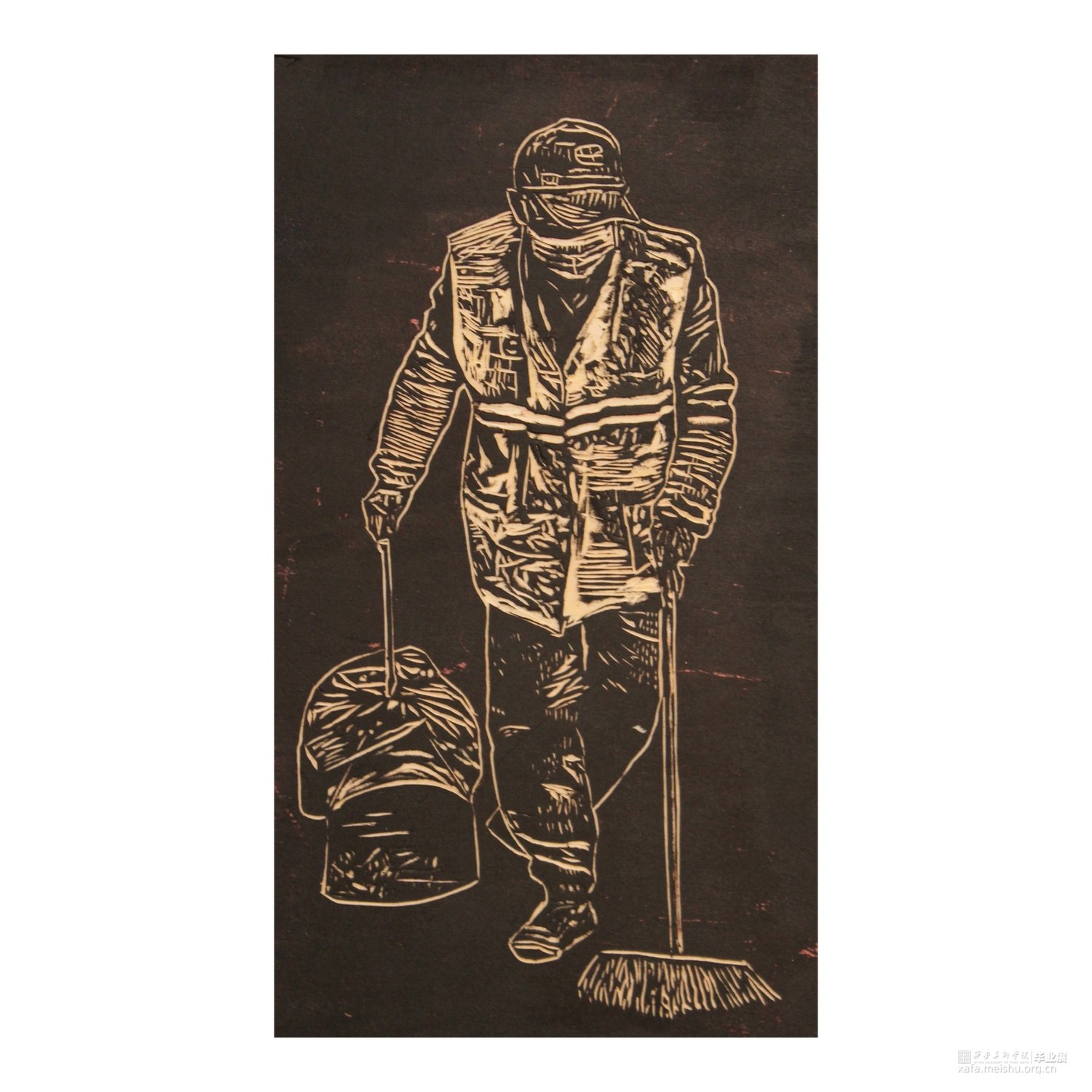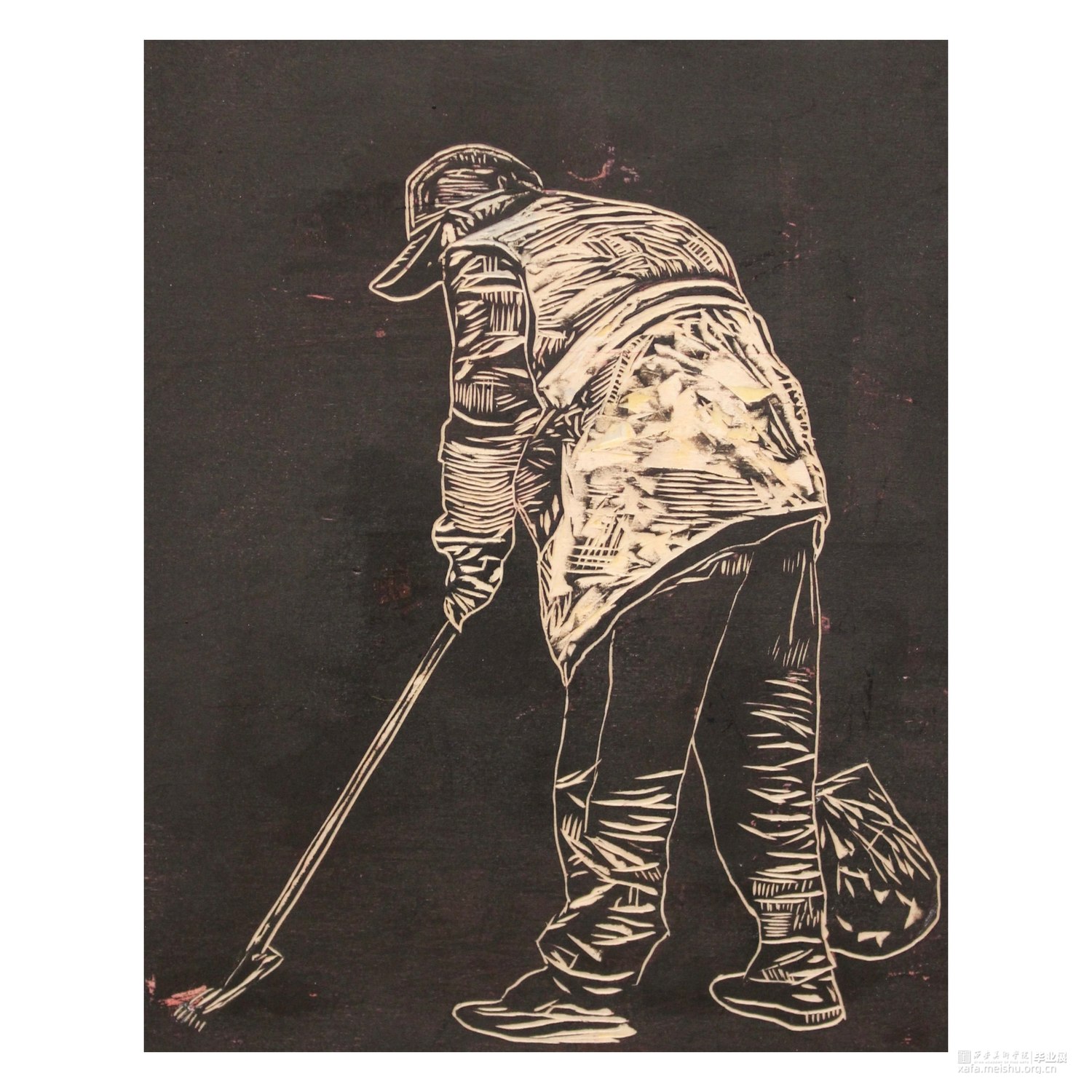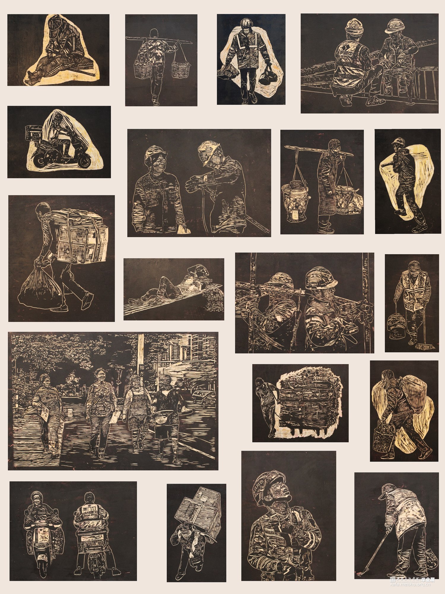 作品为十九幅木刻版画,总尺寸为110×150。作品素材来自于街拍环卫工人、建筑工人、路边商贩等等。