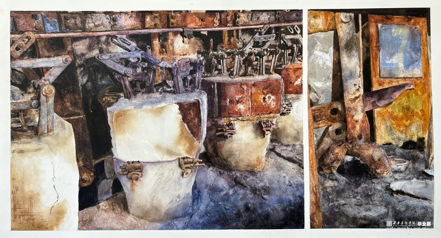 锈迹斑斑昭示着浮沉流落的岁月侵蚀,红锈色层层叠叠,浓淡参差,四处流淌,流逝着曾经的辉煌时代。这是沉寂已久的工业之魂,是年代厚重感的废墟在诉说着过去,倾听着遥远的故事。时代在飞逝,曾经的辉煌工业已然落下帷幕,然事物的消逝也是某种意义上的重生,每一个在过去时光融入人们生活的物象,随着时代的发展,发生了物态表现上的嬗变,以另一种方式存在着。听那里有打铁声,塑料味,一群忙碌无言的人和一堆日夜不休的机器…那时代的列车呼啸而过,带来繁荣,尘土飞扬。