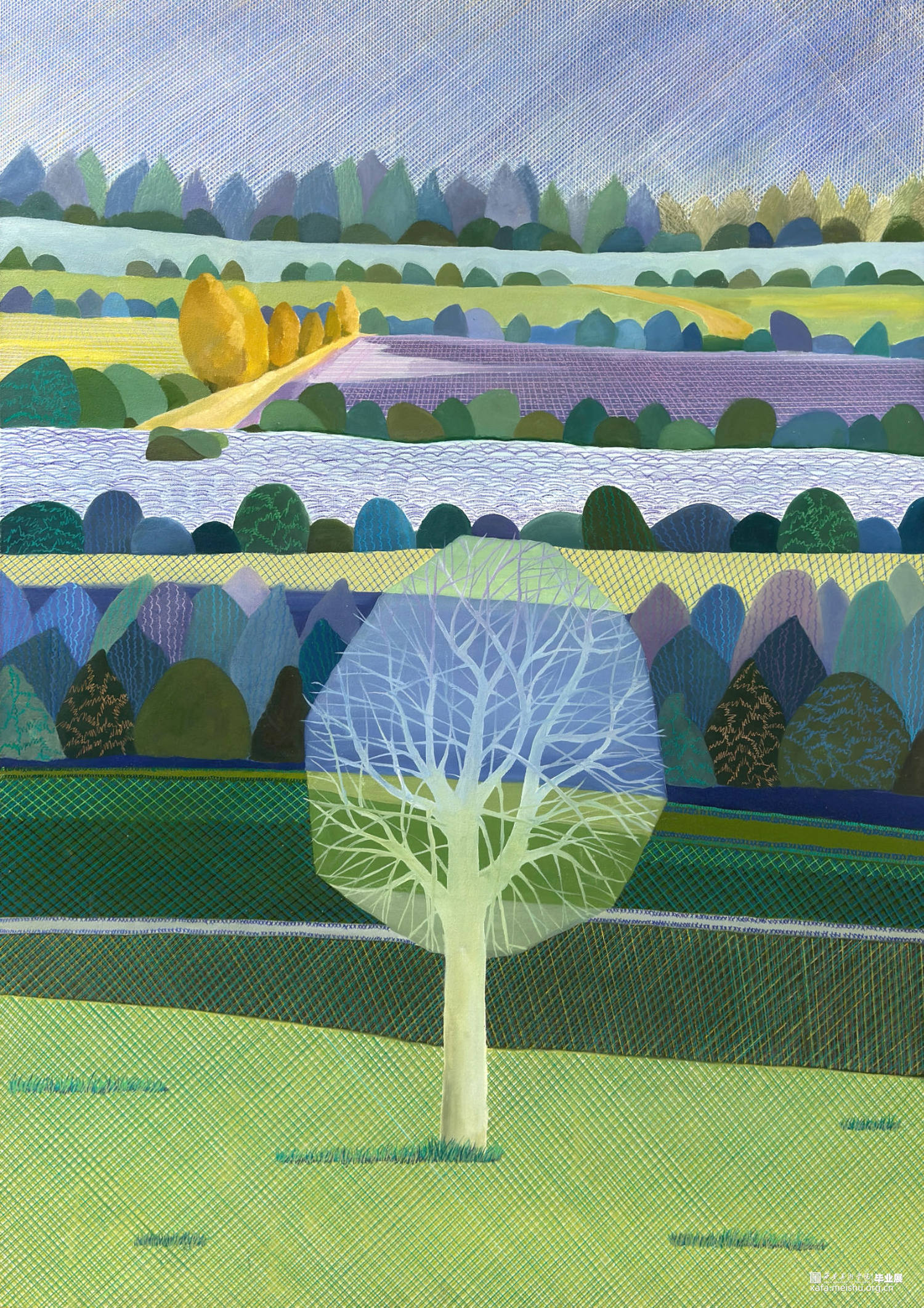 这幅作品源于我对自然的无尽热爱与深深敬畏。在我心中,家乡的风景永远是一幅动人心弦的画卷,山川河流、田野村舍,朴实无华却让人沉醉不已。一群山,一条河,几棵树,几片田,便是我从小看到大的风景。春华秋实,冬雪夏阳,都有不同的韵味,但在我眼里夏天是最独特的,那郁郁葱葱、生机勃勃的绿,美妙的不可方物,只一眼就能感受到生命的美好。《绿的吟唱》希望能够传达出对于自然的热爱和对生命的的敬畏,引发观者对于保护自然,热爱生命的思考,让观者从中找到自己的共鸣和启发。