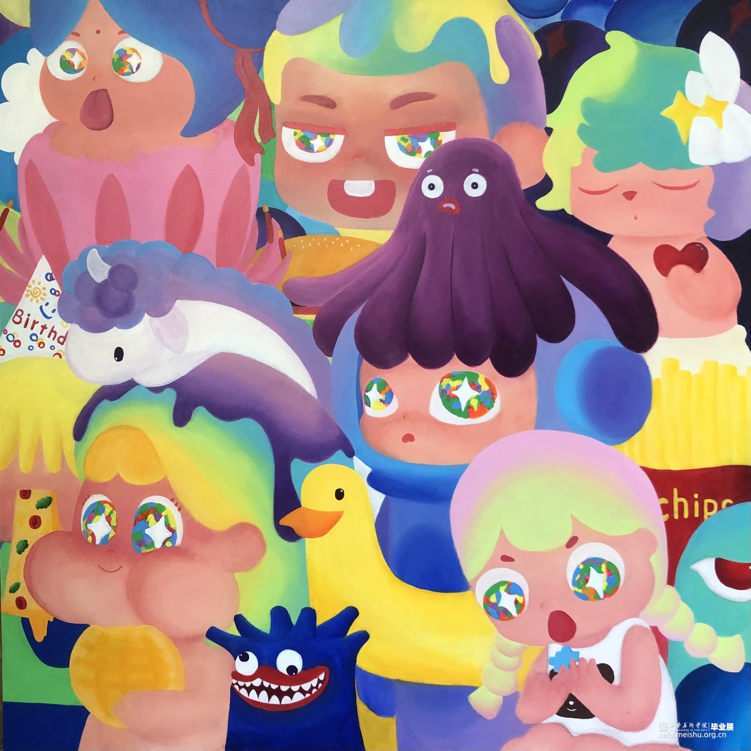 作品呈现了富有童趣的小孩形象的玩具,旨在通过被重新更改了颜色并且形态各不相同的小孩形象的玩具象征着不愿长大的我们,希望我们可以不被现实的颜色所束缚,可以五彩斑斓、充满希望地度过人生漫长岁月,眼里有光,笑对未来。