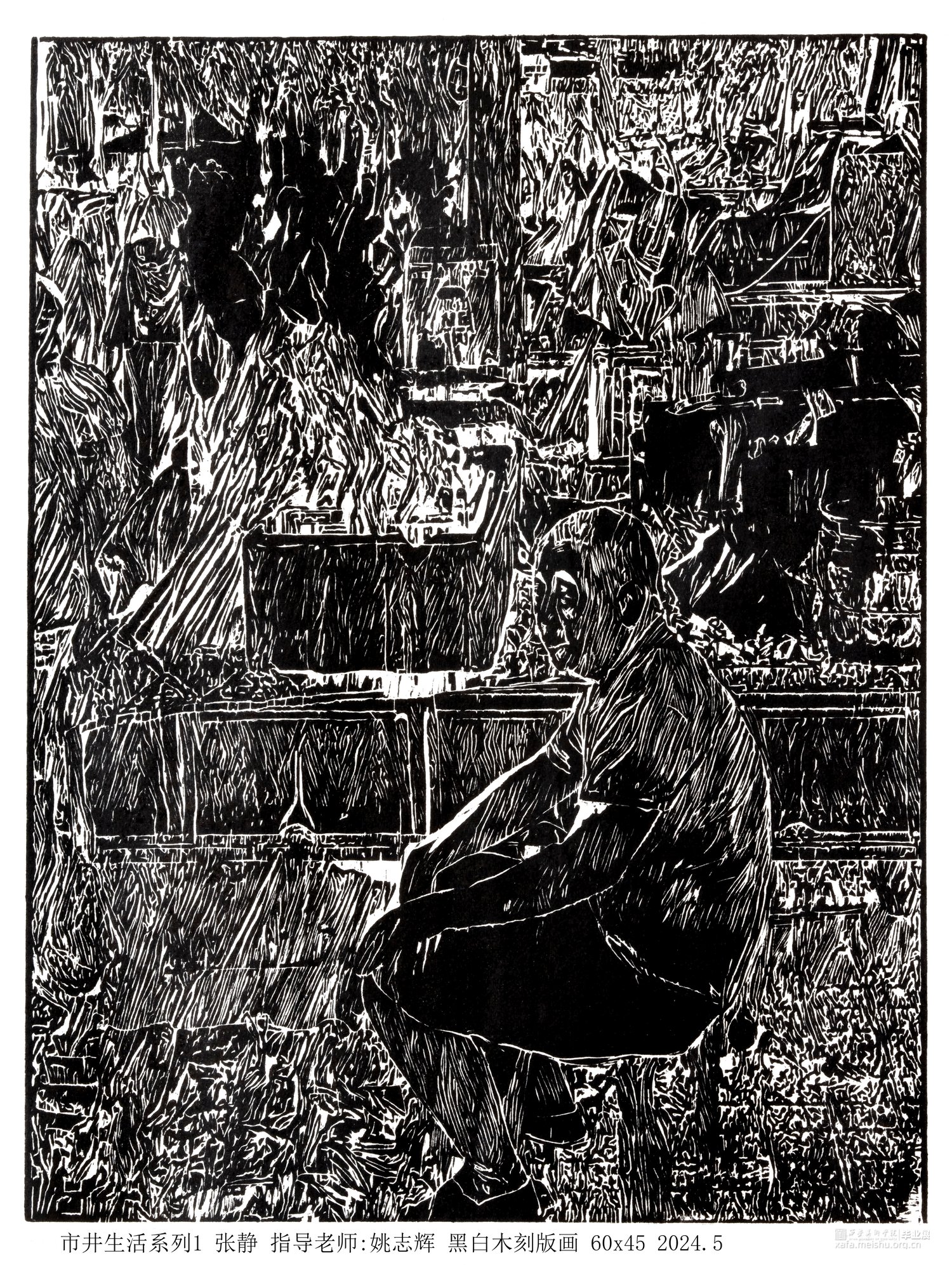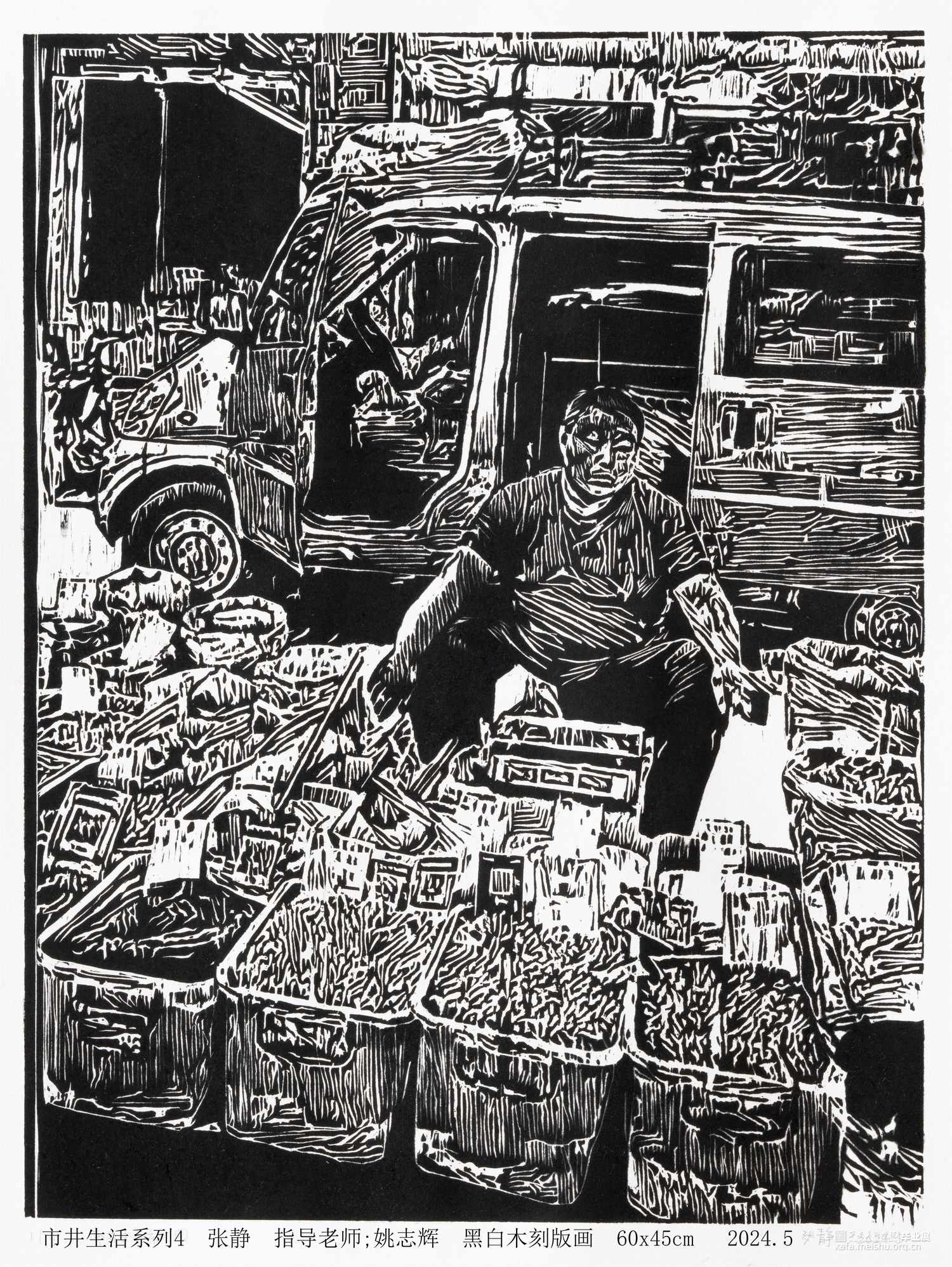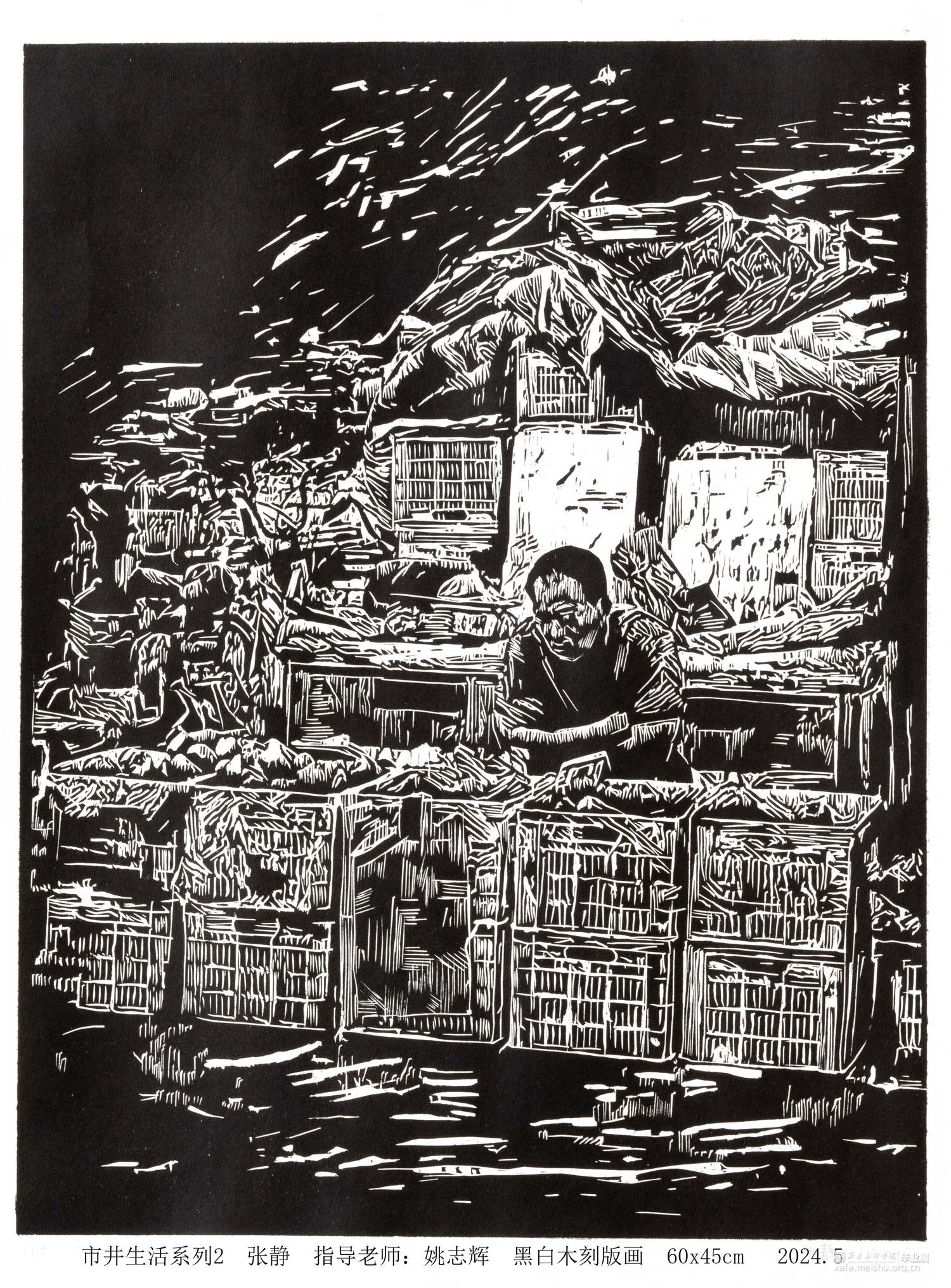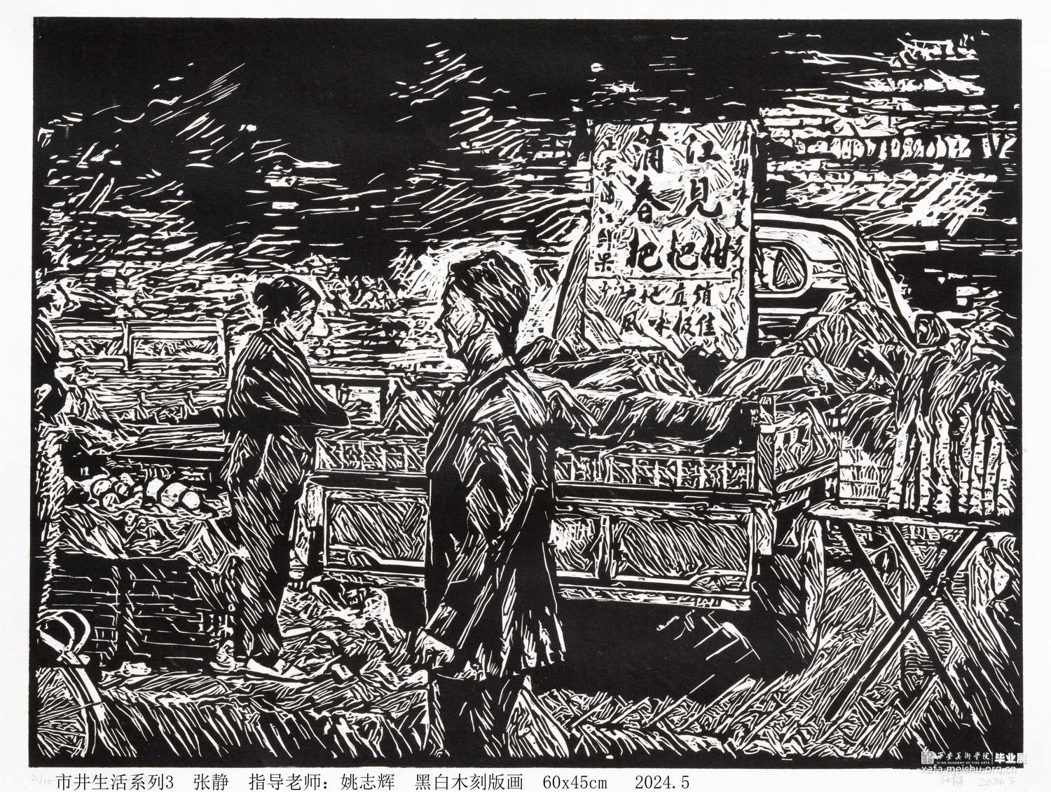 作品描述:《市井生活》系列是以展现市场摊贩和人民日常生活气息的版画作品。市井之中,各色店铺,人潮涌动。摊贩的吆喝声与顾客的讨价还价声交织在一起,每个角落都充满了市井的生机。