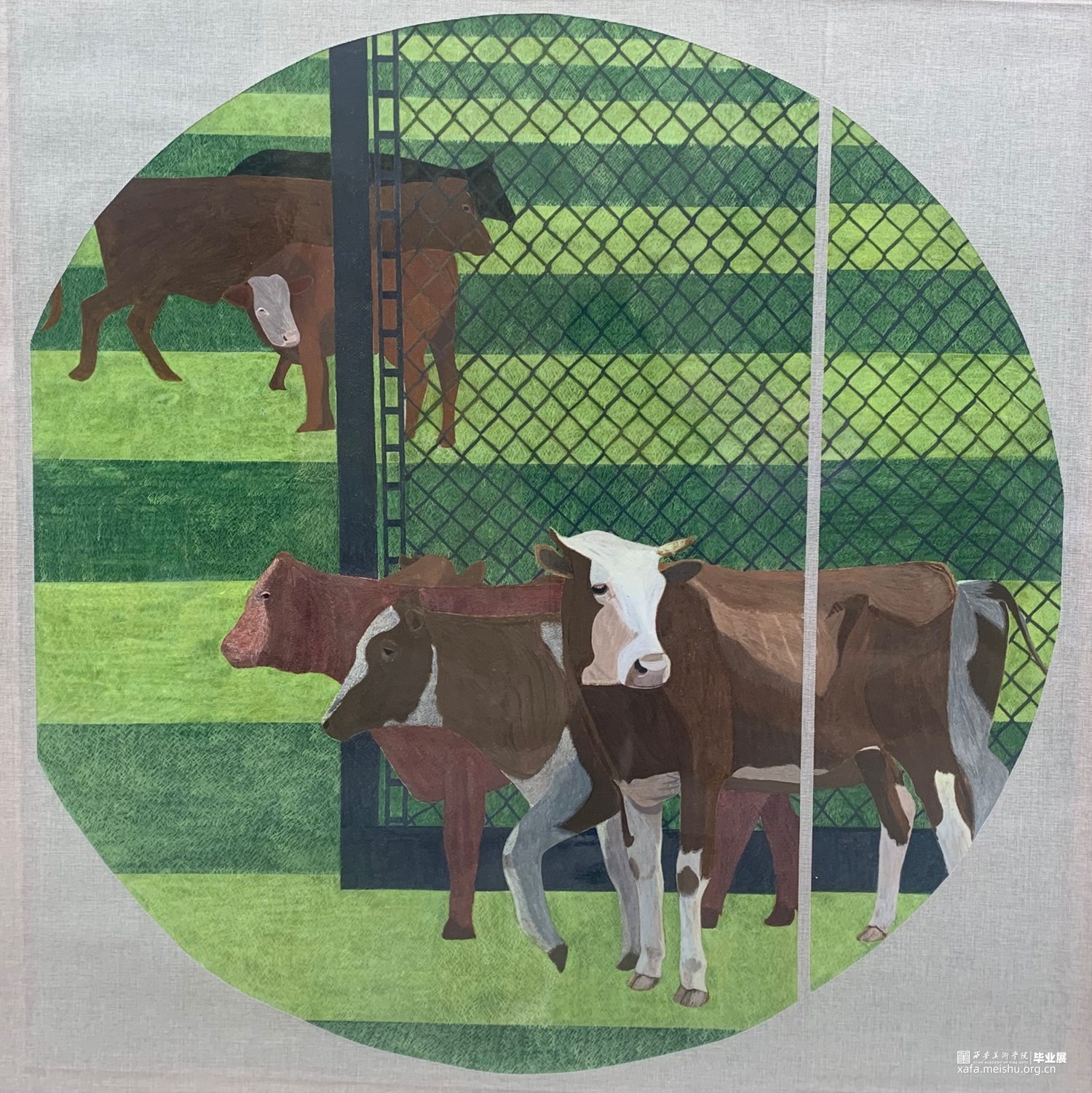《大牢的世界》一指字面意思,牛生活在类似大牢的环境中,二牛的别称“大牢”,牛的世界。牛群生活在了一个人们刻意为它们制造的生活环境,前面的牛貌似已经走出来了,但是它们的后半身却没有出来,它们以为走出来就获得了自由,但是真的自由了吗,第一只牛,往回看,是不是它已经发现了问题呢?这幅画也折射出现实社会之中,难道眼睛所看见的就是真的吗?