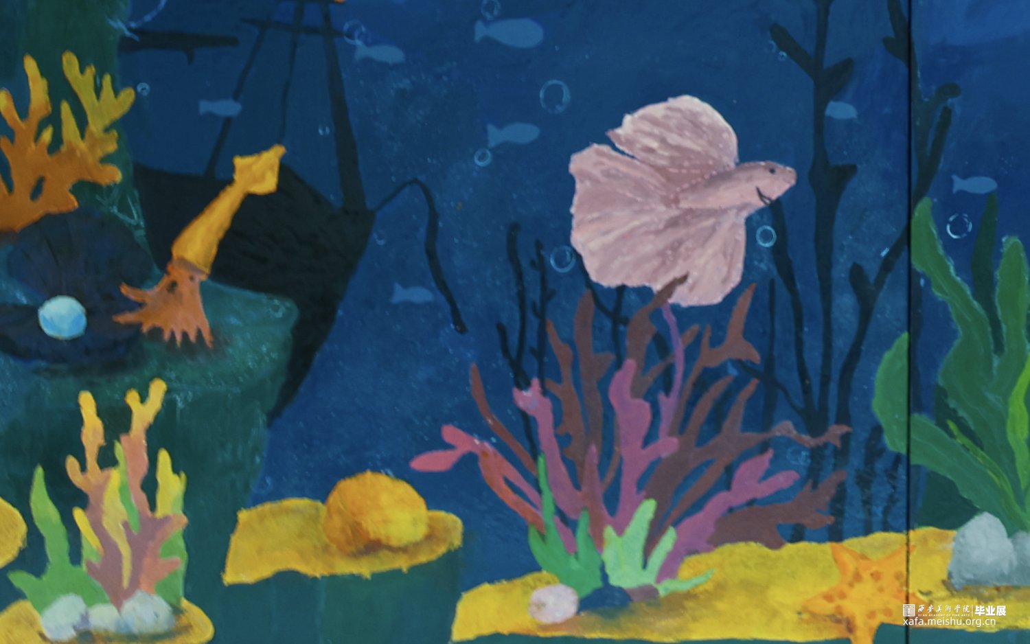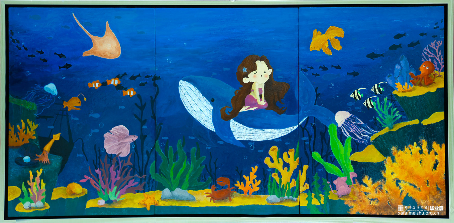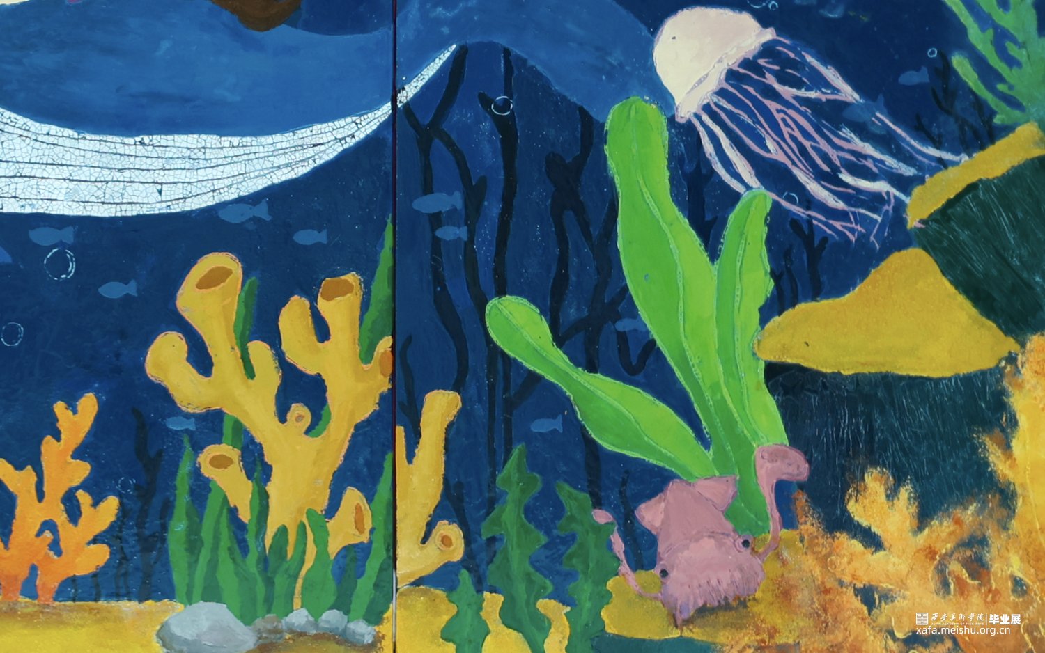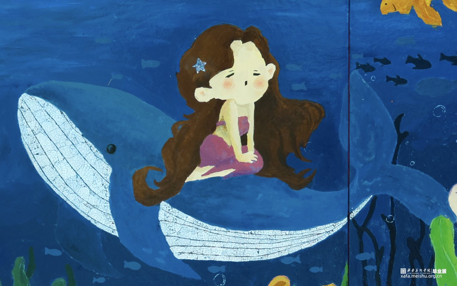每一段人生的开幕都始于童年诗性的幻想。对孩子来说,海底是神秘而富有无限幻想可能的纯真之地,我希望通过作品引领观众梦回童年,因此我选择用漆画的形式和近似儿童画的方式来表达主题。画面中心描绘了一位棕色头发的小美人鱼,这既是纯真核心的表达,也是每一段“我的童年”的映射——小美人鱼的形象与童话中善良、纯洁和美好相联系,是对和谐世界理想的寄托。似梦非醒坐于鲸鱼之上,享受宁静的海底生活,予人以平和、安逸,以及我对童年幻梦的理解和诠释。
