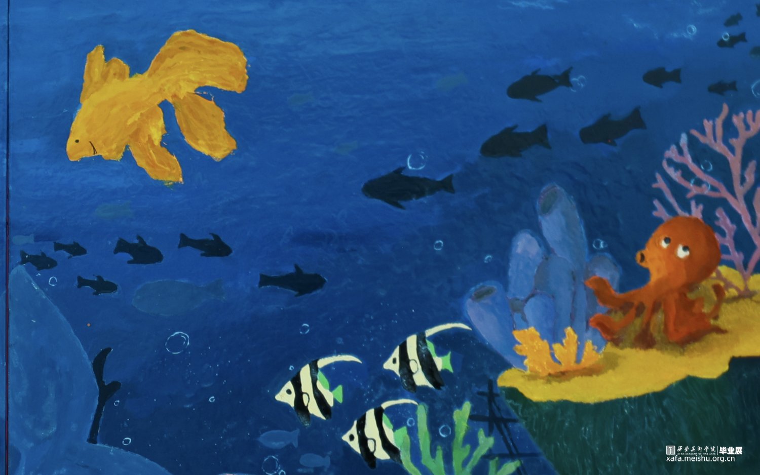周围鱼群和珊瑚礁则增添画面活力。画面中的鱼群和橙、黄、绿等纯度较高的色彩交织,迸发画面的生机与活力,将童真、快乐和无忧无虑通过色彩表达。同时,海洋生物也呼吁观众对海洋生态的关注,以万类霜天竞自由的方式,展现生态平衡和和谐共生的价值观,在童真的内核中体现对自然生命的尊重与爱护。