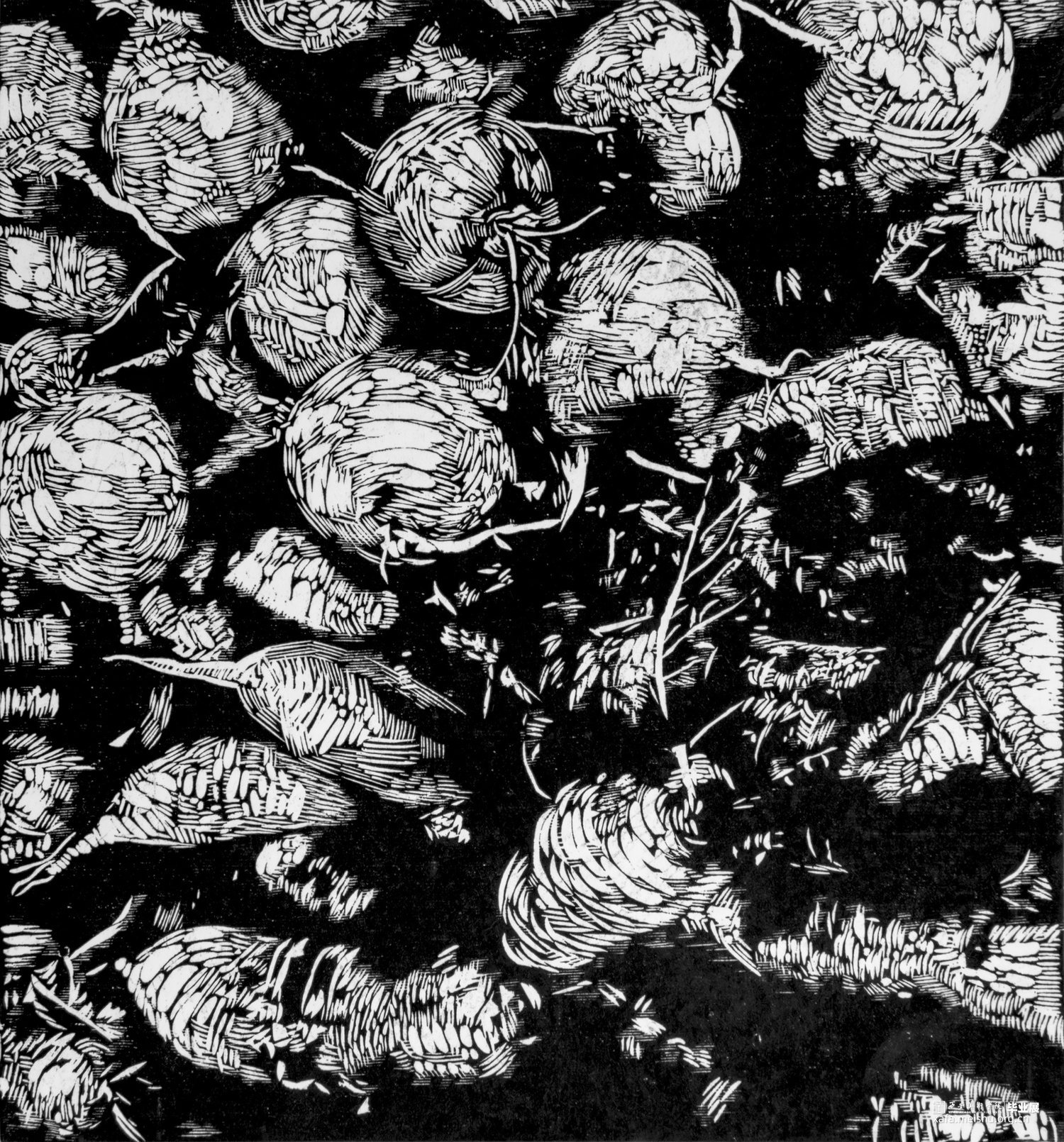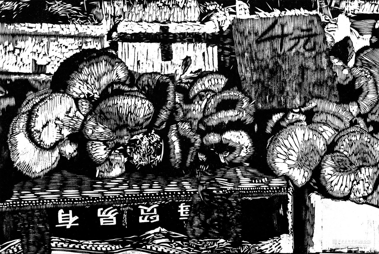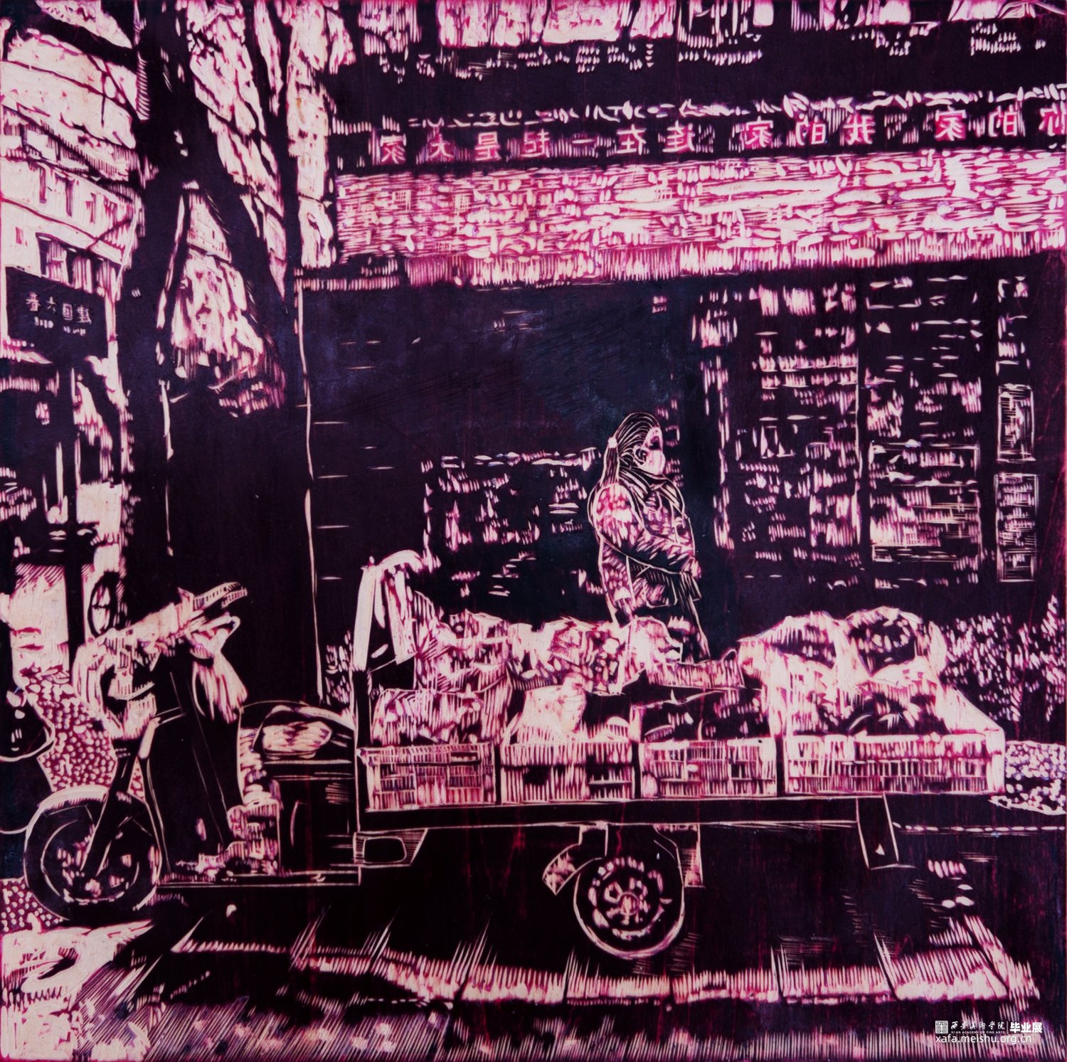 赶集文化作为一种独具特色的传统民俗文化,具有悠久的历史和丰富的文化内涵。然而,在现代社会中,赶集文化正面临着多方面的挑战和困境。本创作的题材以菜市场场景为主,通过对赶集现场生动瞬间的捕捉,展现了赶集文化的独特魅力,并探索了传统文化与现代艺术融合的可能性,为版画创作注入新的生命力。