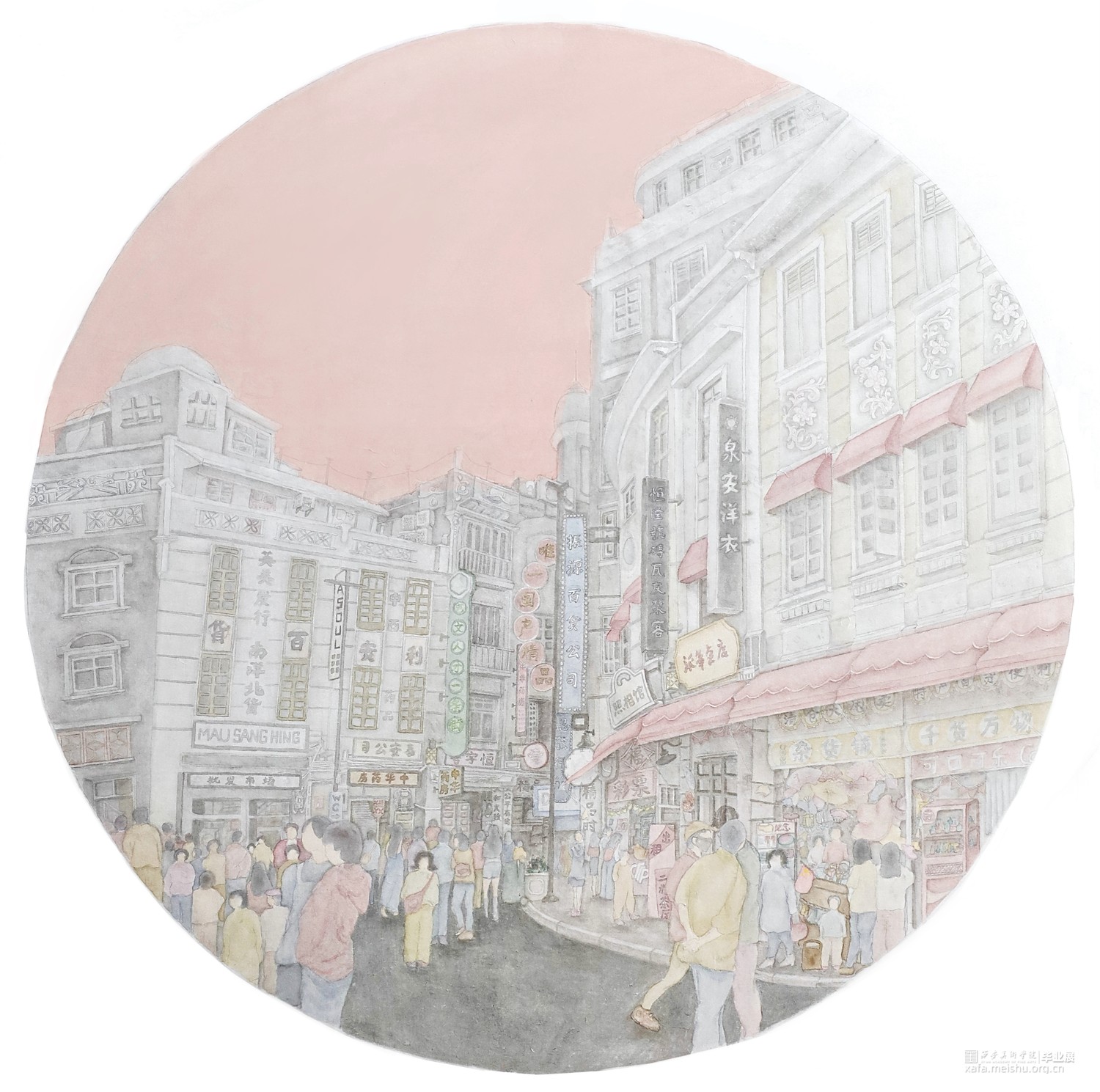 画卷之外,繁华之内。在某个海城的小街间,我依旧能隐约嗅到夹杂着清新玉米香气和翻腾在沸水里的牛肉飘香,依旧能感受到空气中飘荡着的氤氲水汽,依旧能听到抑扬顿挫语调飞扬着的讨价还价的海城口音,依旧能看到于高耸楼厦间纵横林立着的小栋小户。天光曈昽,我穿行其中,将那一刻的小小海城记录在此画中。