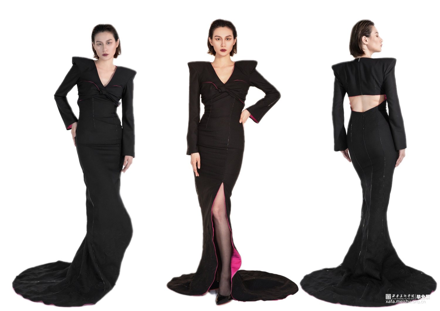三套作品服装面料均选择不易褶皱的西装面料,舒适便捷。颜色选用玫红色作为内衬,与黑色的搭配凸显出女性独有的内在美。服装装饰部分采用的是刺绣和钻链的低调奢华装饰,整体搭配均是在展现女性独有的魅力。