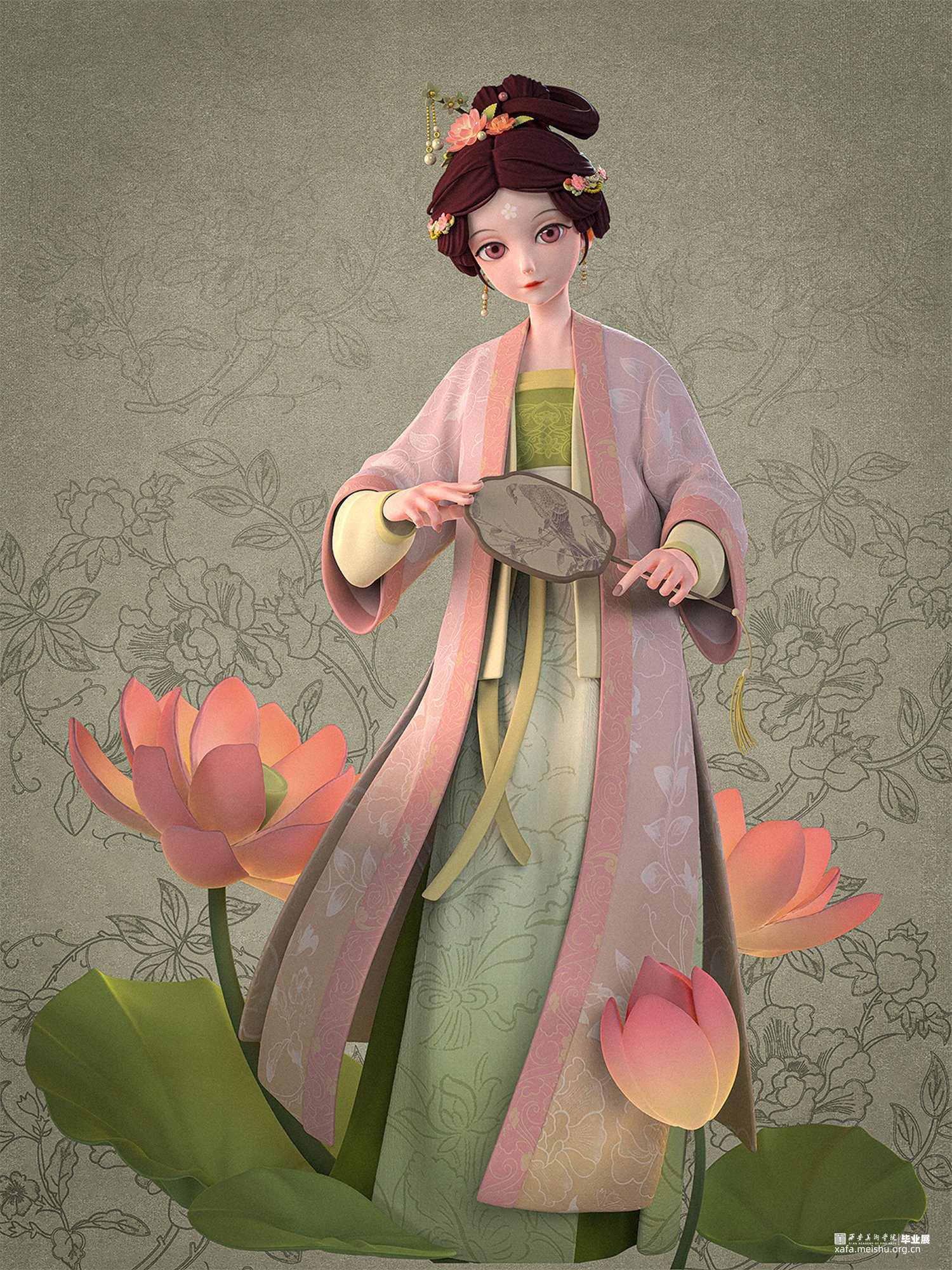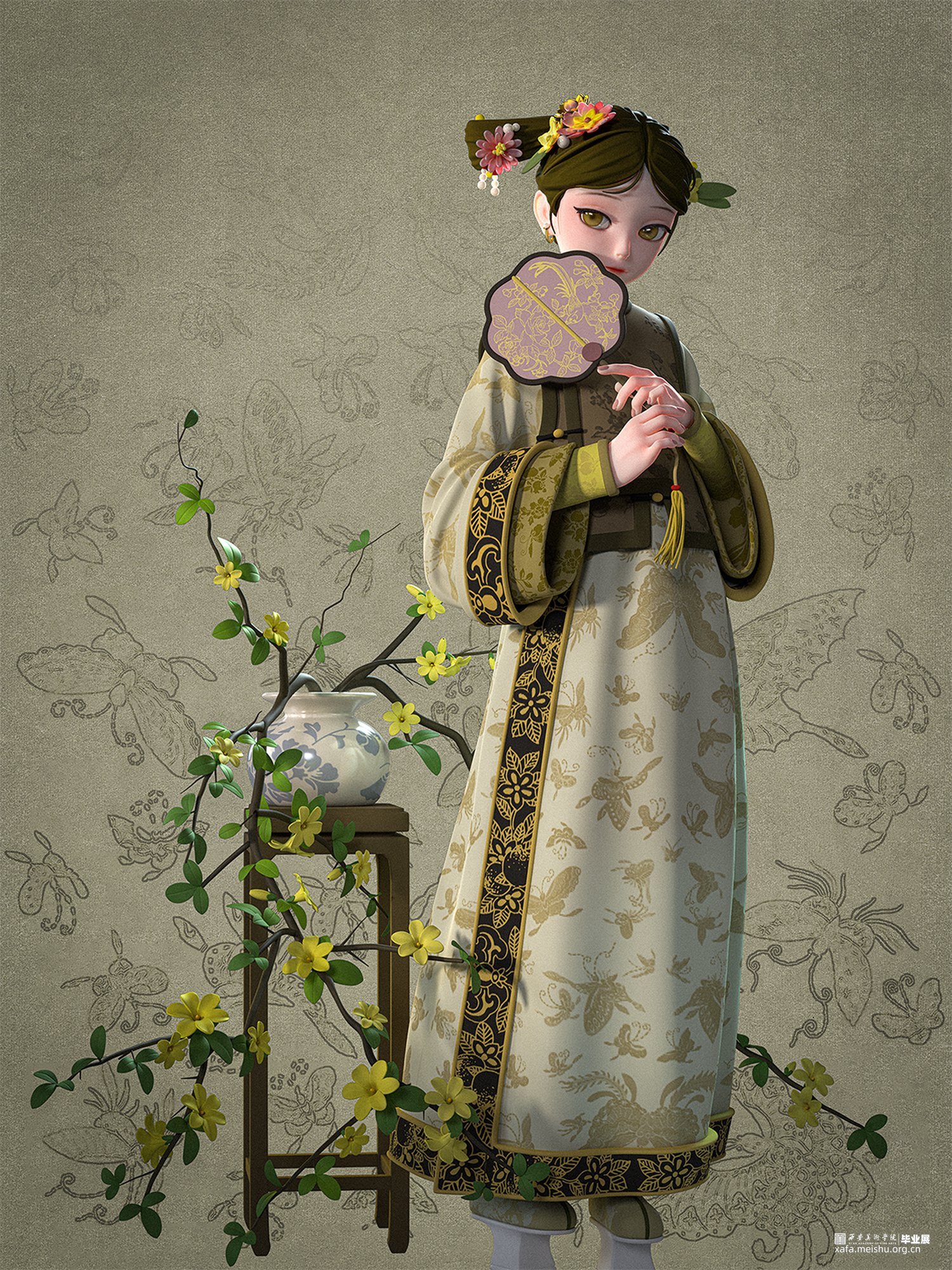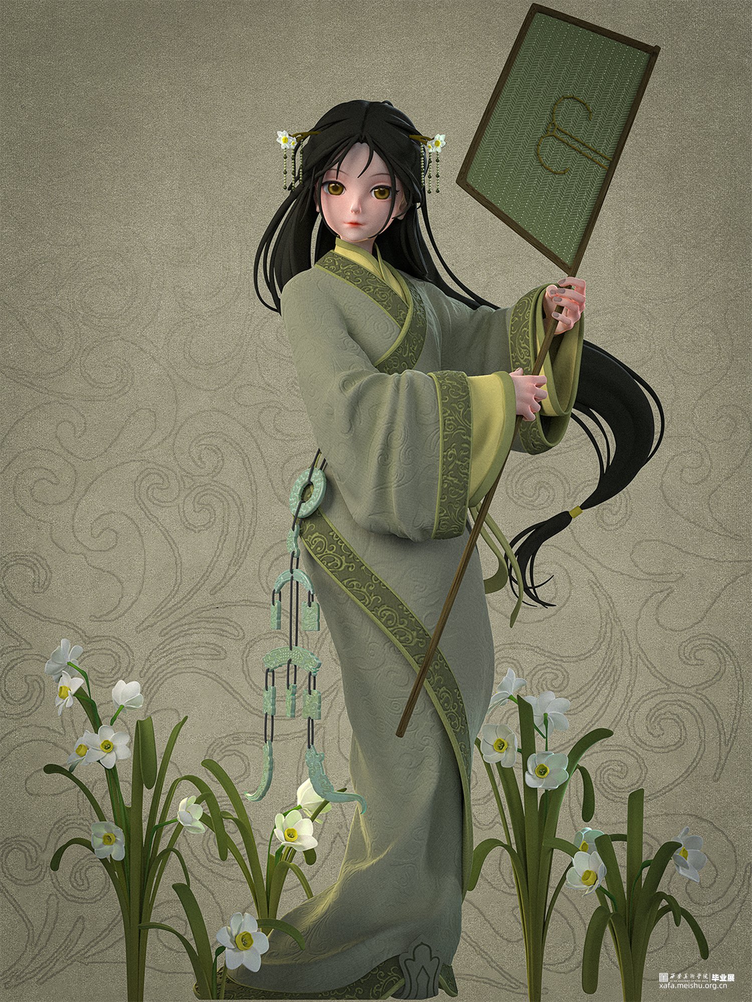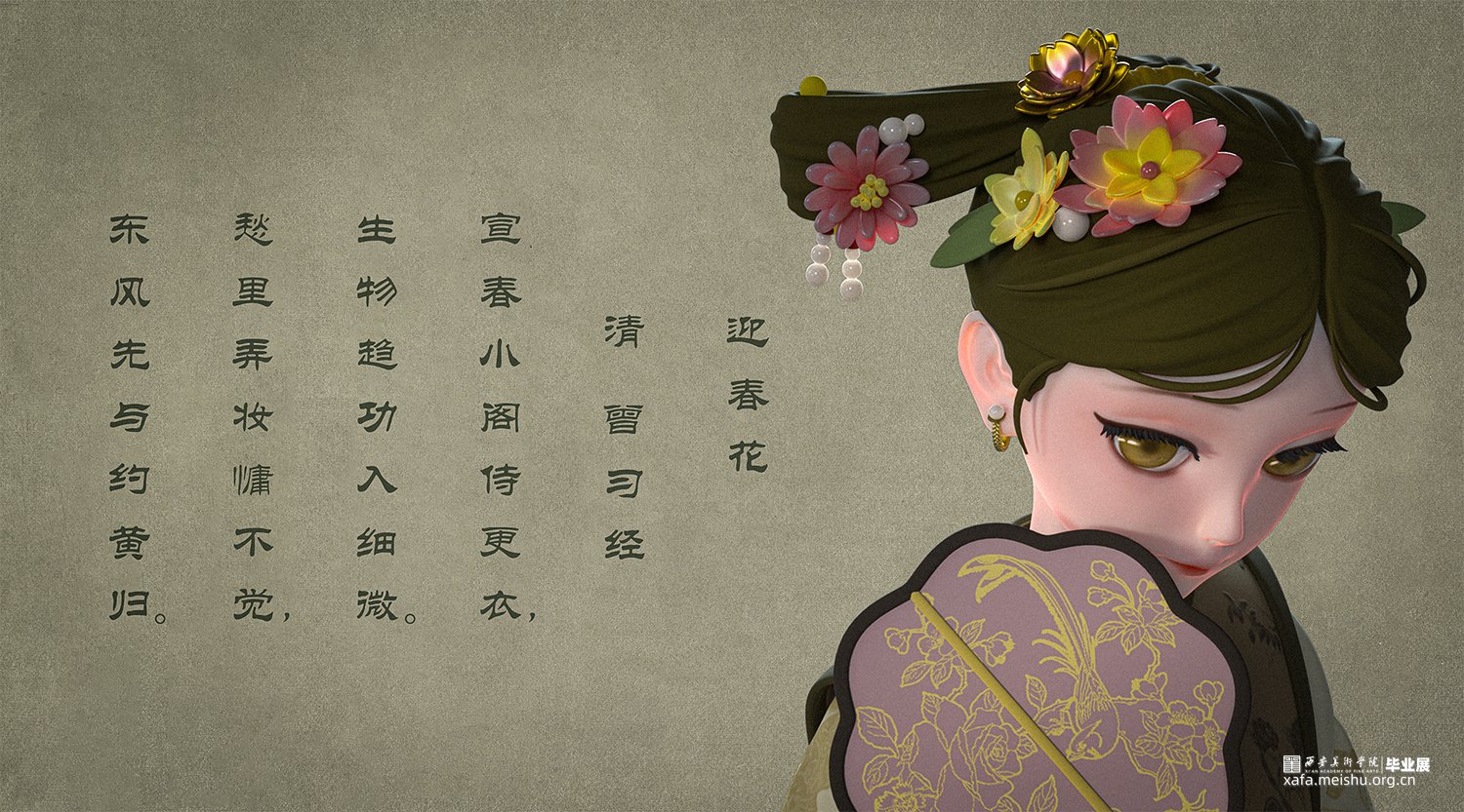 以四季对应的四种花融入古风元素设计制作系列角色,春天的迎春花、夏天的荷花、秋天的牡丹、冬天的水仙花,分别加入清代、宋代、唐代、汉代的服饰元素与纹样图案。