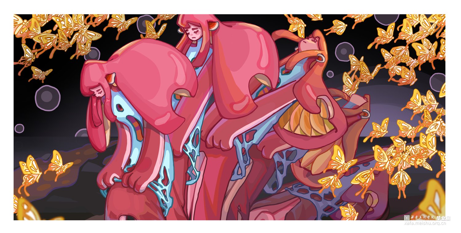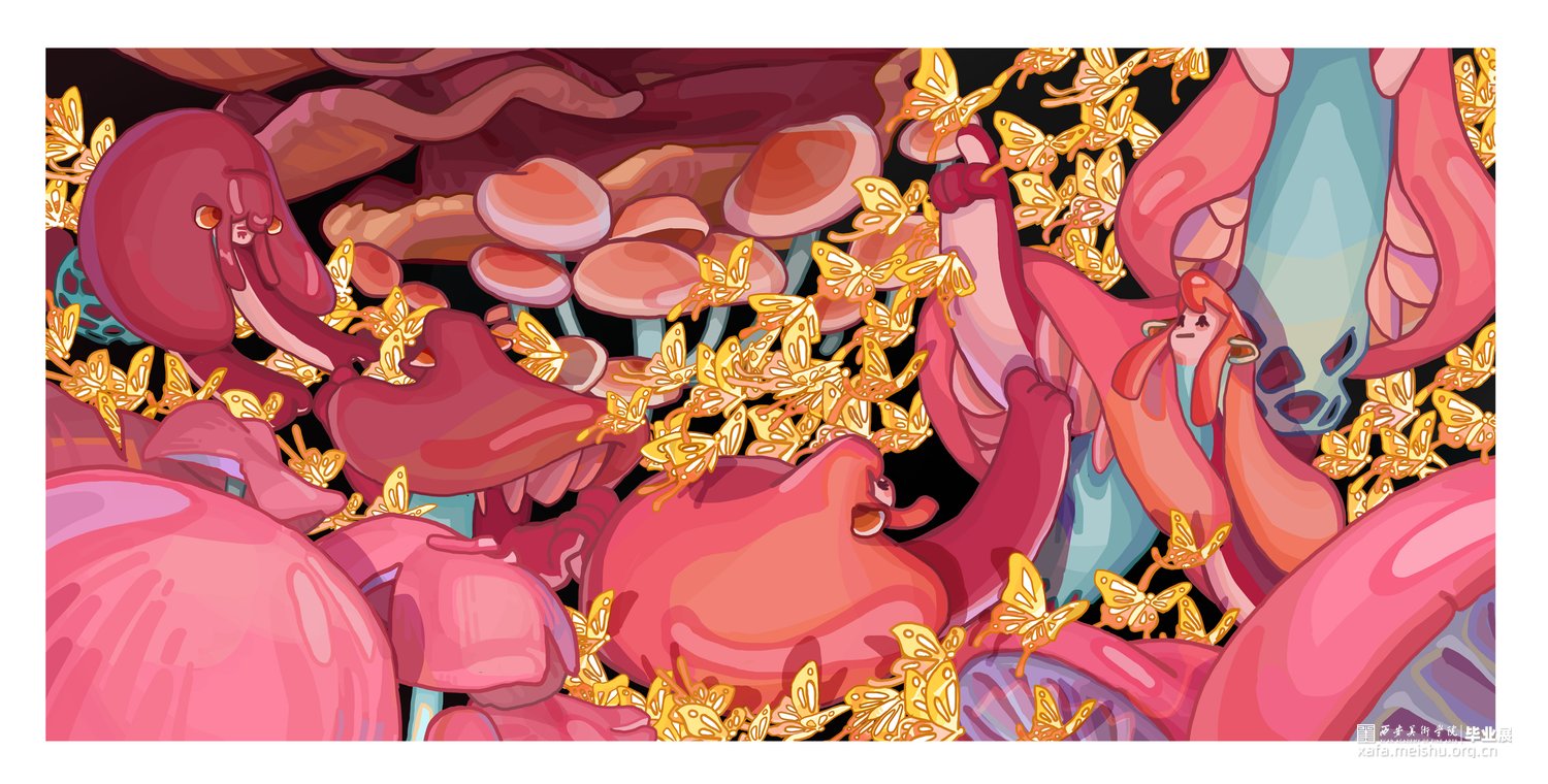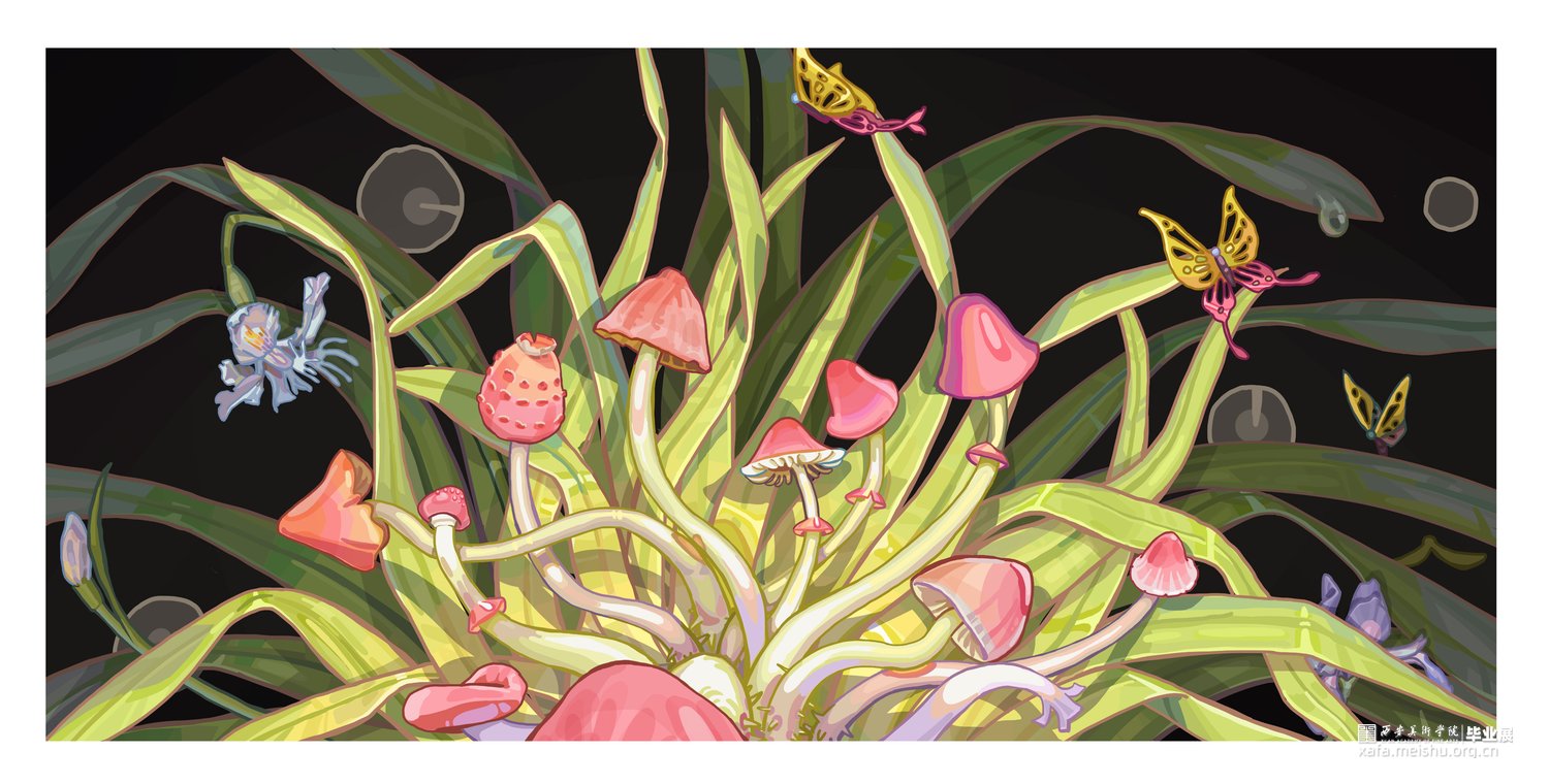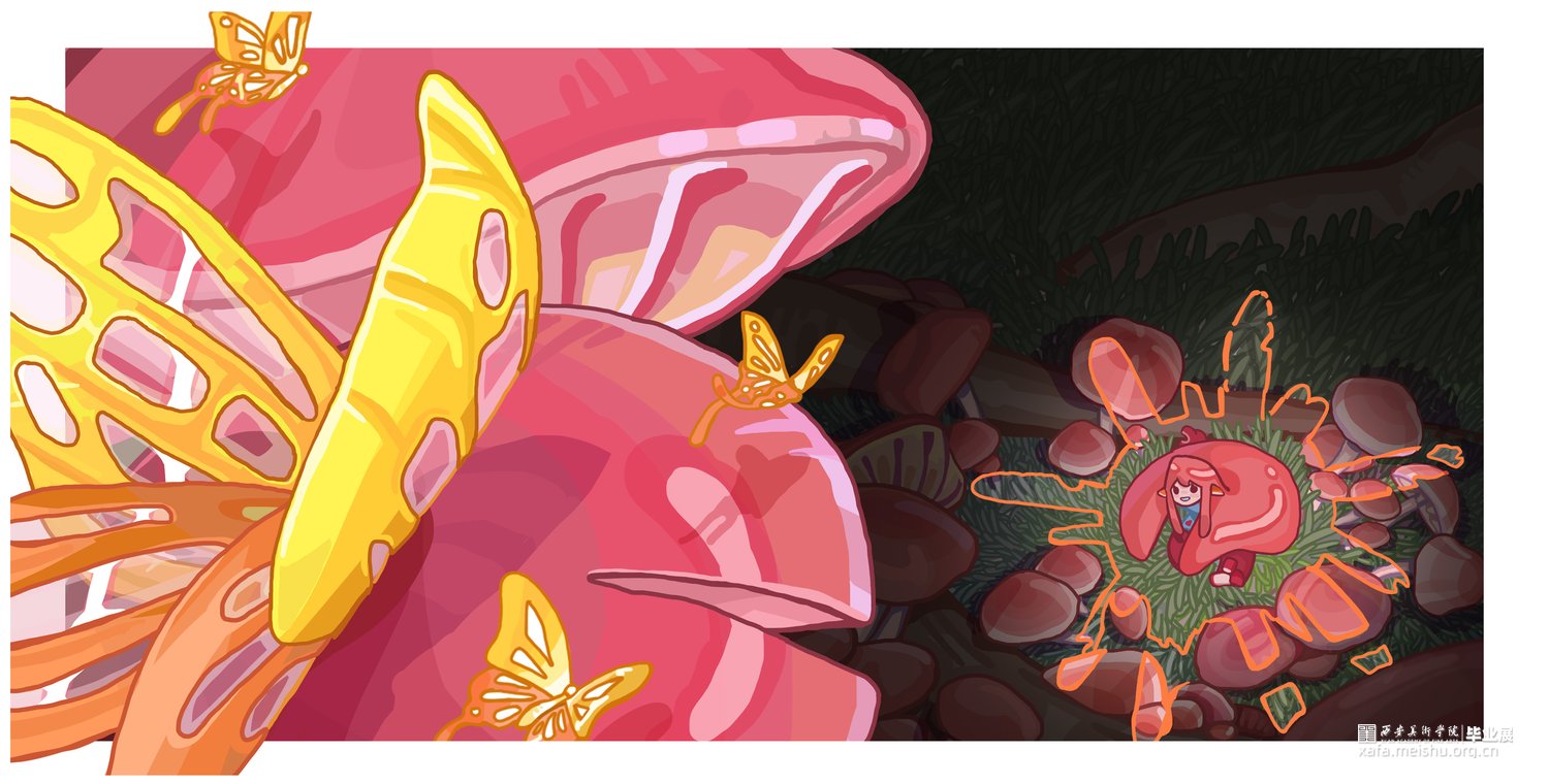 从黑暗里生长出一个小蘑菇,小蘑菇遇见蝴蝶,与蝴蝶嬉戏,幻想着与蝴蝶一起离开,可是,小蘑菇还是被束缚在原地,小蘑菇挣扎后消亡,在最后小蘑菇以另一种形态飞向天空,和蝴蝶一起。