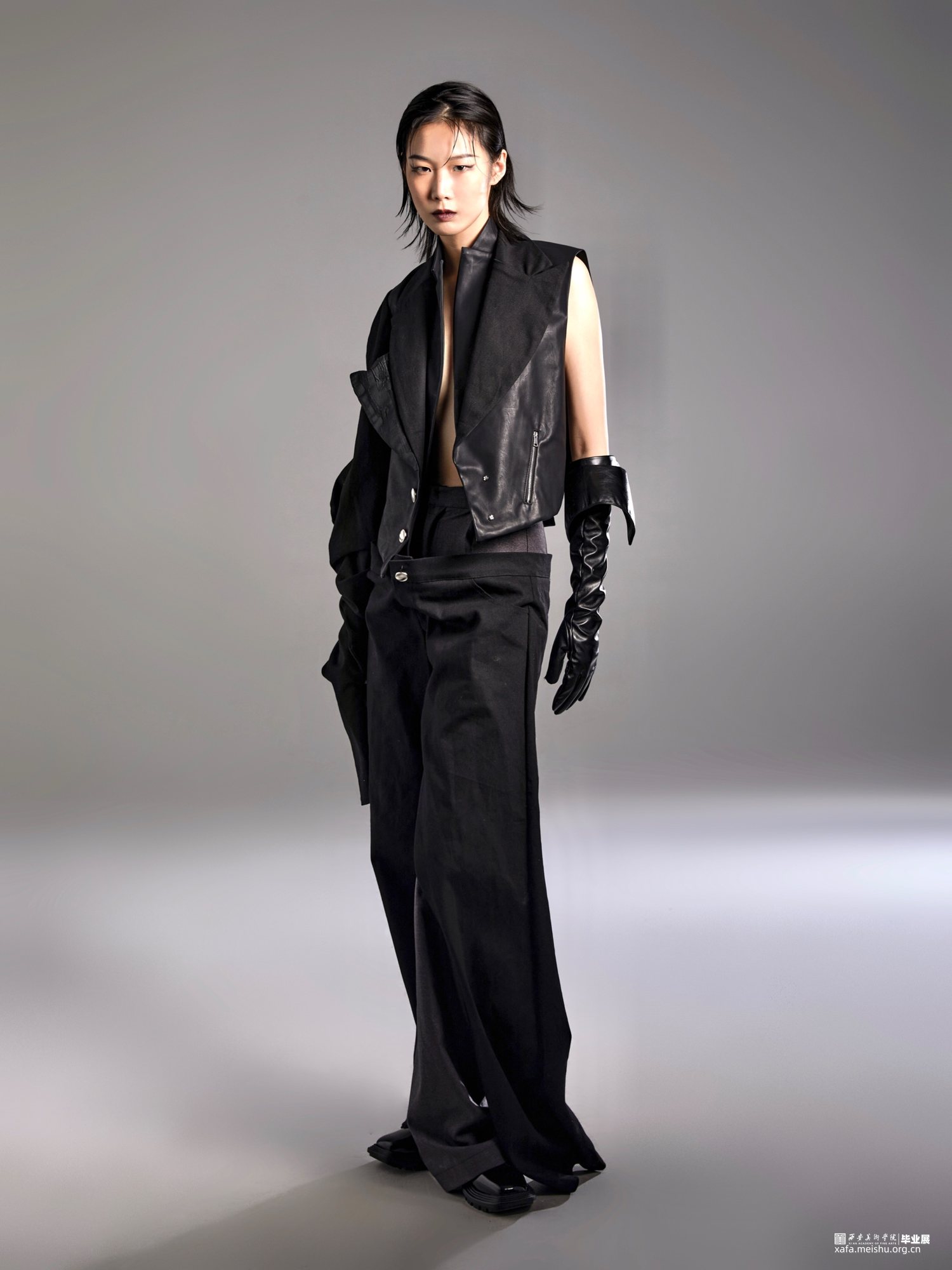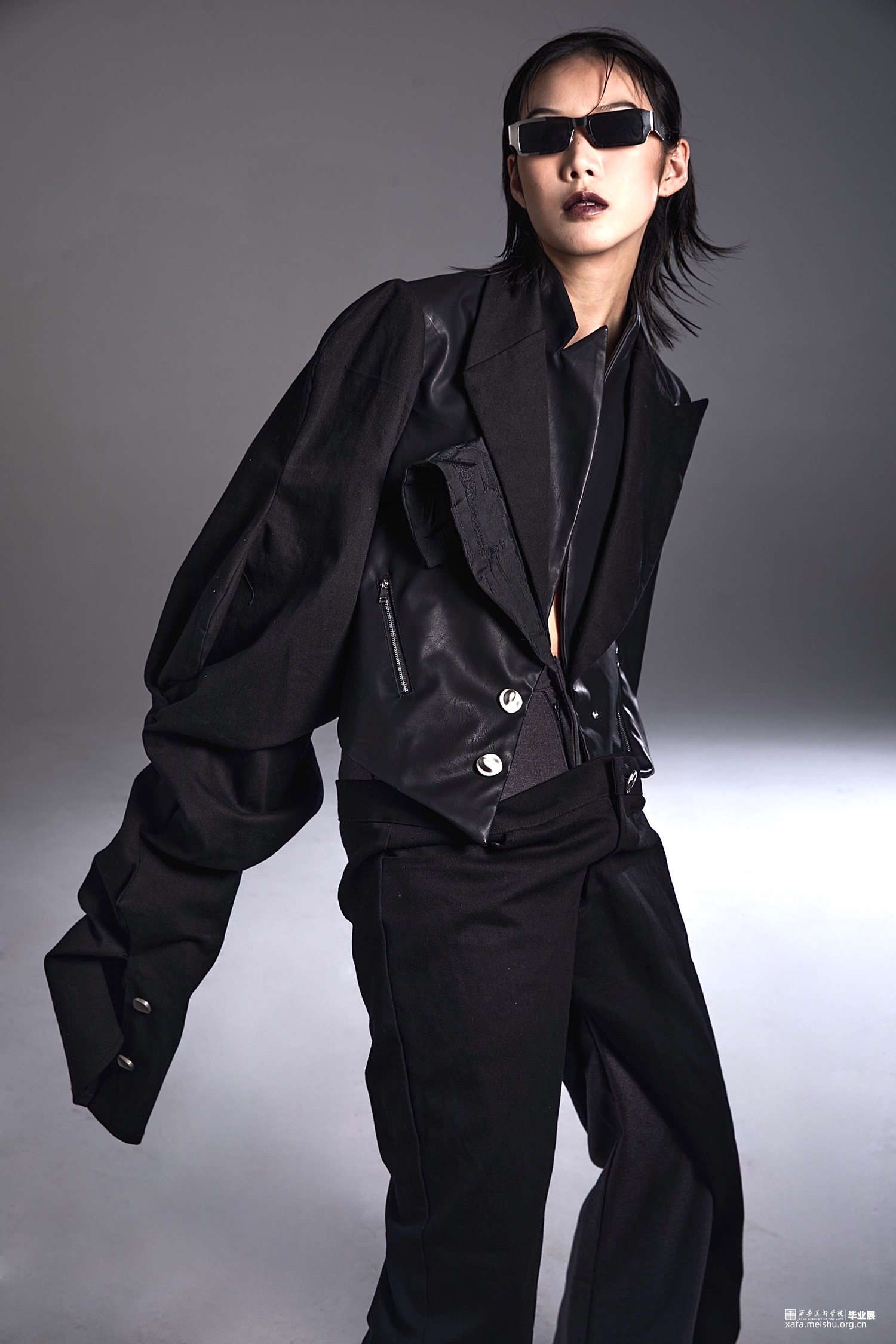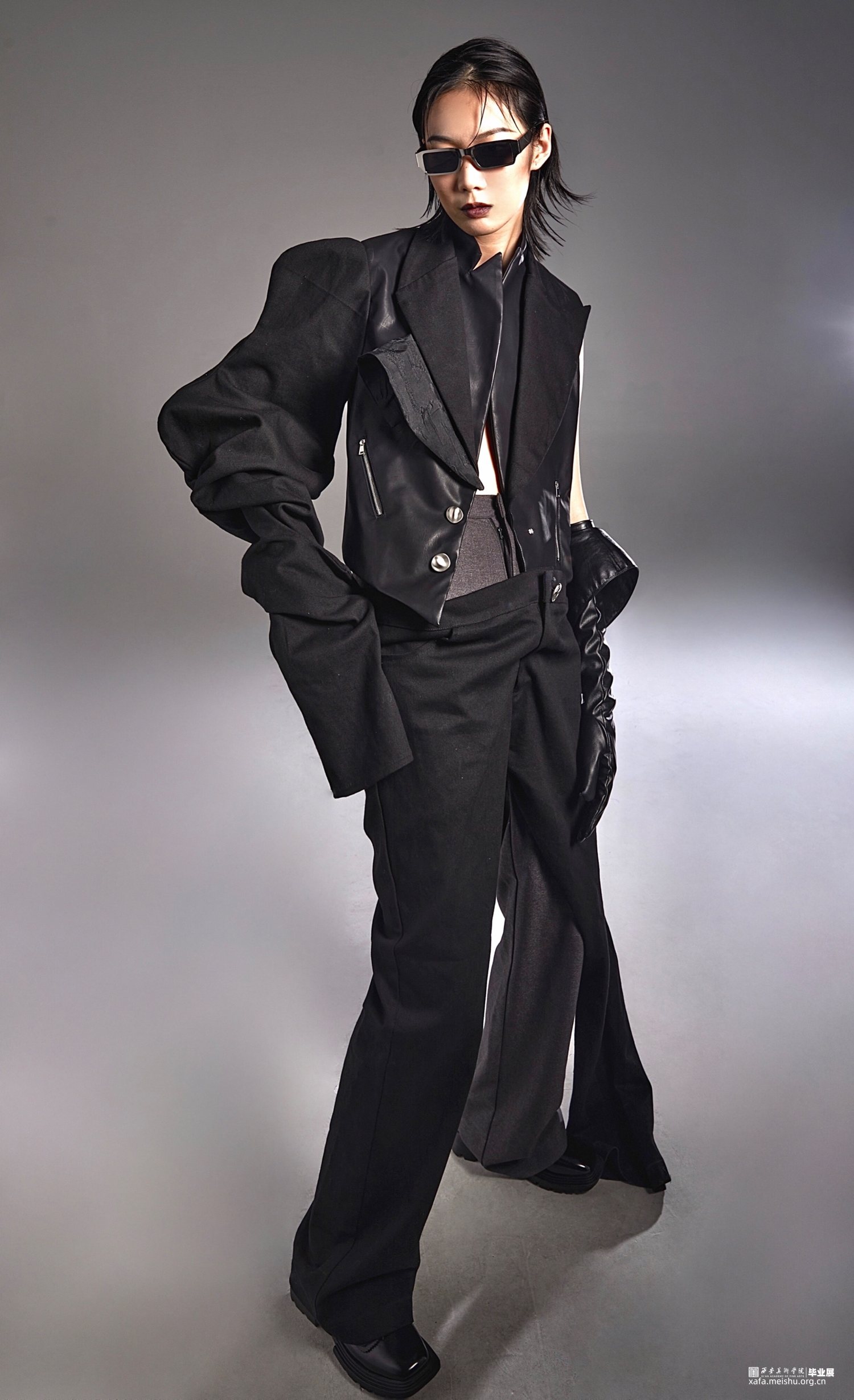 设计主题中文译为《安全感》,灵感来源于当今人们面对巨大压力时对安全感的缺乏、对孤独感的不安,从人们的心理安全感出发,是一次如何寻觅到属于自己的舒适圈的探索。将朋克元素中具有代表性的拉链、拼接等元素与心理安全感相互结合,运用大量的皮革面料,将黑色原本单一的色系通过光线对不同皮质面料的折射表现服装的层次感,加以创新设计来体体现朋克风格与自身毕设融合的结果。