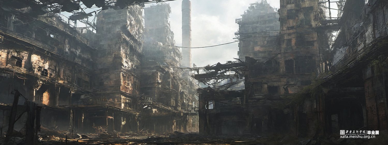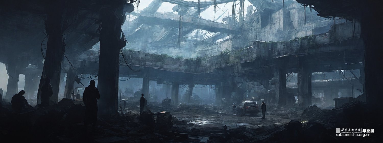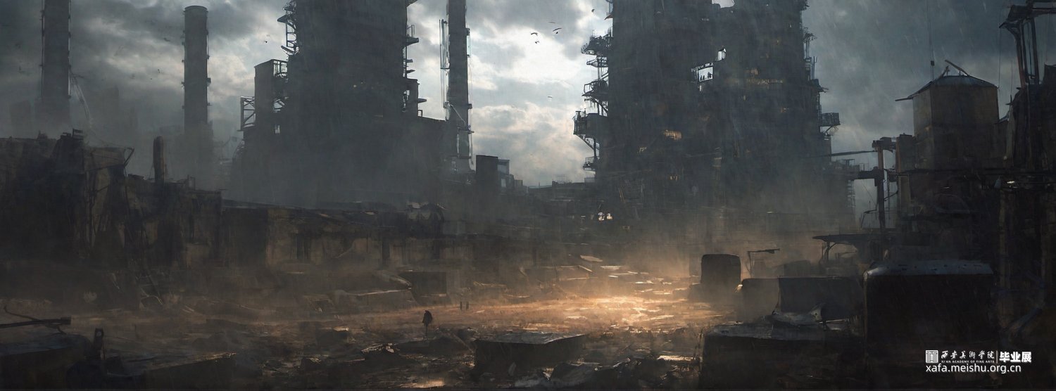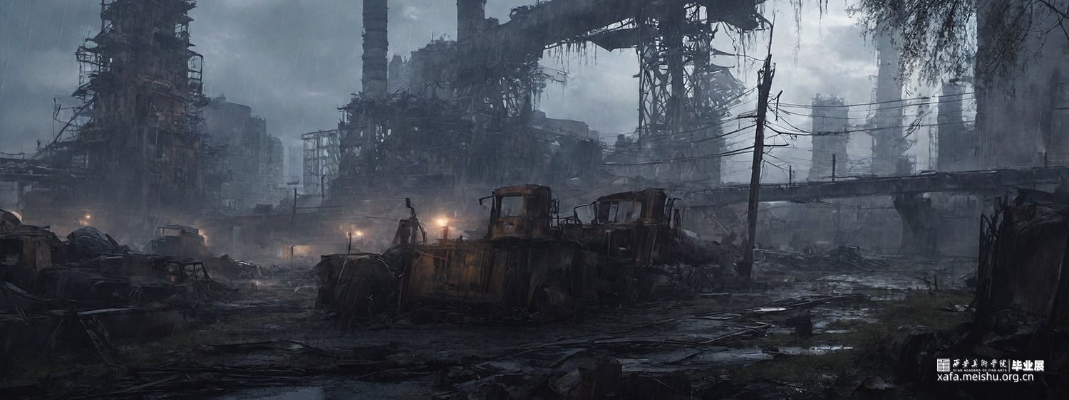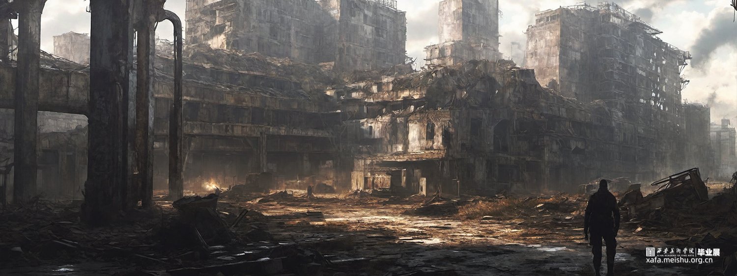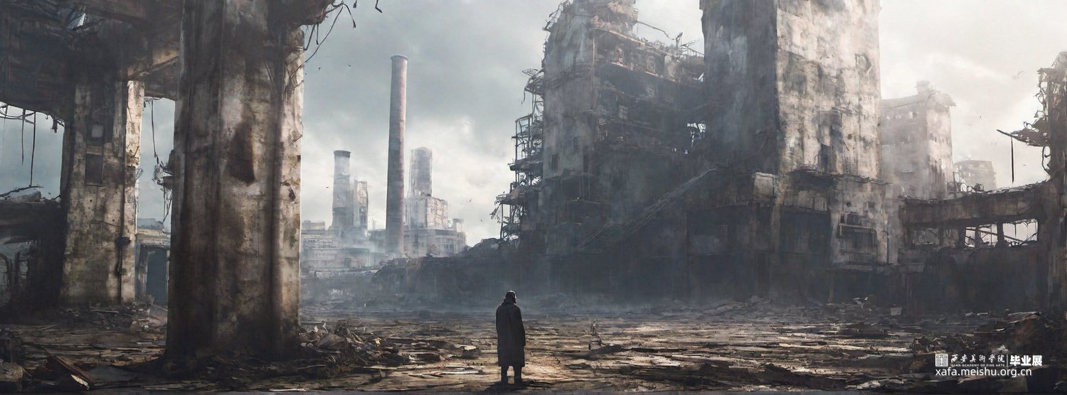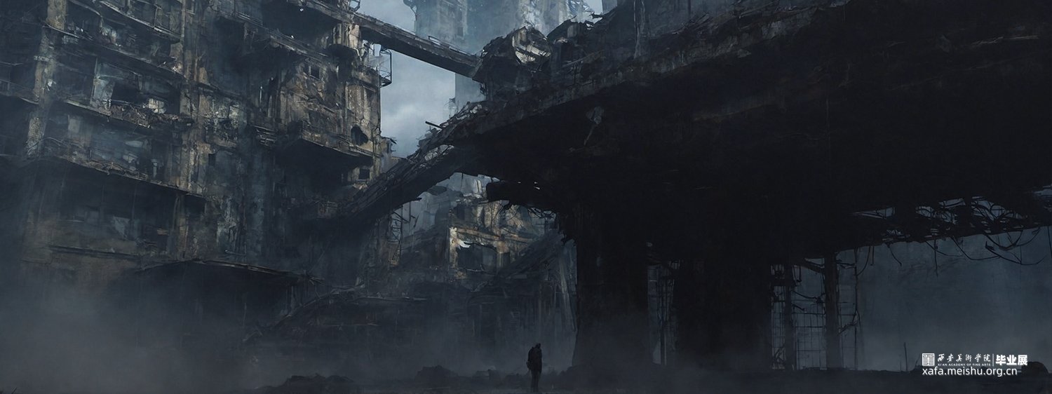 作为一个探索性的创作实验,融合了现实元素和科幻视觉,呈现出一个充满废墟与破碎的科幻架空世界。整个气氛图图集包括了四种不同的环境场景 - 荒漠、冰原、山城和密林。每一处环境都蕴含着独特的故事和隐喻,共同构筑出这个充满奇幻色彩的末世废土世界。通过对比现实与科幻元素的结合,场景呈现出独特的视觉风格。废弃的城市废墟与高耸入云的残存建筑,营造出一种未来世界的荒凉与残酷。人物的孤独身影更加凸显了这种破碎感,曾经被创造用于保护人类的技术,最终却演变为毁灭文明的工具,让人产生对人性和文明命运的深思。