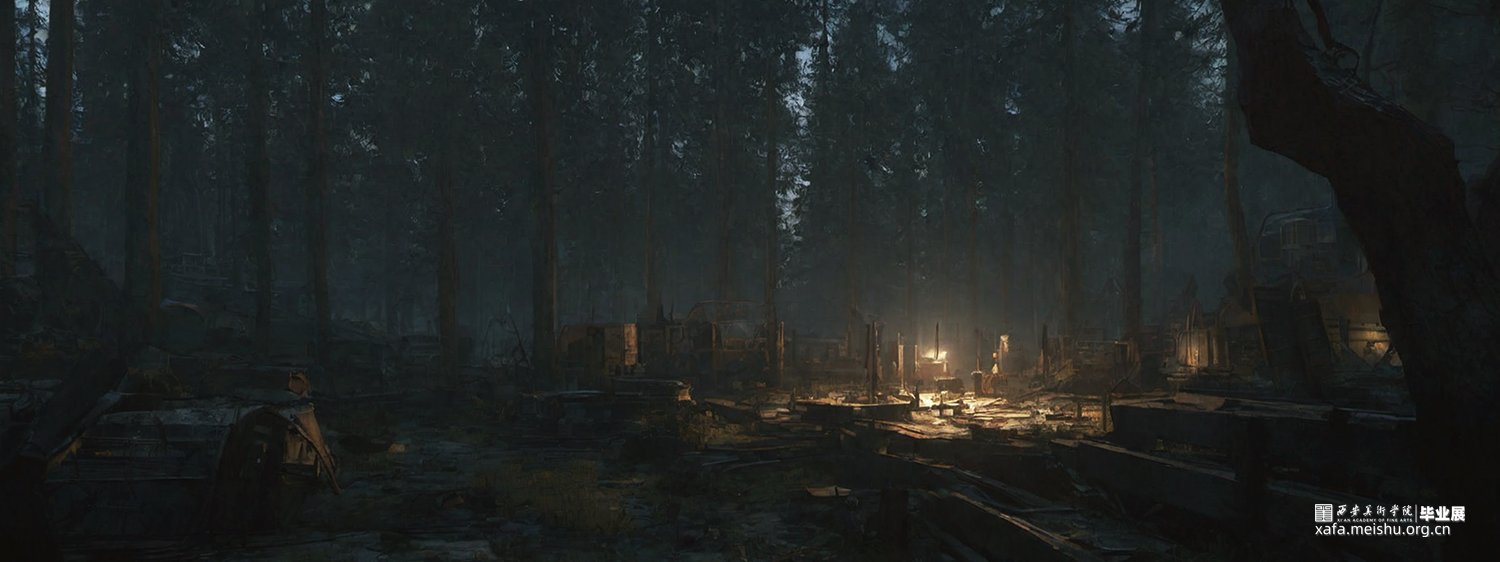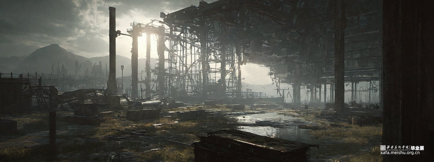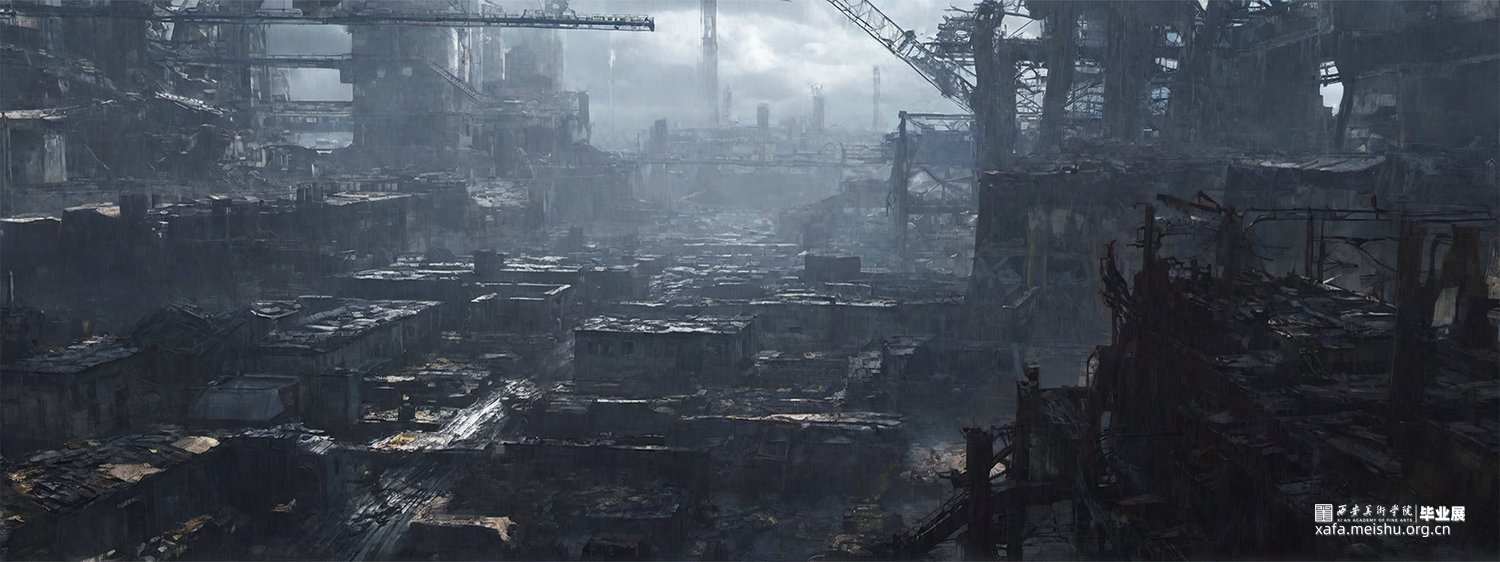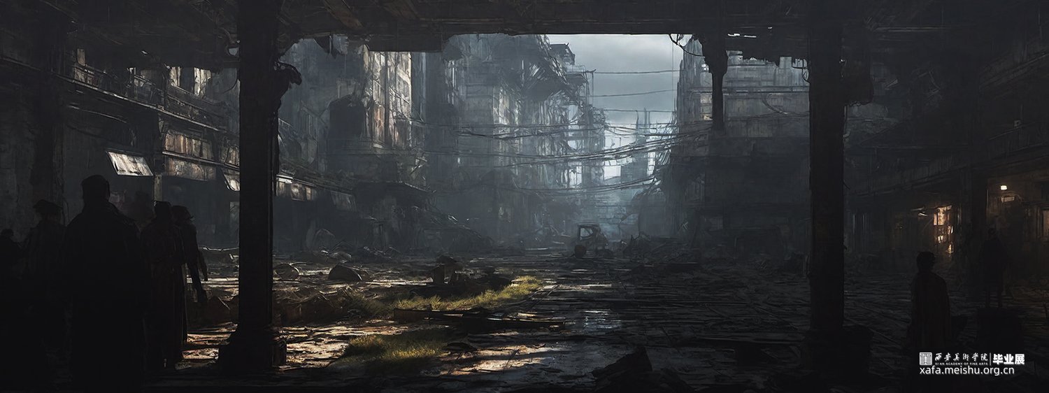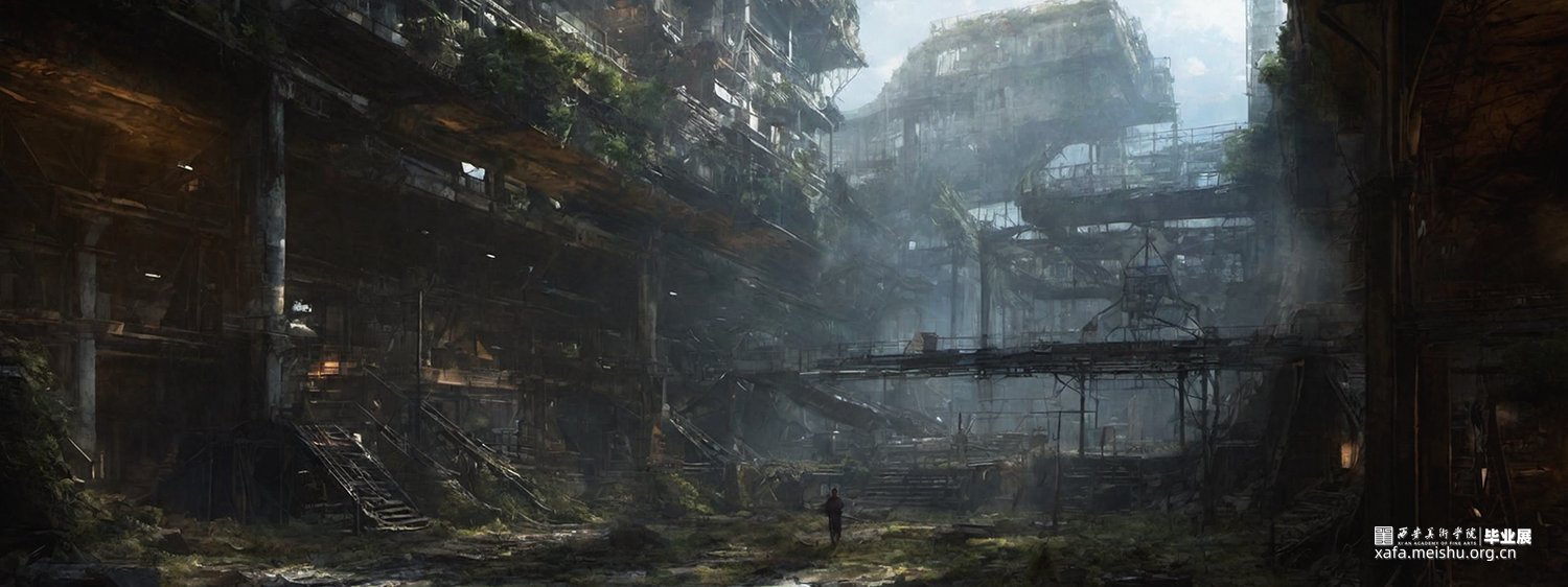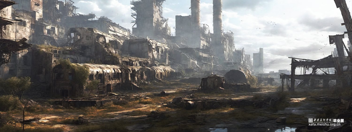 作为一个探索性的创作实验,融合了现实元素和科幻视觉,呈现出一个充满废墟与破碎的科幻架空世界。整个气氛图图集包括了四种不同的环境场景 - 荒漠、冰原、山城和密林。每一处环境都蕴含着独特的故事和隐喻,共同构筑出这个充满奇幻色彩的末世废土世界。通过对比现实与科幻元素的结合,场景呈现出独特的视觉风格。废弃的城市废墟与高耸入云的残存建筑,营造出一种未来世界的荒凉与残酷。人物的孤独身影更加凸显了这种破碎感,曾经被创造用于保护人类的技术,最终却演变为毁灭文明的工具,让人产生对人性和文明命运的深思。