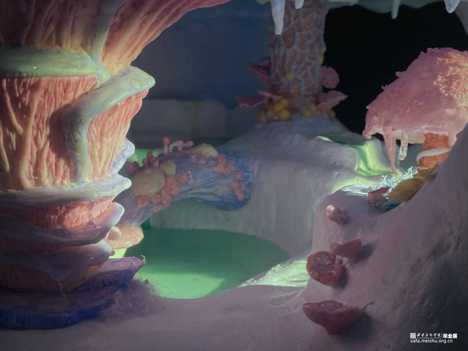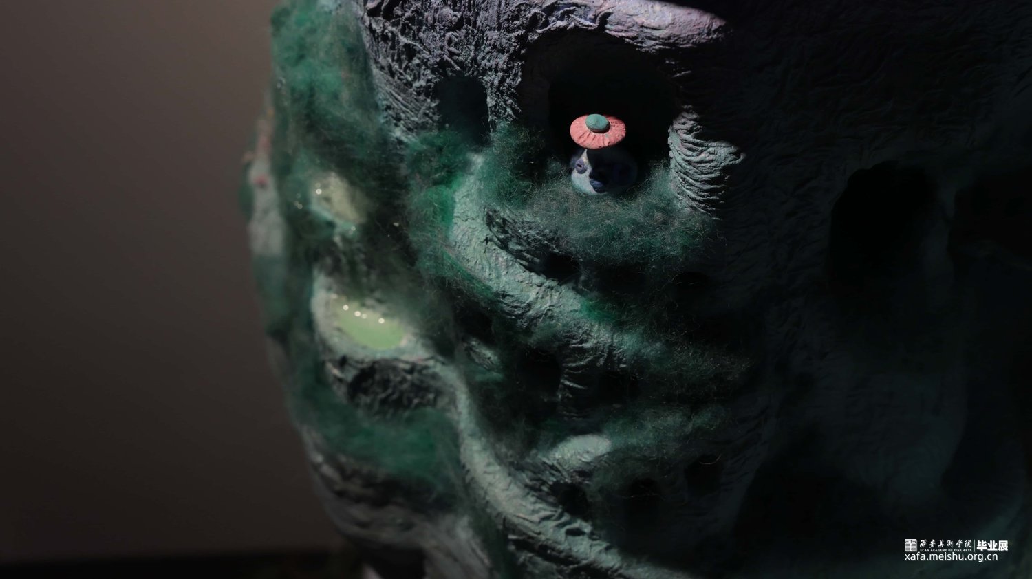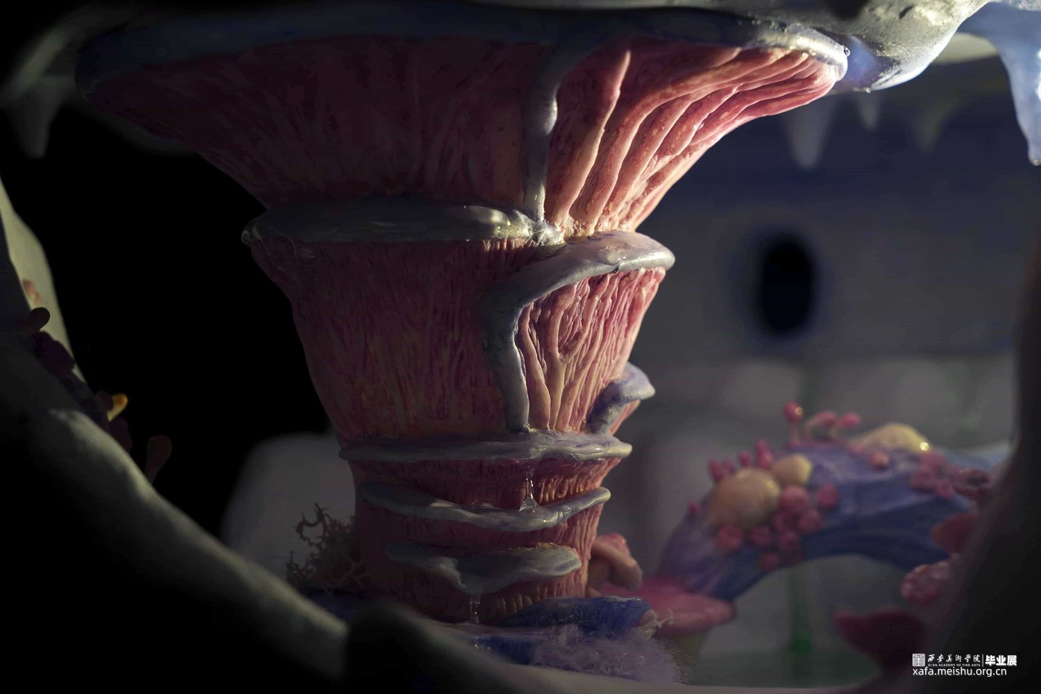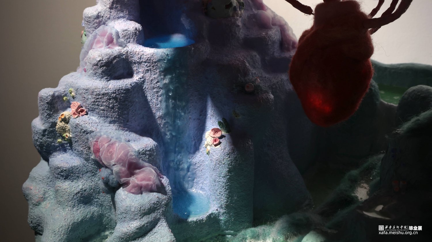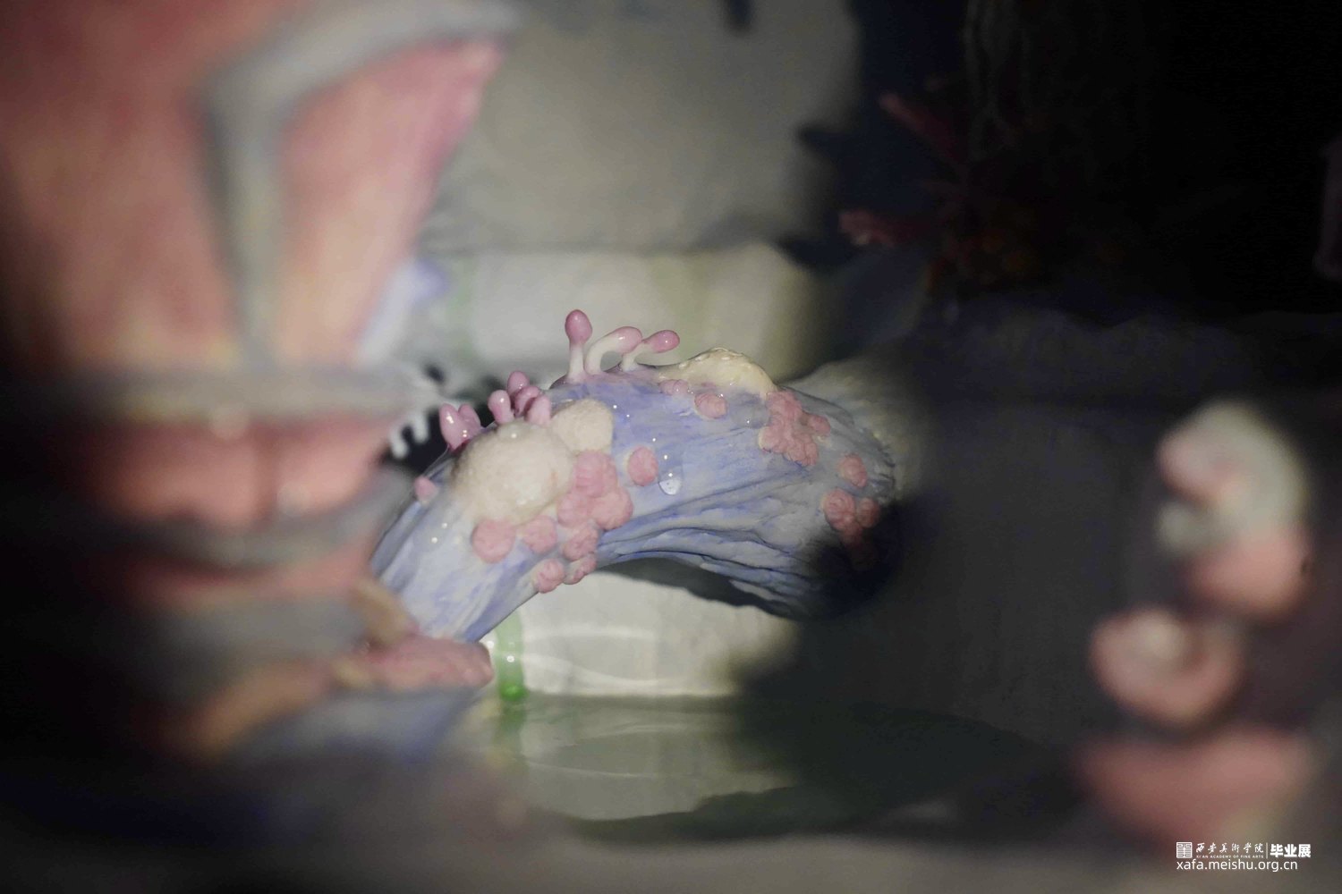 作品以独特的视角,将人体内部的复杂结构与自然界的生态循环相互映照,通过这一方式来试图揭示人与自然的和谐共生关系。在视觉呈现上,《向野相生》采用了微观视角,将观众带入一个充满生机与活力的微观世界。模型中融入了交互式的跳动心脏设计,象征着人与自然间生生不息的联系。同时,作品巧妙地结合了呼吸灯和夜光粉等材料,赋予模型中的微生物另一种生命形式的呈现。微生物在光线的映照下,仿佛拥有了呼吸和生命,与心脏一同跳动,共同构建了一个充满魅力的微观生态系统。