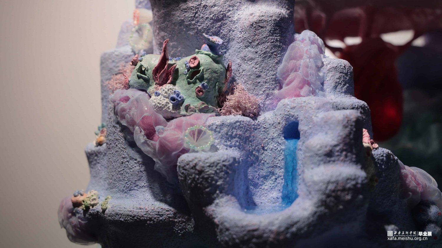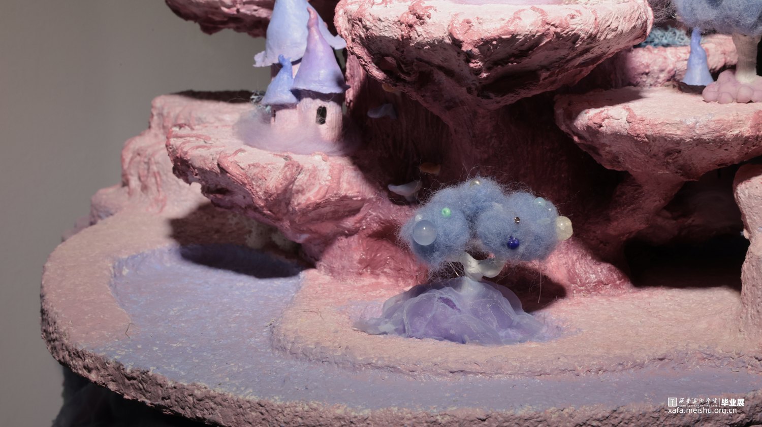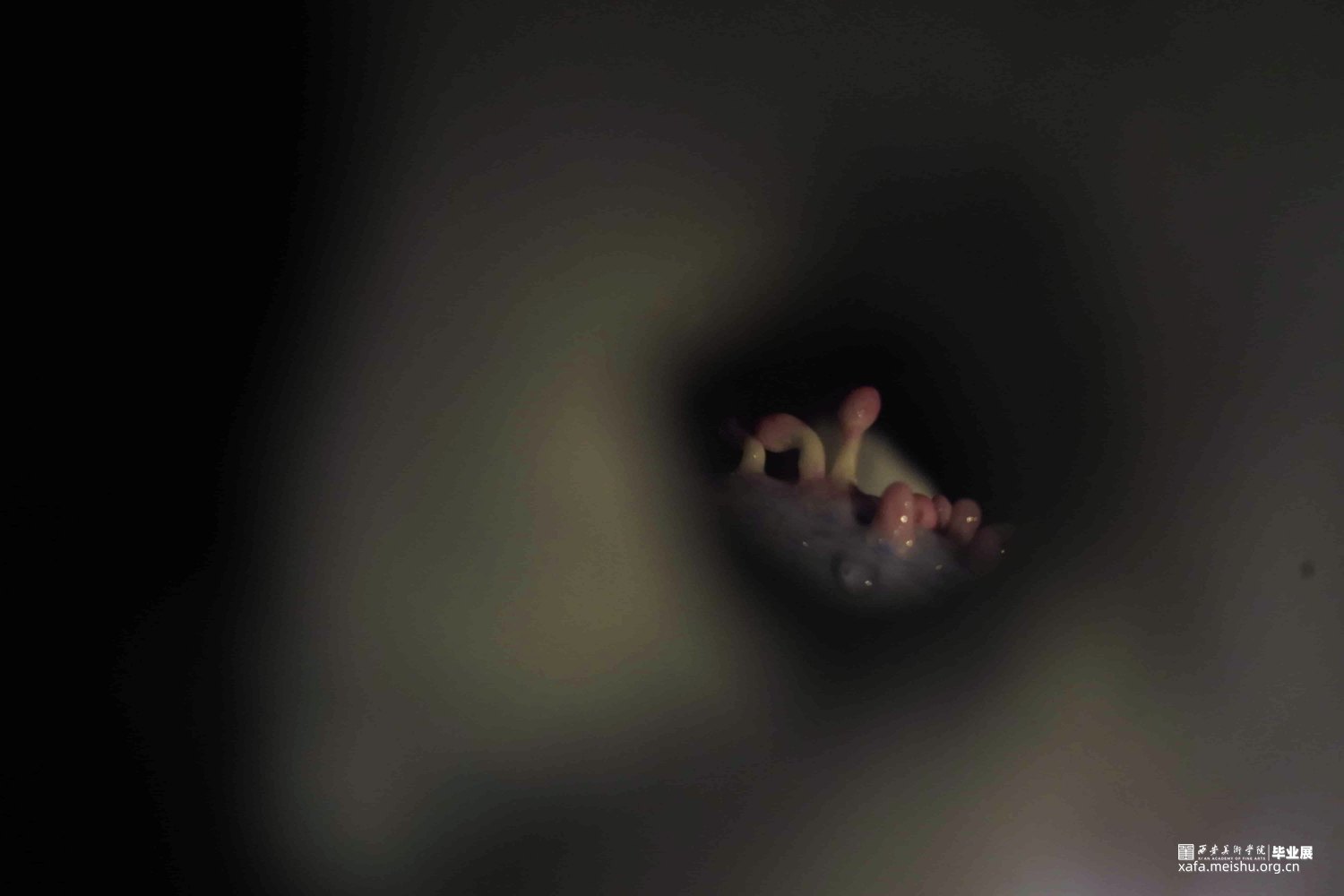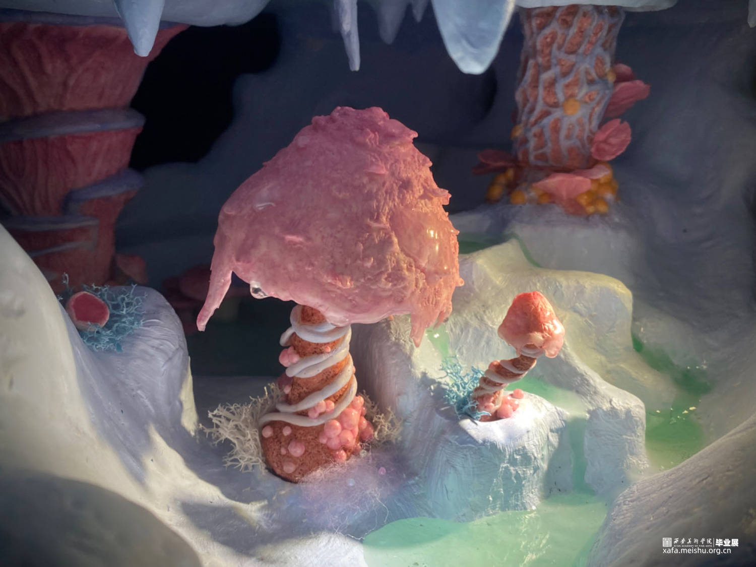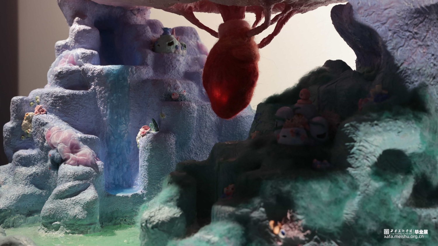 作品以独特的视角,将人体内部的复杂结构与自然界的生态循环相互映照,通过这一方式来试图揭示人与自然的和谐共生关系。在视觉呈现上,《向野相生》采用了微观视角,将观众带入一个充满生机与活力的微观世界。模型中融入了交互式的跳动心脏设计,象征着人与自然间生生不息的联系。同时,作品巧妙地结合了呼吸灯和夜光粉等材料,赋予模型中的微生物另一种生命形式的呈现。微生物在光线的映照下,仿佛拥有了呼吸和生命,与心脏一同跳动,共同构建了一个充满魅力的微观生态系统。