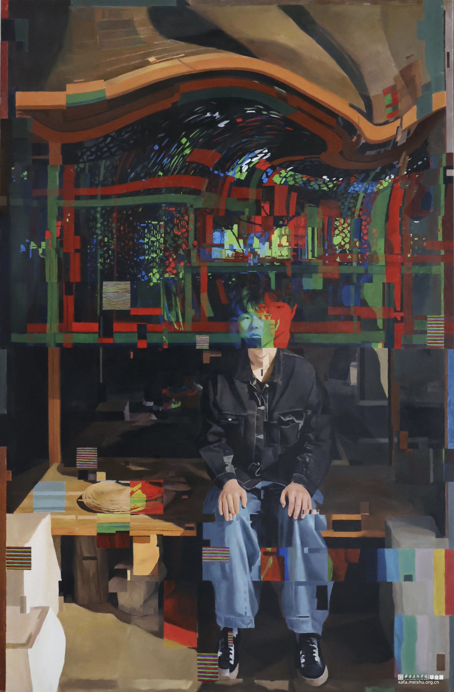 本画整体上色彩鲜艳,对比强烈。画面中心是一位坐姿端正的同学,以头为区分将整幅画一分为二,一半大红加大绿的鲜艳色彩,另一半却是较为平常的、色彩较少的“正常”的“日常”。整体是以“红,绿,蓝”三种纯色、扭曲、深渊为元素进行加工。舍弃掉部分的技法,给人以一种纯视觉上的震撼,尝试用画面和观众互动。崭新人物三种头部:正面为较为日常,面对大家的一面“绿”;右侧面为较为危险,势力,给人以压迫感的“红”;左侧面为较为隐藏,融于环境中压抑的“蓝”;这三种面部对应着我们观察一个人“主观”或“客观的分析''。强烈的对比使得观众