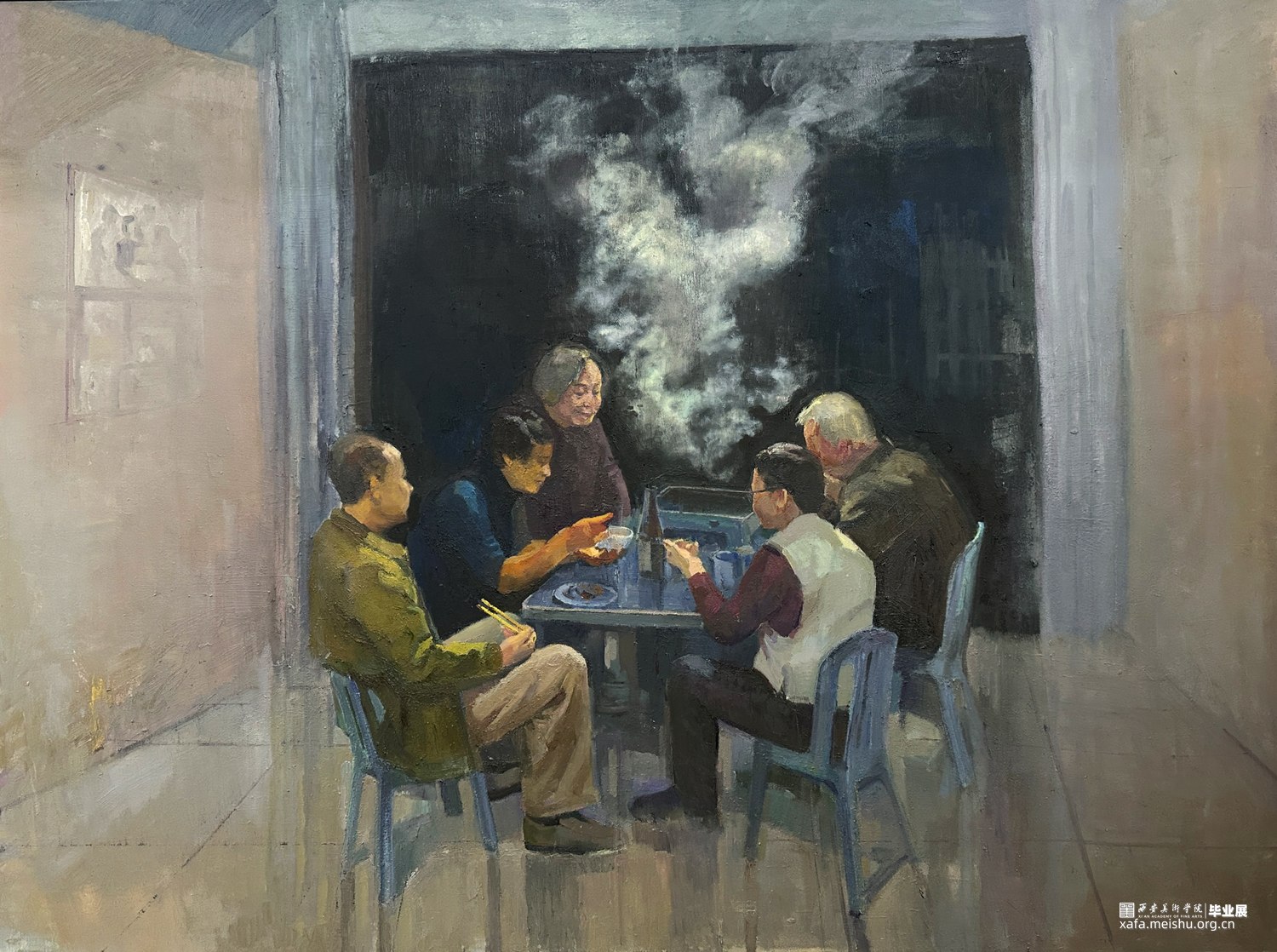 亲人永远是我绘画创作中的永恒主题,素材取自于一次家庭聚会,一家人围坐在桌前,有说有笑,当时夜色渐浓,我用相机记录下这一珍贵的画面。