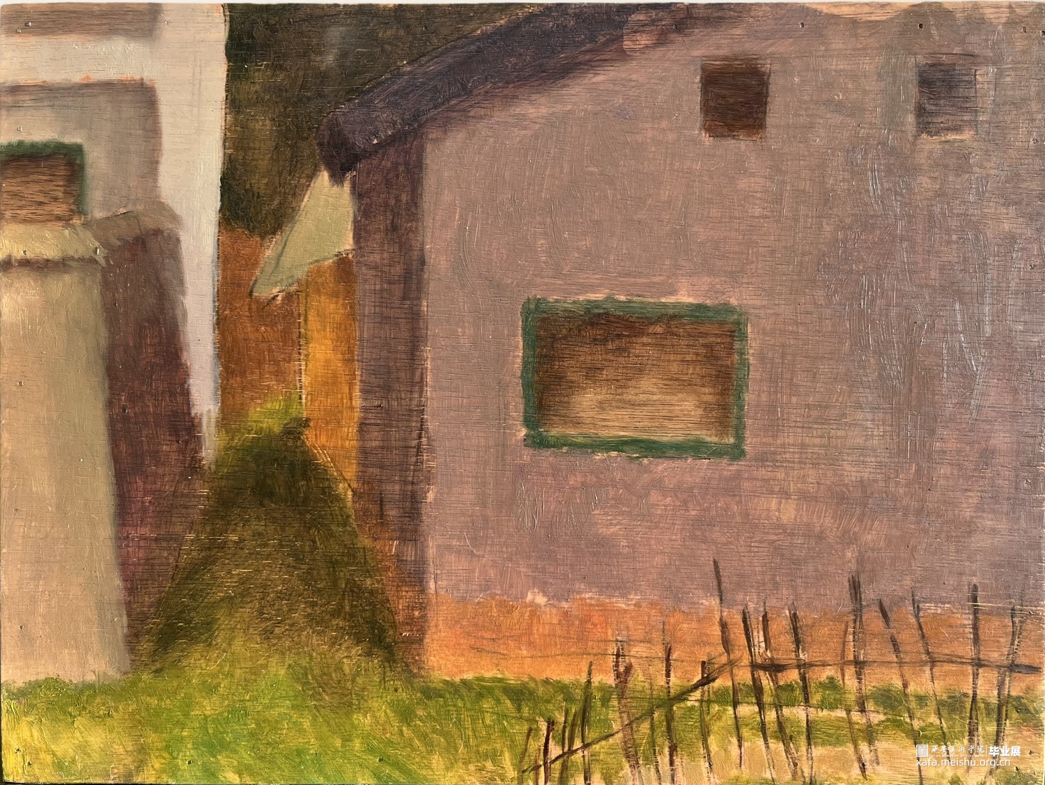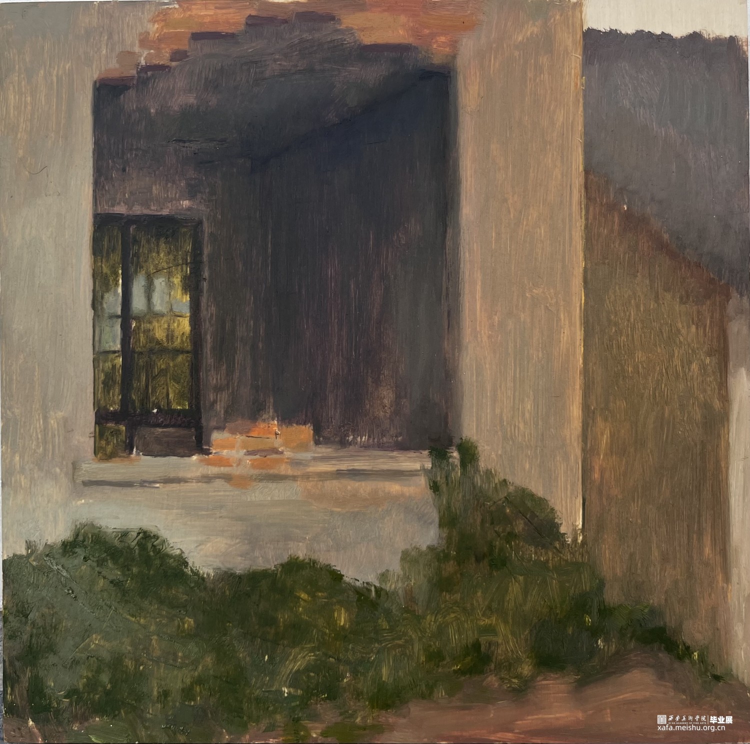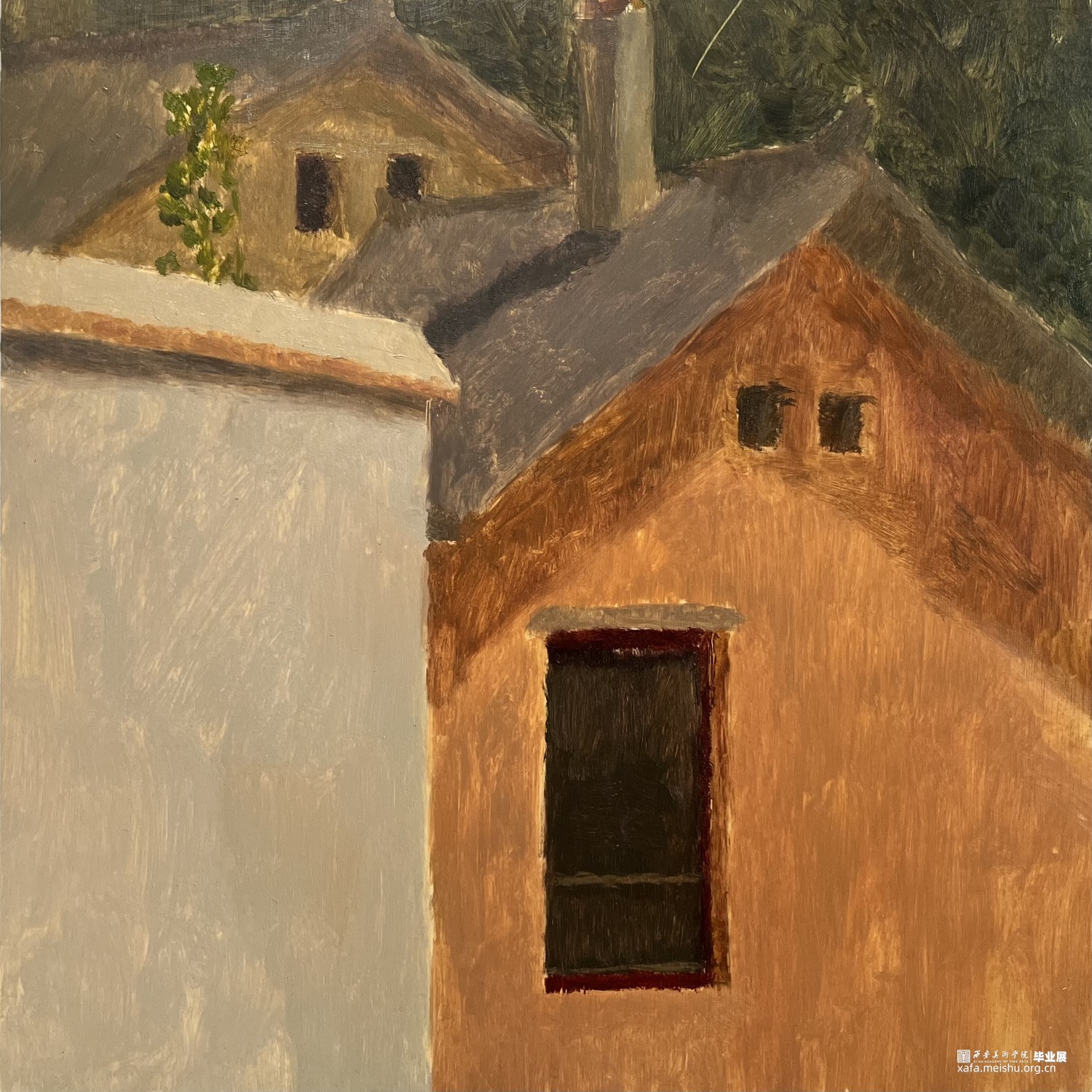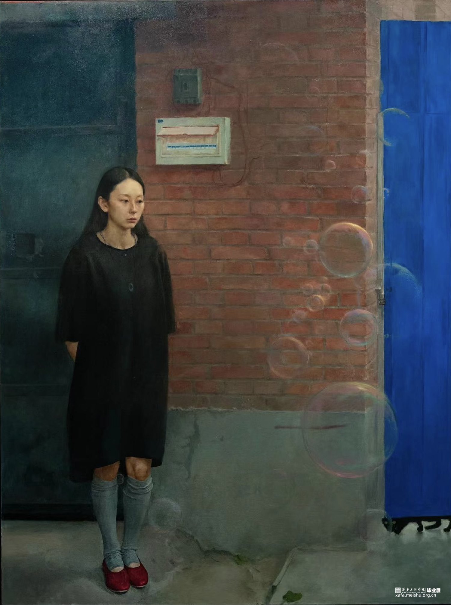 此画描绘了儿时成长的故乡,有红砖墙、蓝绿铁门等,而泡泡连接着童年记忆和美好感受,画中人物看着泡泡回忆起过去的二十余年时光。