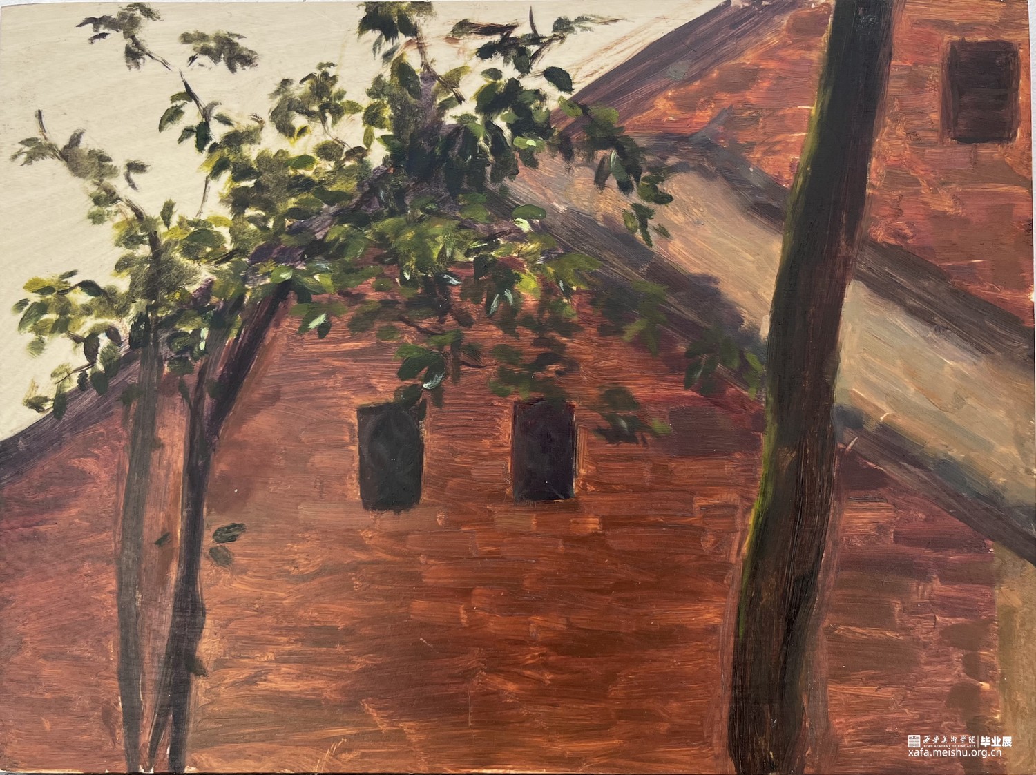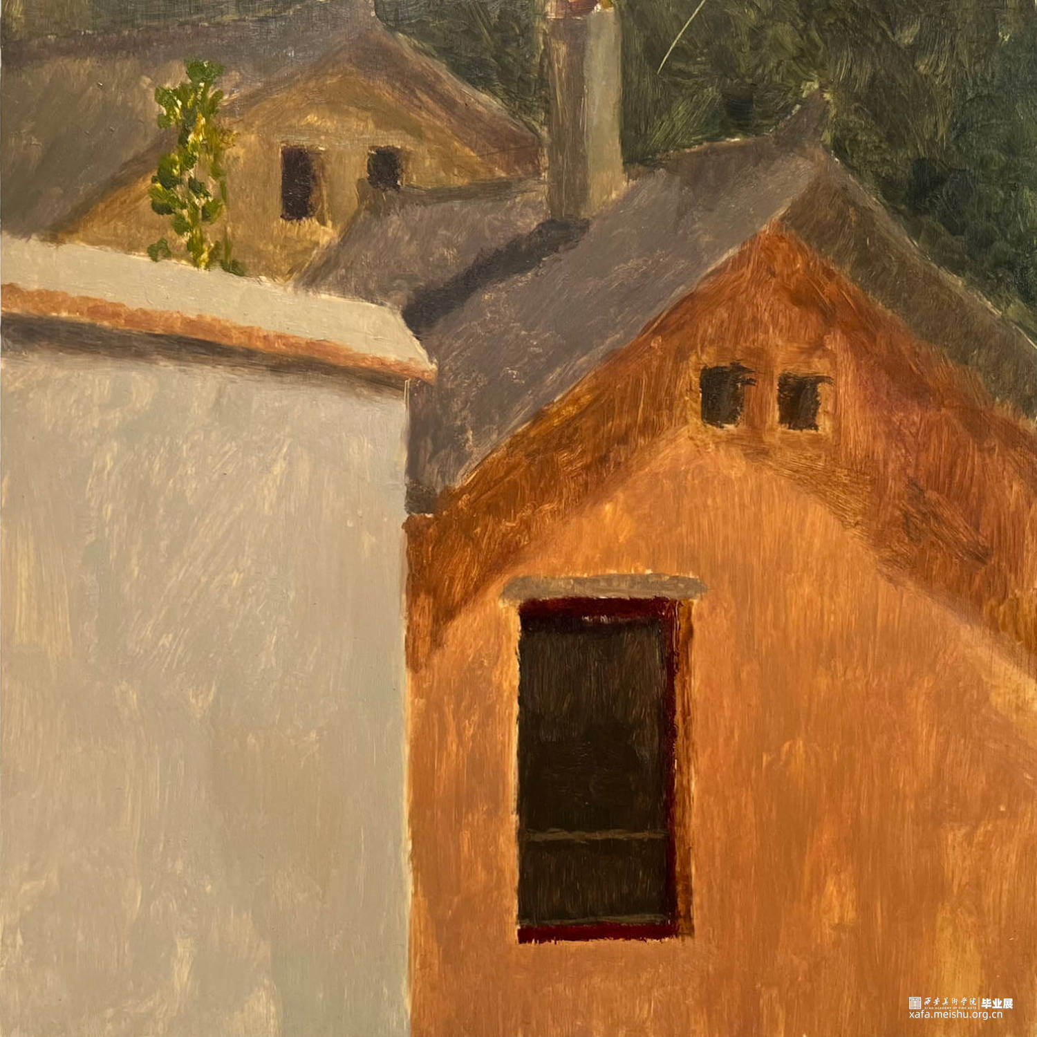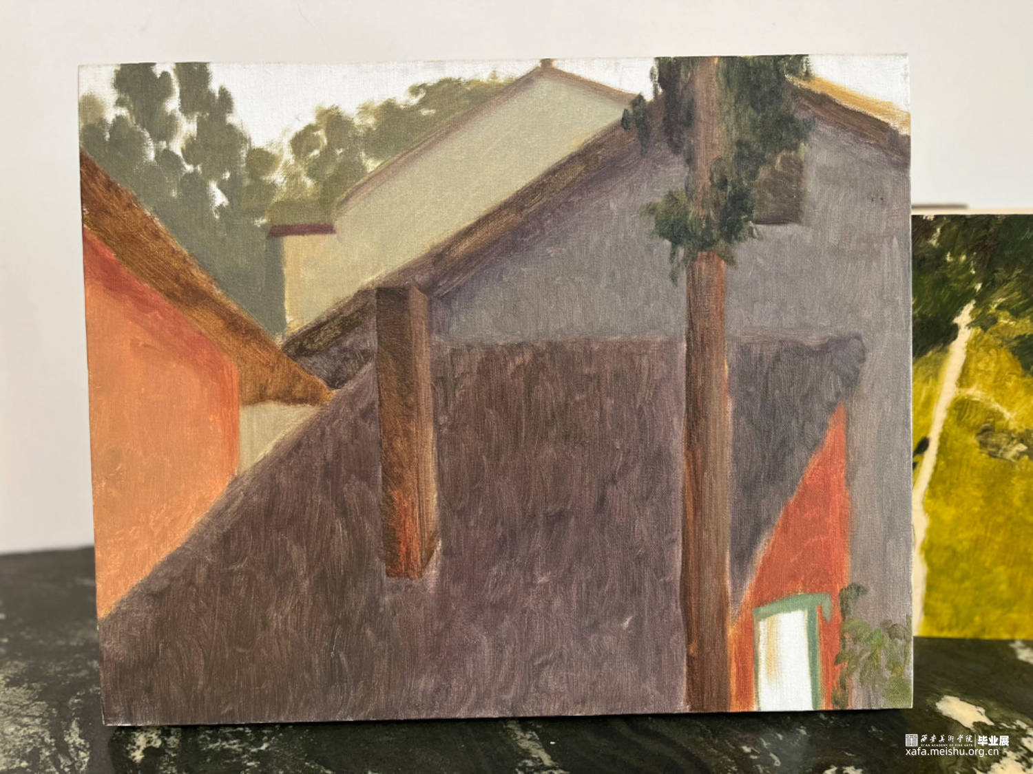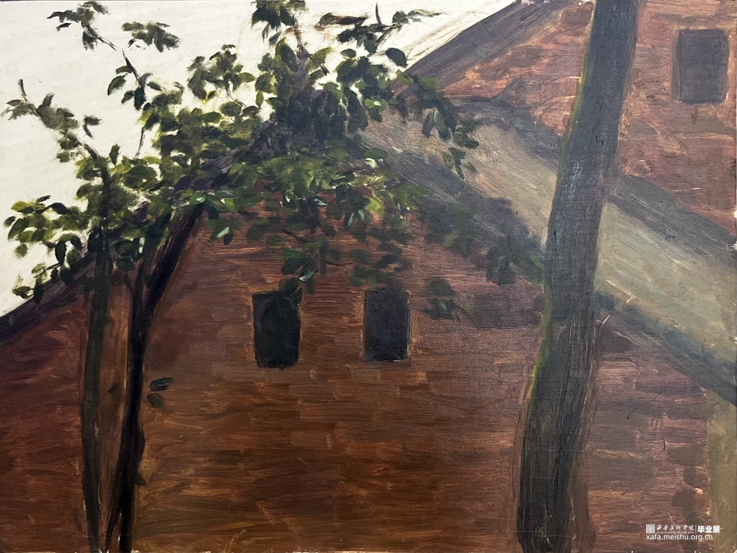 此画描绘了儿时成长的故乡,有红砖墙、蓝绿铁门等,而泡泡连接着童年记忆和美好感受,画中人物看着泡泡回忆起过去的二十余年时光。
