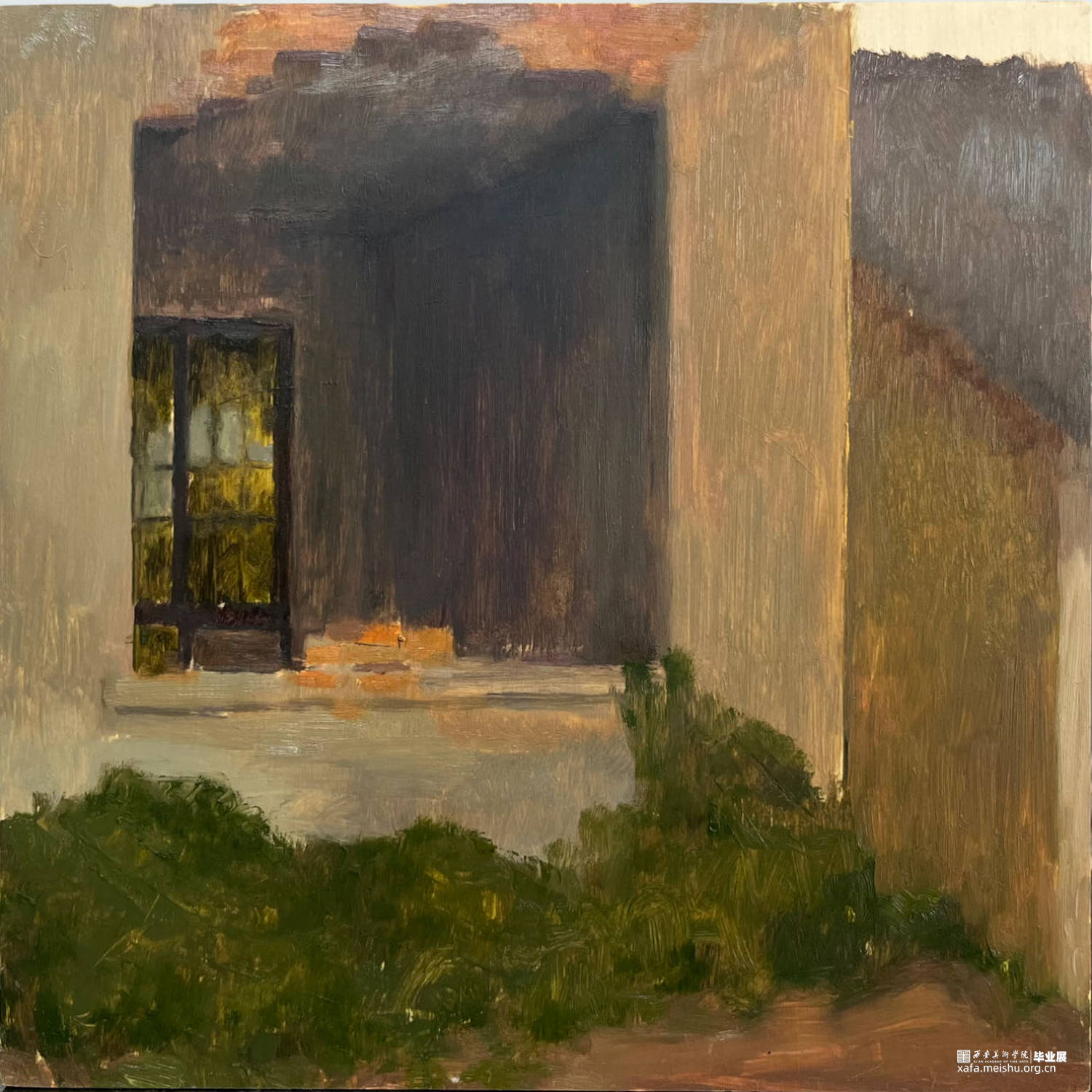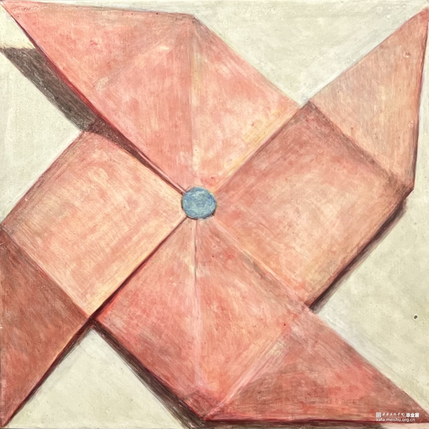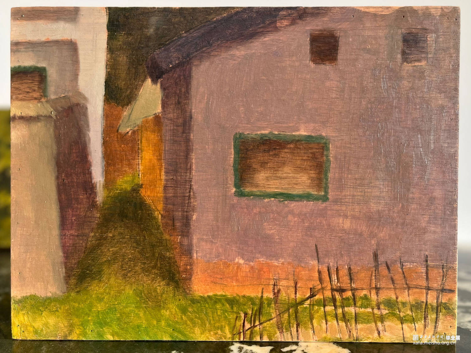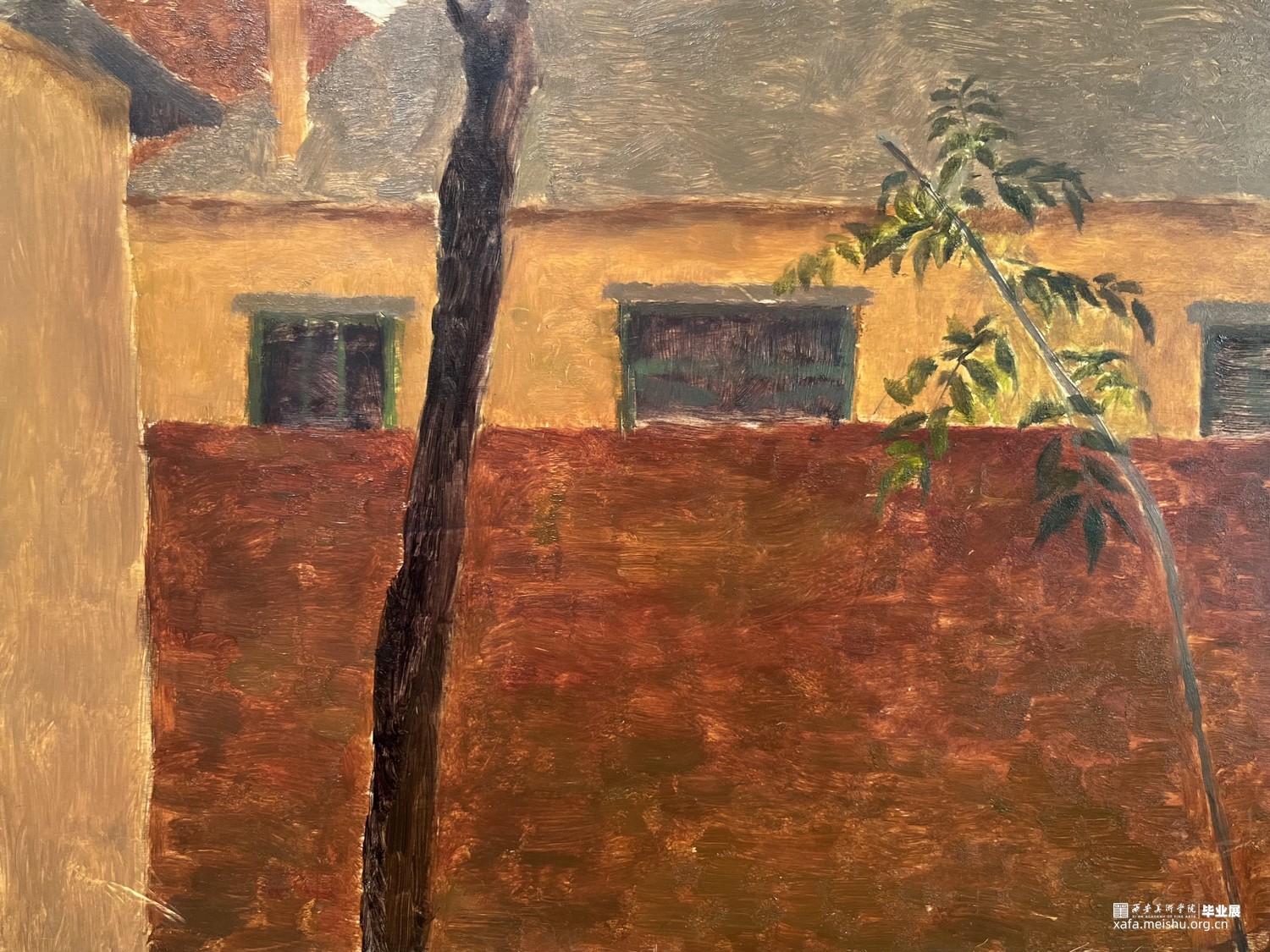 此画描绘了儿时成长的故乡,有红砖墙、蓝绿铁门等,而泡泡连接着童年记忆和美好感受,画中人物看着泡泡回忆起过去的二十余年时光。