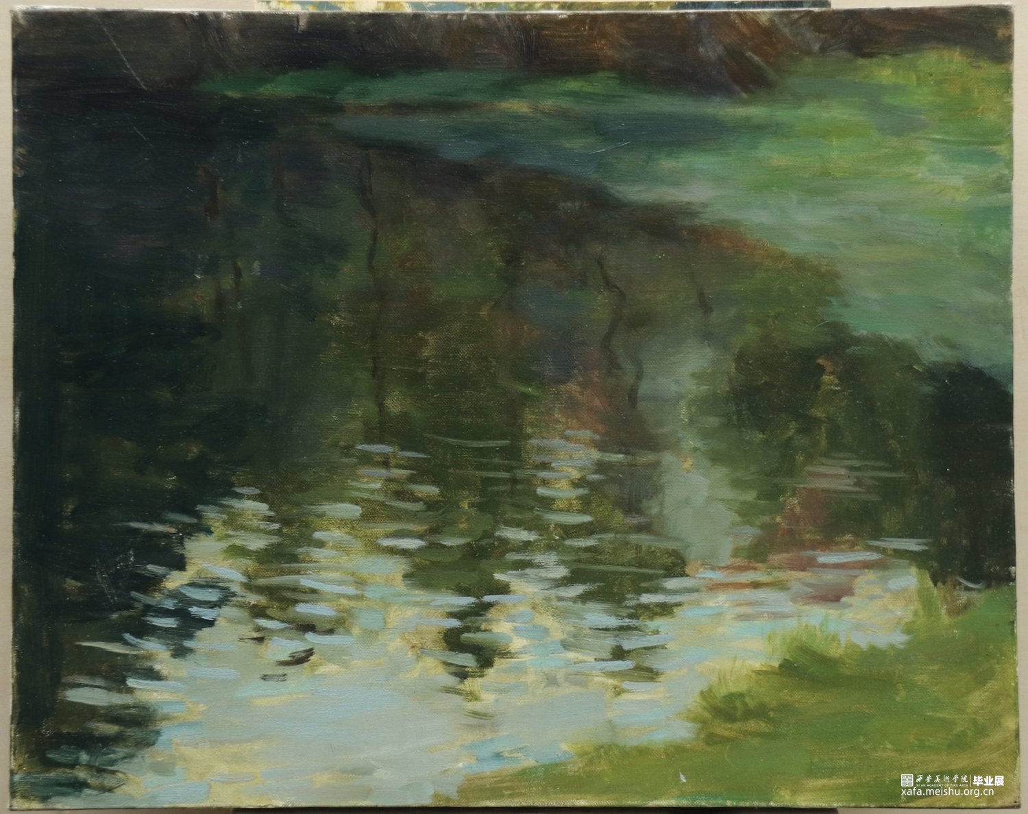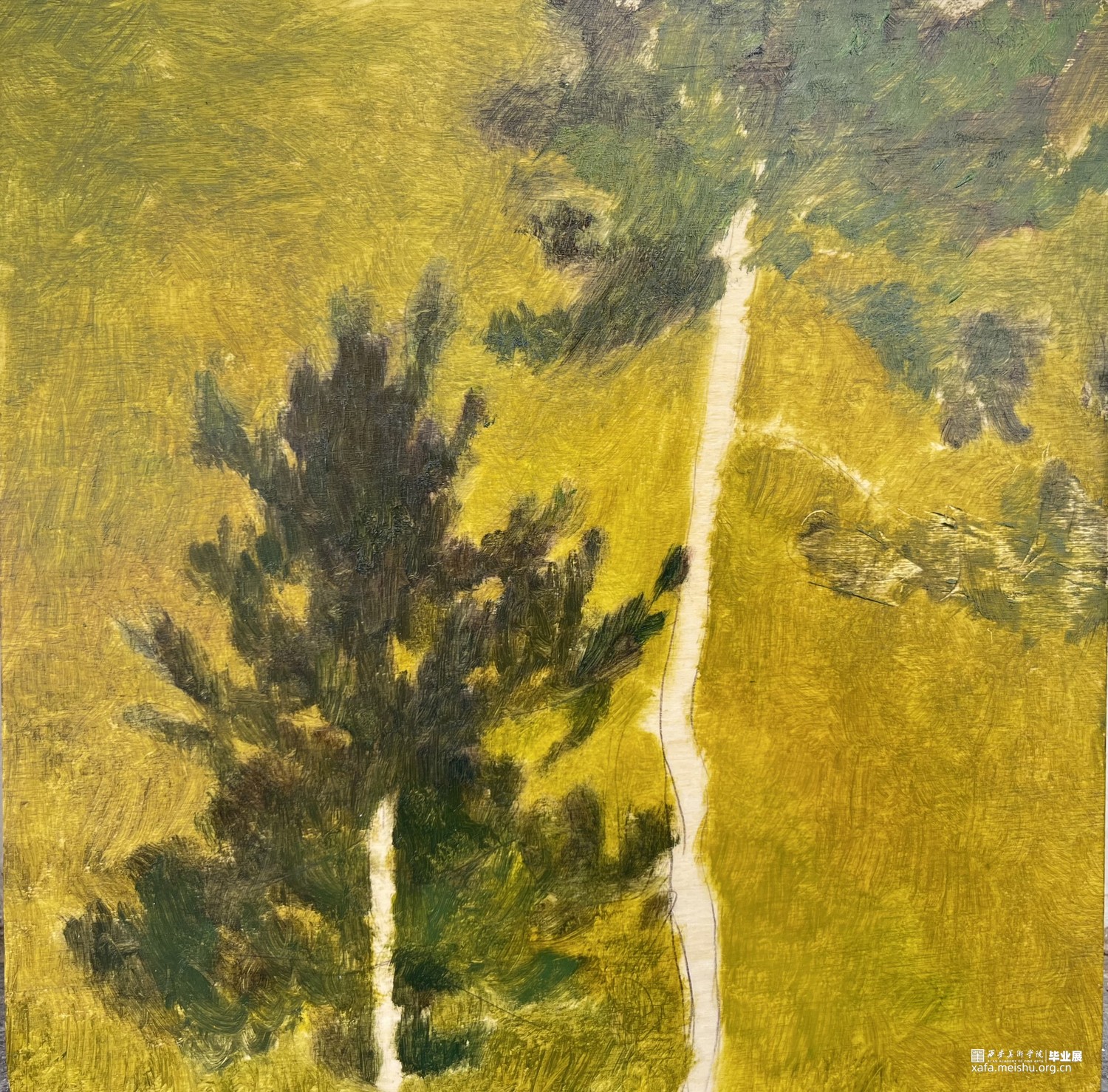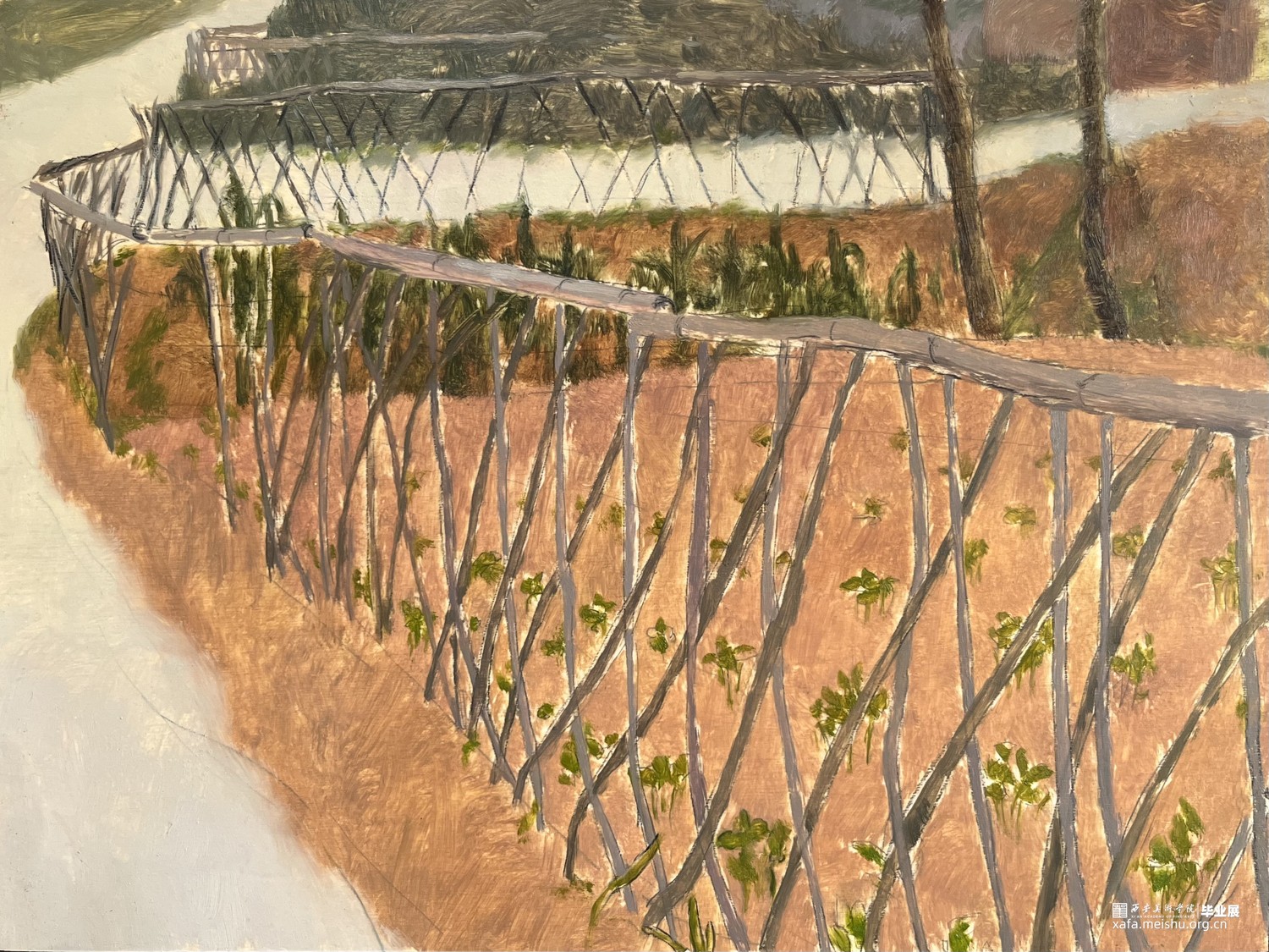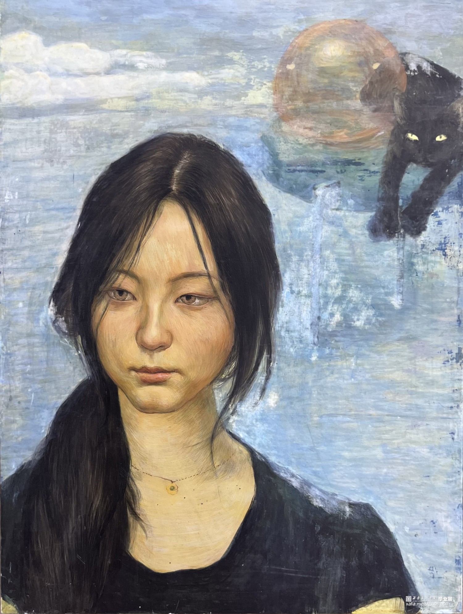 此画描绘了儿时成长的故乡,有红砖墙、蓝绿铁门等,而泡泡连接着童年记忆和美好感受,画中人物看着泡泡回忆起过去的二十余年时光。