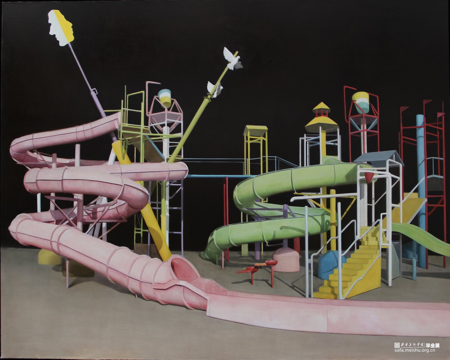 作品采用古典罩染技法,黑色的背景和明亮的物体产生强烈的反差。背景黑色可指不好的欲望,一些自私的人或想法将本该属于他人的事情囚禁于此。乐园本来应该是人们娱乐的场所,却被这些无赖之人侵占,成为他们的乐园,即便是这样,渴求自由的心是不死的,所以娱乐设施是保持底色的,白鸽也带来了和平和希望,双人脸可以看作是一种讽刺,别有一番用易却毫无一人。
