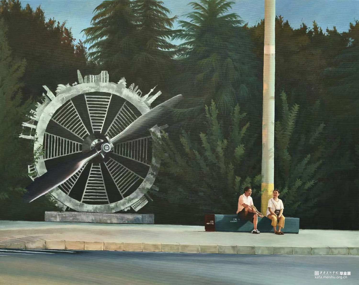 本作品描绘了一幅傍晚时分的场景。画面深处,茂密的树木簇拥着,它们在黄昏的七八点显得尤为静谧。树木的轮廓在夕阳的余晖中若隐若现,营造了一种宁静而深远的氛围。画面的左侧位置,一座简洁的建筑物在光影中显得尤为突出。画面外左边是一盏暖光的路灯右边是冷光的路灯,这种冷暖光线的对比,增强了画面的视觉冲击力。在画面的前景,两位中年人穿着短袖短裤,正在悠闲地交谈,两位中年人的存在,为整个画面增添了一种生活的气息,也让观者能够感受到一种岁月的静好和人生的美好。