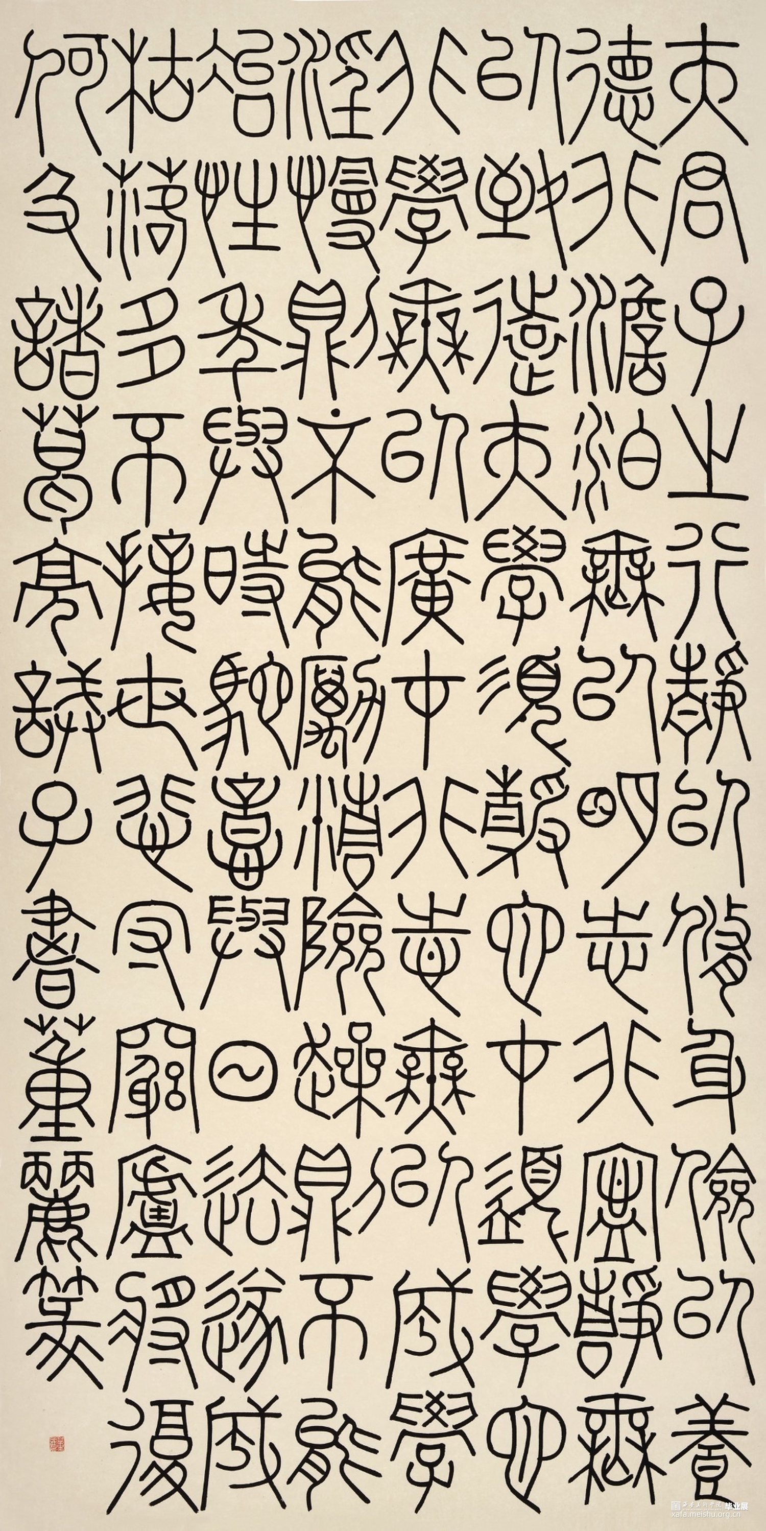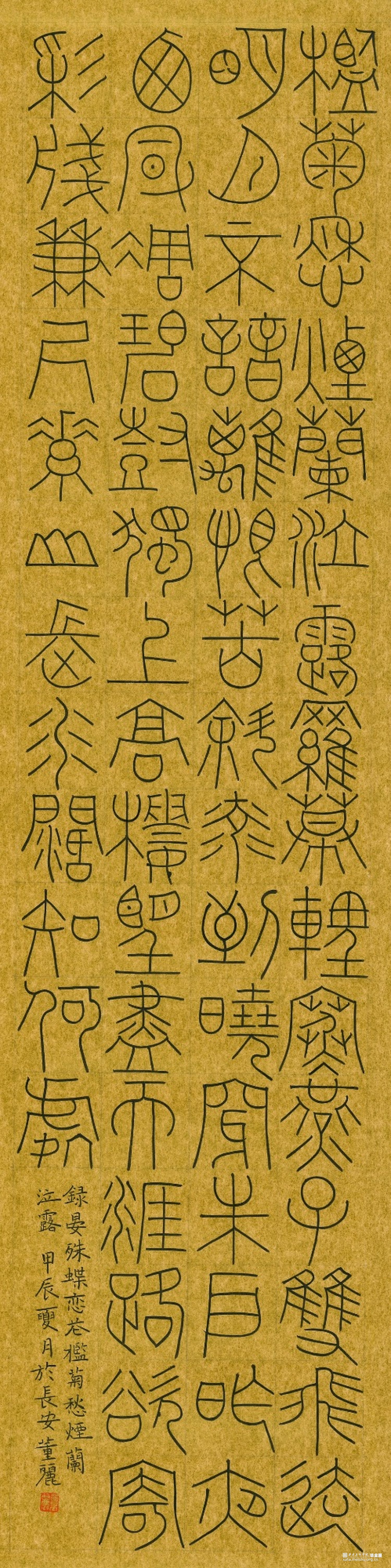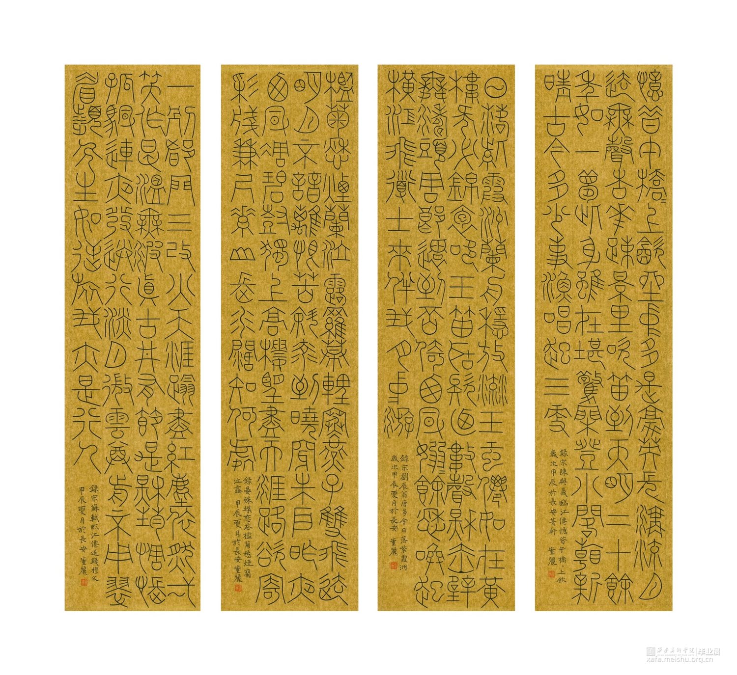 《宋词篆书四条屏》作品阐释:这件作品采用金潜纸创作,取法唐篆,元篆笔意,其中篆法参三代吉金文字,方中见圆,圆中见方,整体气息采用空灵轻盈的氛围。 《诸葛亮诫子书》篆书。作品阐释:此件作品为八尺整宣纸,取法铁线篆,篆法参三代吉金文字,整体点画追求遒劲有力,墨色饱满,章法之间字与字相互呼应,上下左右字与字之间点画虚实相生。 《董丽印痕》此毕业作品选取陶瓷印数方,其中陶瓷材质的篆刻作品更能体现出写意风格的作品,篆刻方寸之间见天地,阴阳,虚实,俯仰之间展示出中国艺术的独特风貌