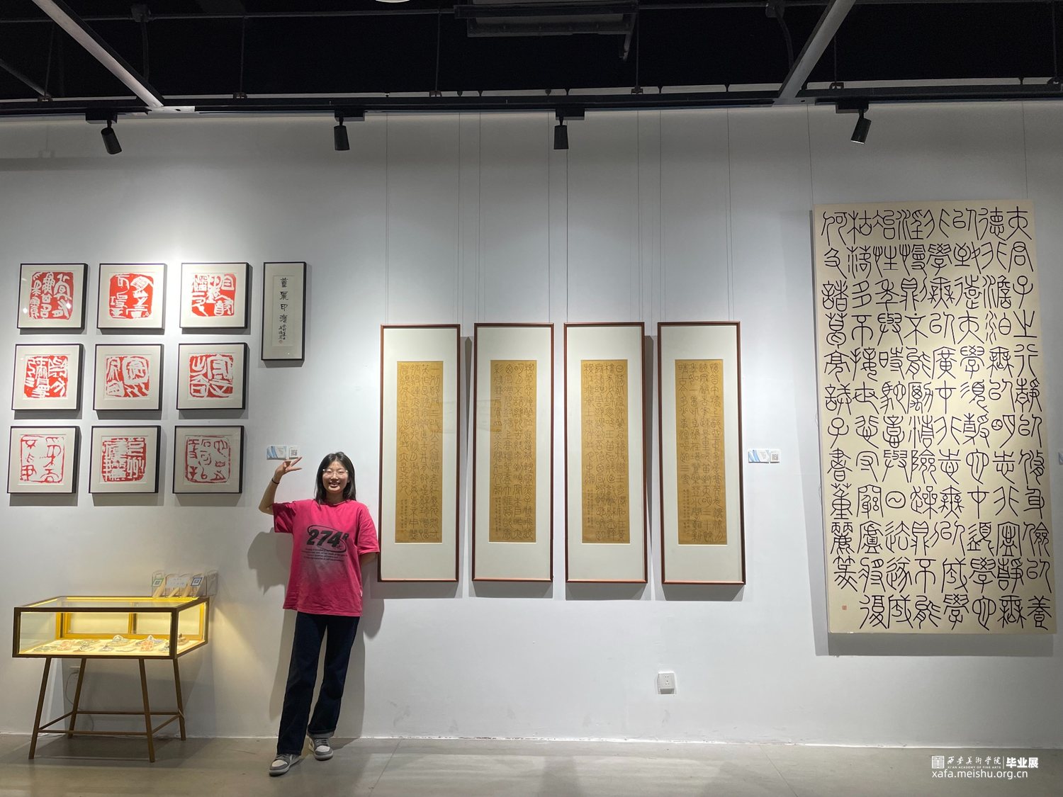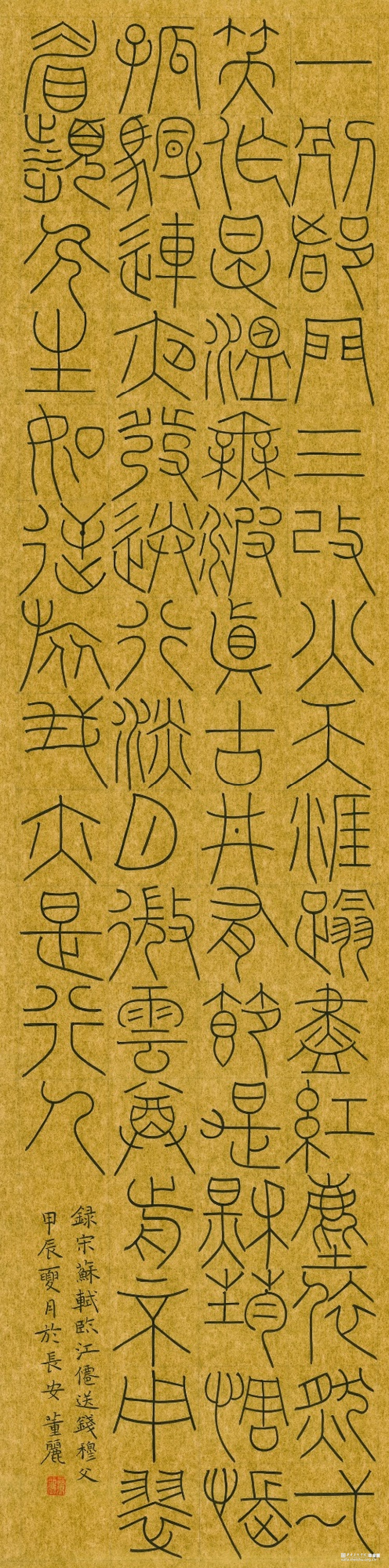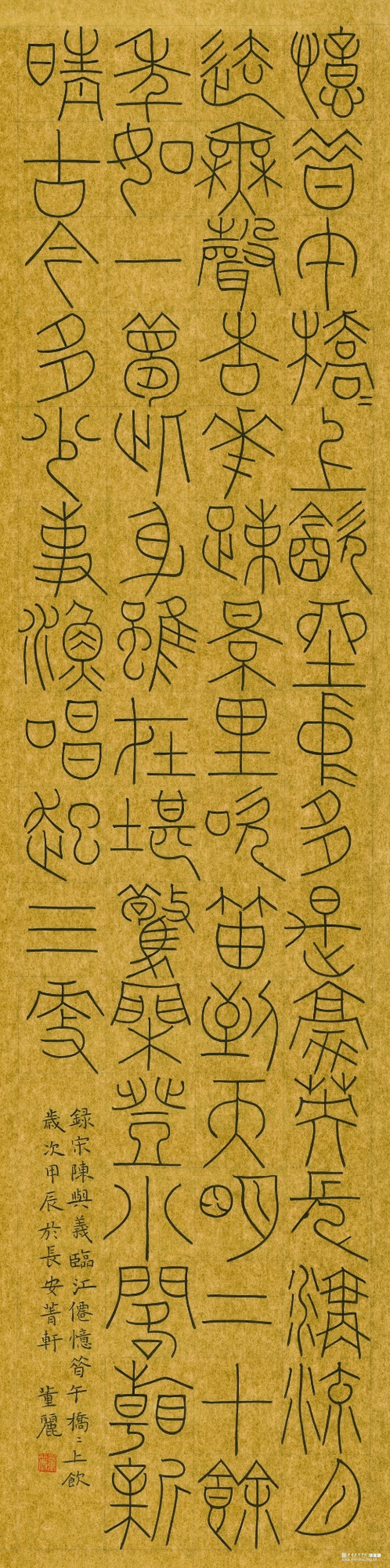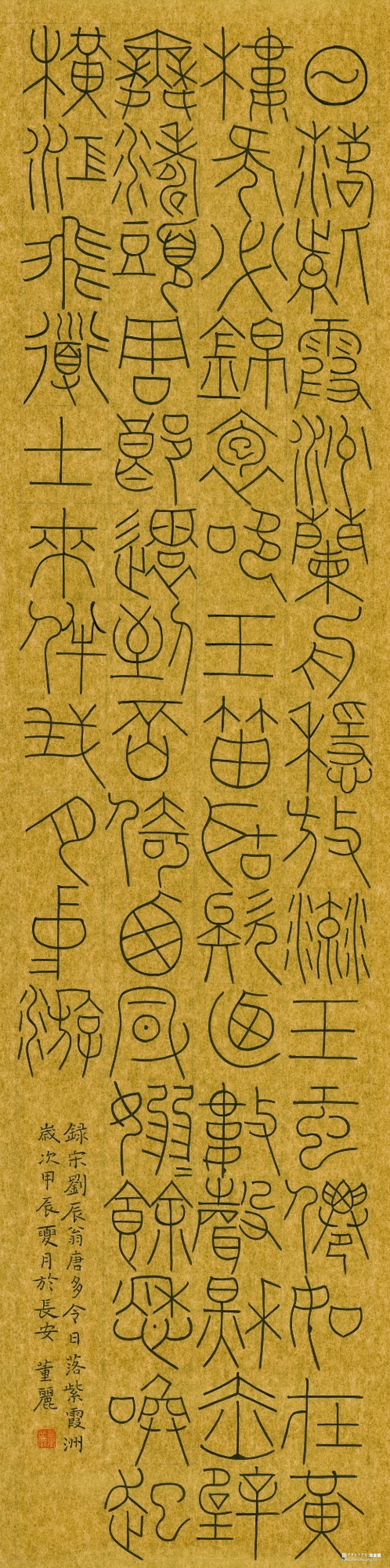 《宋词篆书四条屏》作品阐释:这件作品采用金潜纸创作,取法唐篆,元篆笔意,其中篆法参三代吉金文字,方中见圆,圆中见方,整体气息采用空灵轻盈的氛围。 《诸葛亮诫子书》篆书。作品阐释:此件作品为八尺整宣纸,取法铁线篆,篆法参三代吉金文字,整体点画追求遒劲有力,墨色饱满,章法之间字与字相互呼应,上下左右字与字之间点画虚实相生。 《董丽印痕》此毕业作品选取陶瓷印数方,其中陶瓷材质的篆刻作品更能体现出写意风格的作品,篆刻方寸之间见天地,阴阳,虚实,俯仰之间展示出中国艺术的独特风貌
