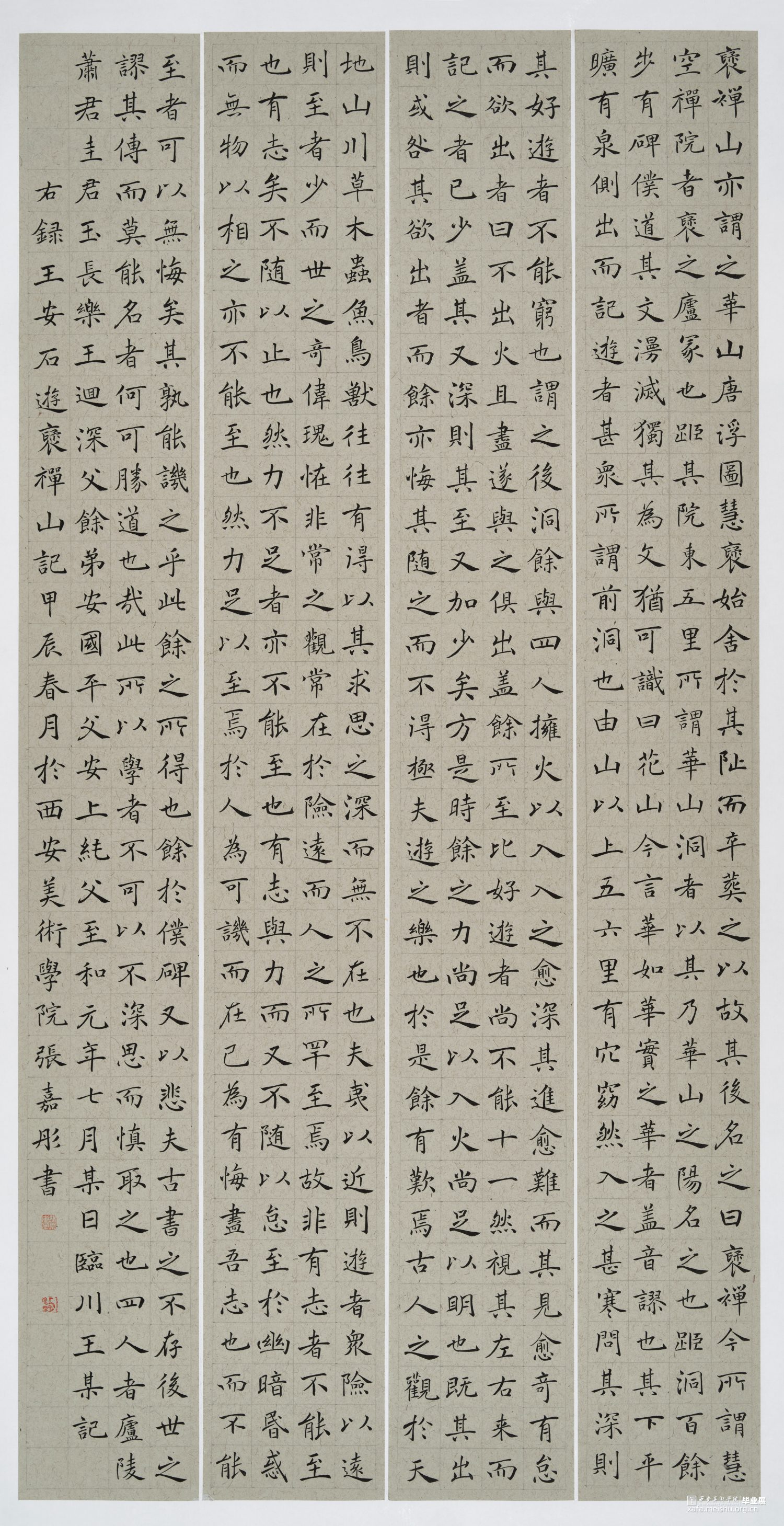 1.《游褒禅山记》:此文叙述了作者和几位同伴游褒禅山所见到的景物以及游山经过,并以此为喻,说明要实现理想,在研究学问上要“深思而慎取”。该作品取法自褚遂良,突出其宛丽清新的书法风格,章法上采用立轴拼接形式。