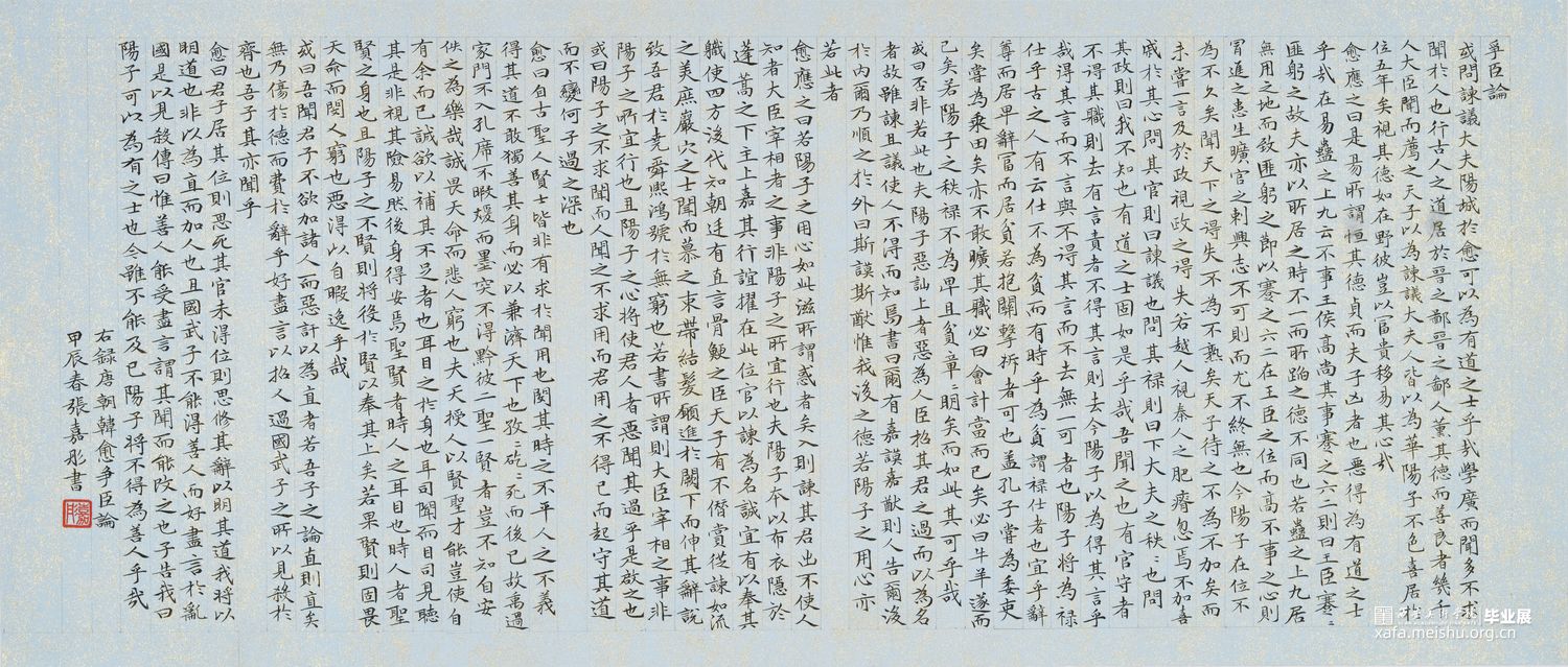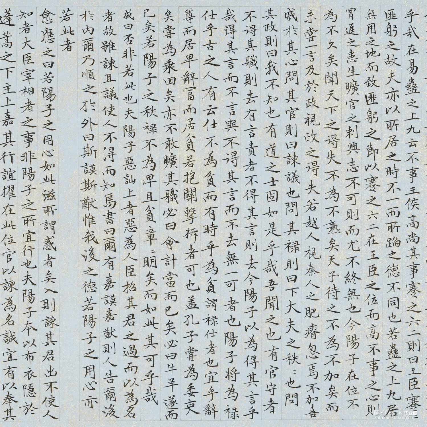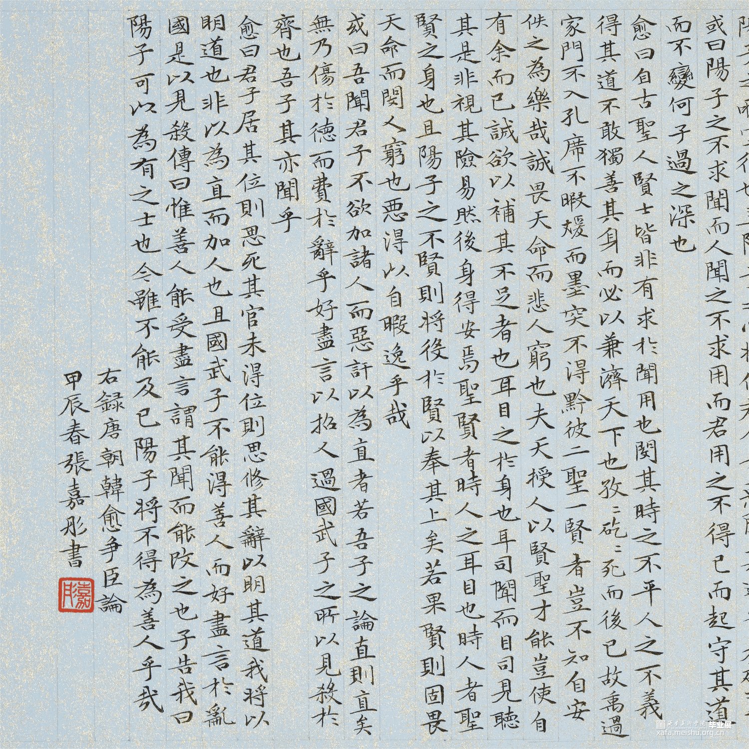 2.《韩愈争臣论》:该文采用问答形式,在辩论的过程中逐渐推出作者观点。韩愈怀着忧国忧民之心,一针见血地对当时的政治现状进行了建议,展现出其敢于面对现实,如何治理社会和解决现实中的问题的能力。此件作品取法自文徵明小楷,章法上有列无行,字径约为1cm,表现了文徵明细腻入微,结构严谨的书法特点。