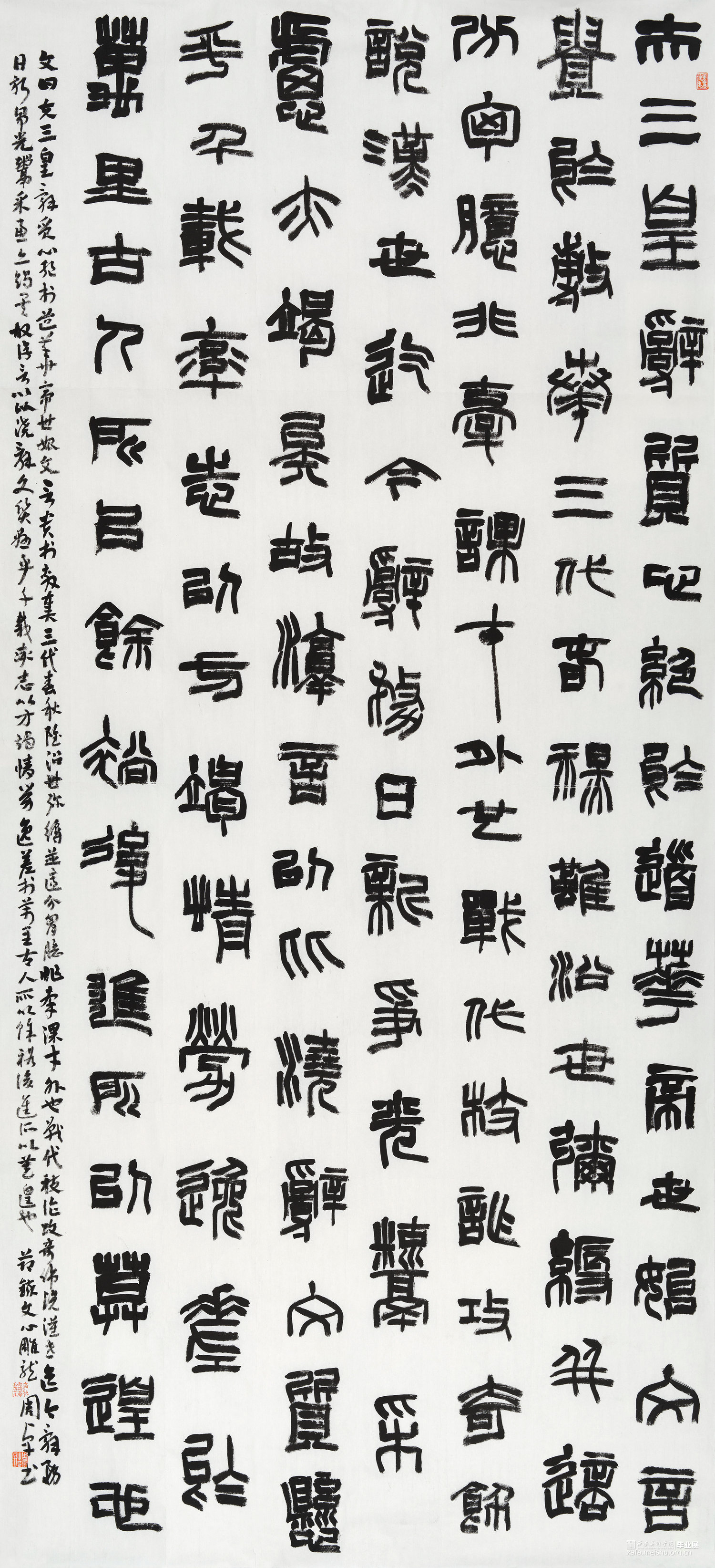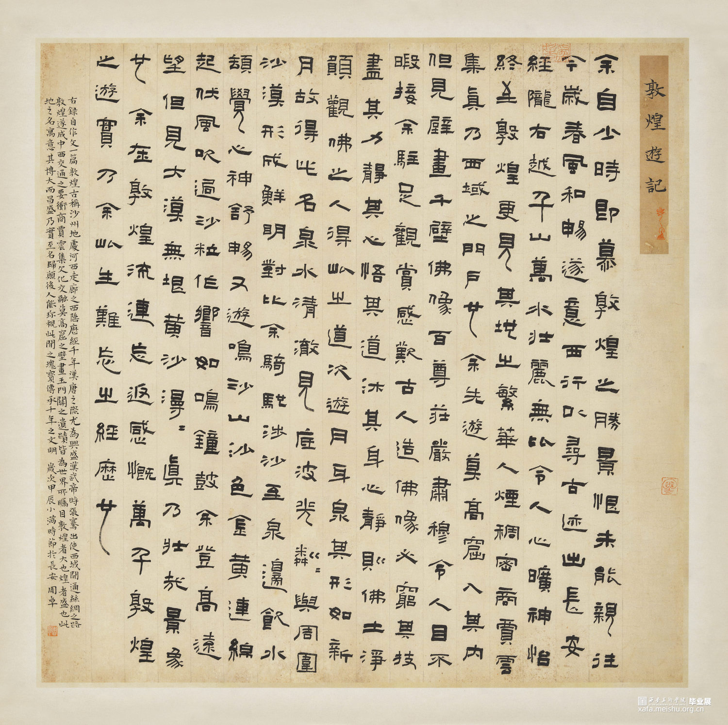 作品一:此作品采用八尺生宣,有行无列的章法布局,拟汉金文笔意为之。内容为:节录《文心雕龙》养气篇。 作品二:此作品为自作敦煌游记一篇,小字隶书写成,采用有行无列章法,尺幅为四尺斗方。