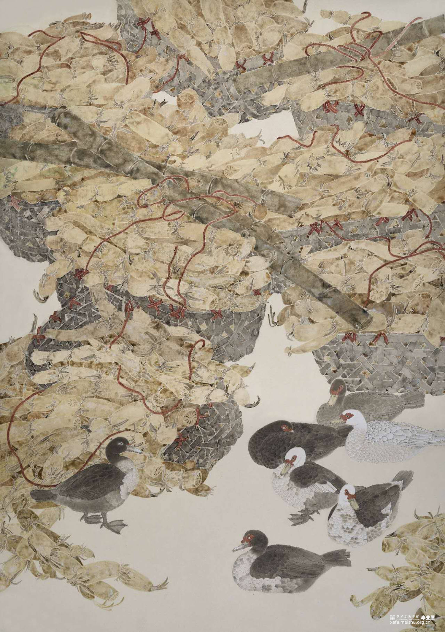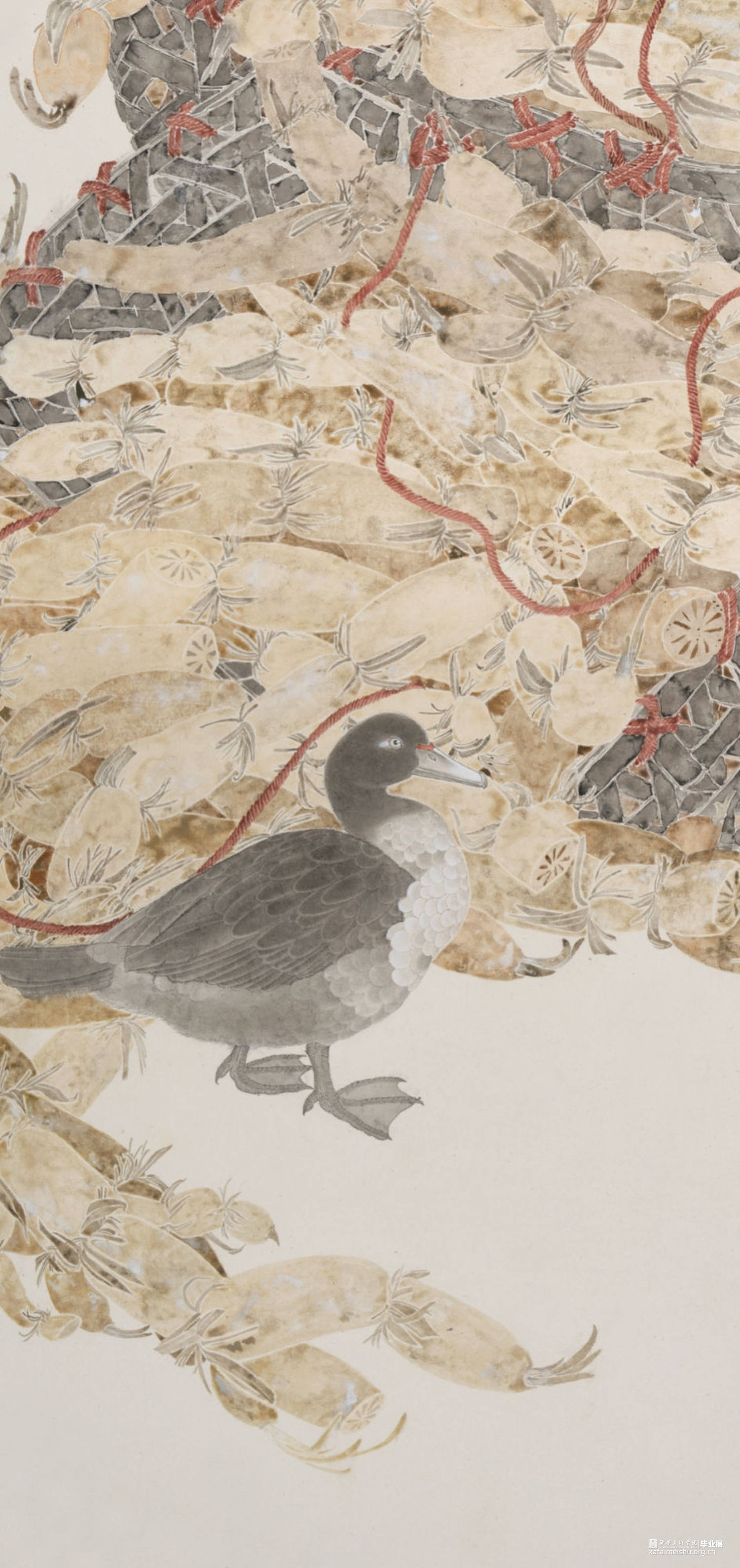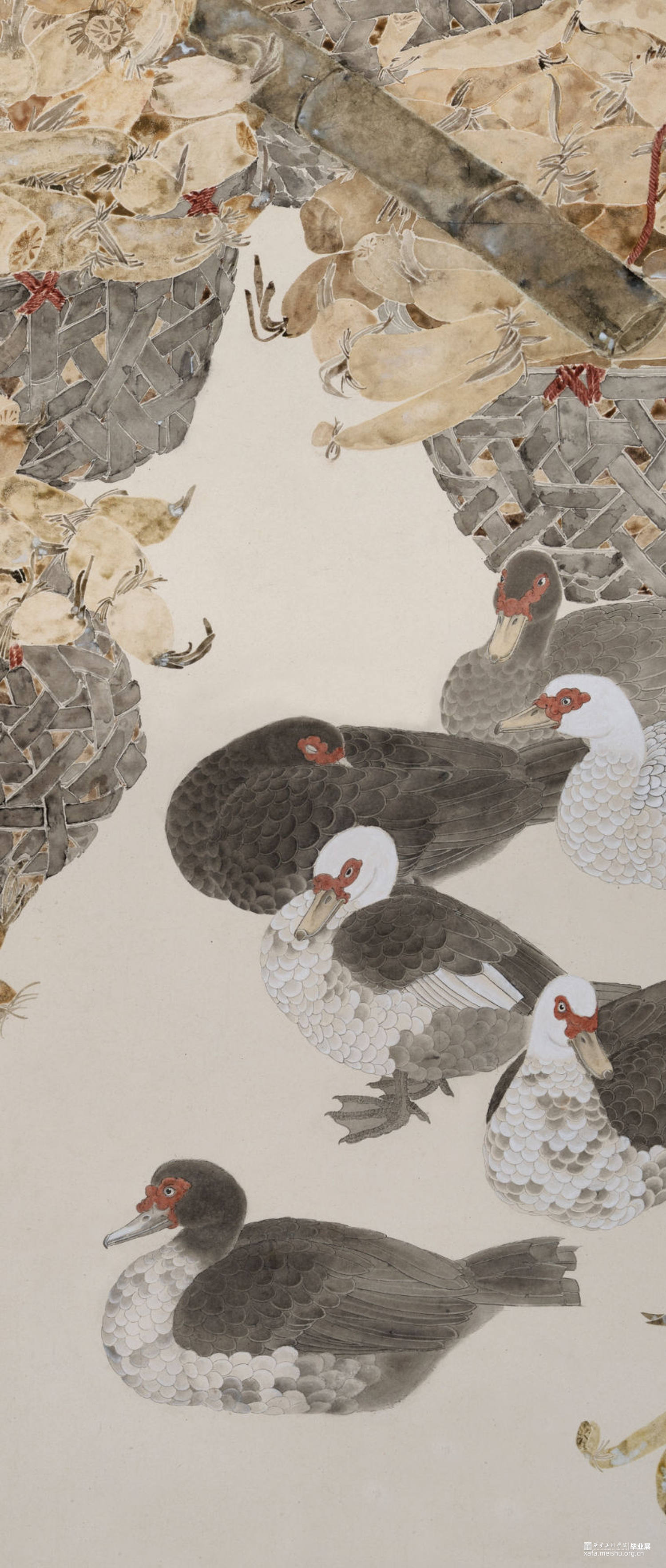 金秋十月,丰收的季节。净逸的荷花虽已凋谢,但是留下盈硕的藕节。藕香四溢引来秋鸭停驻