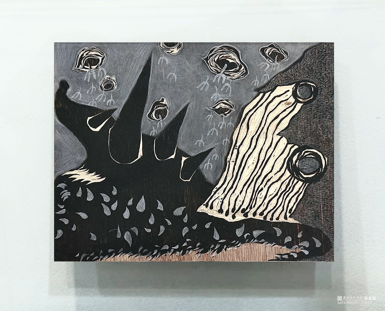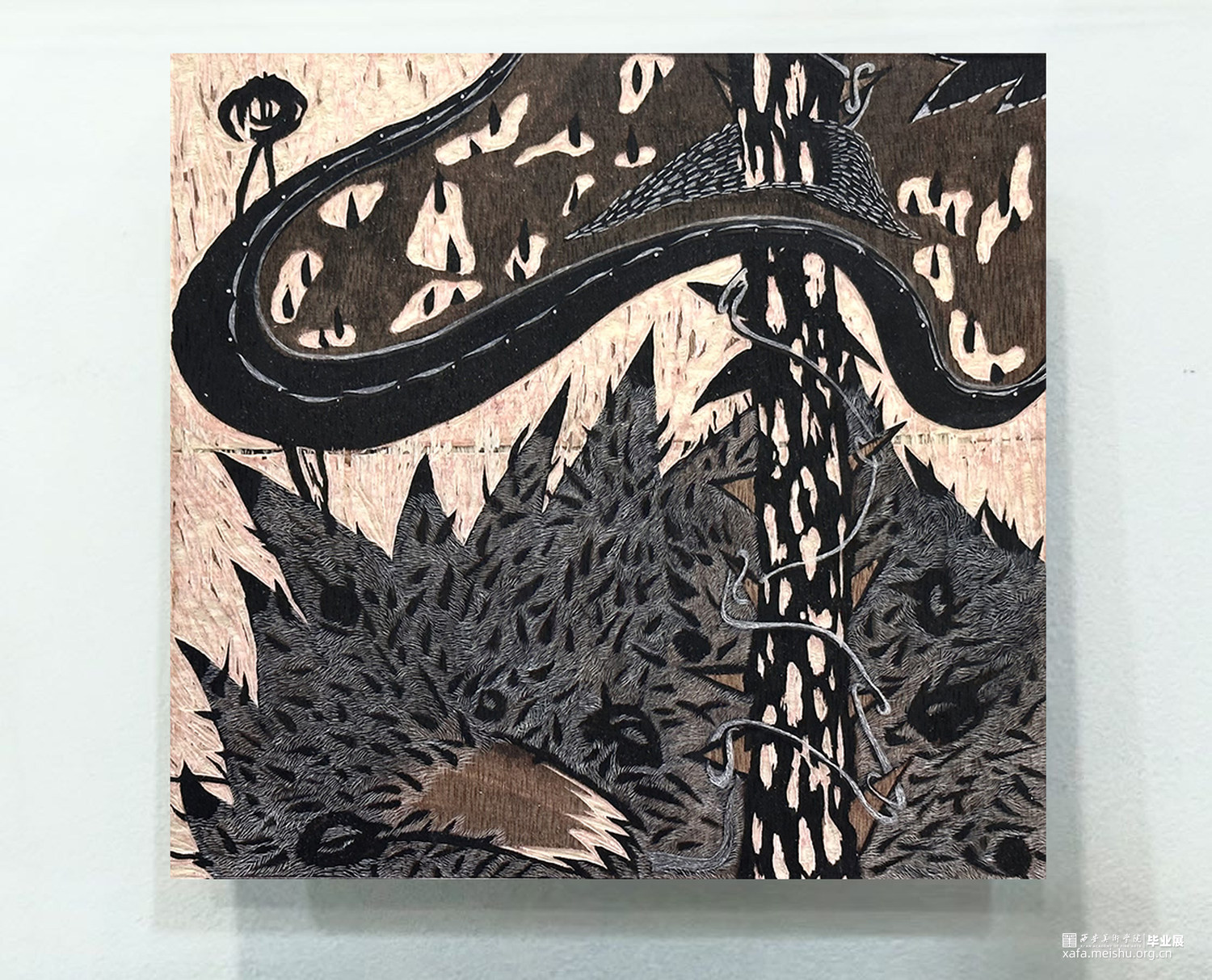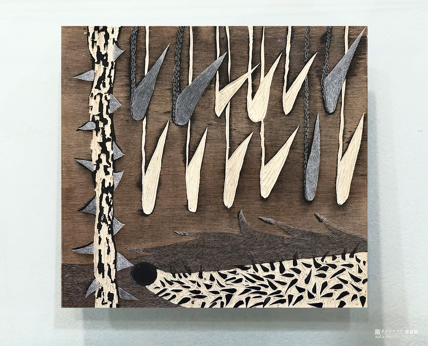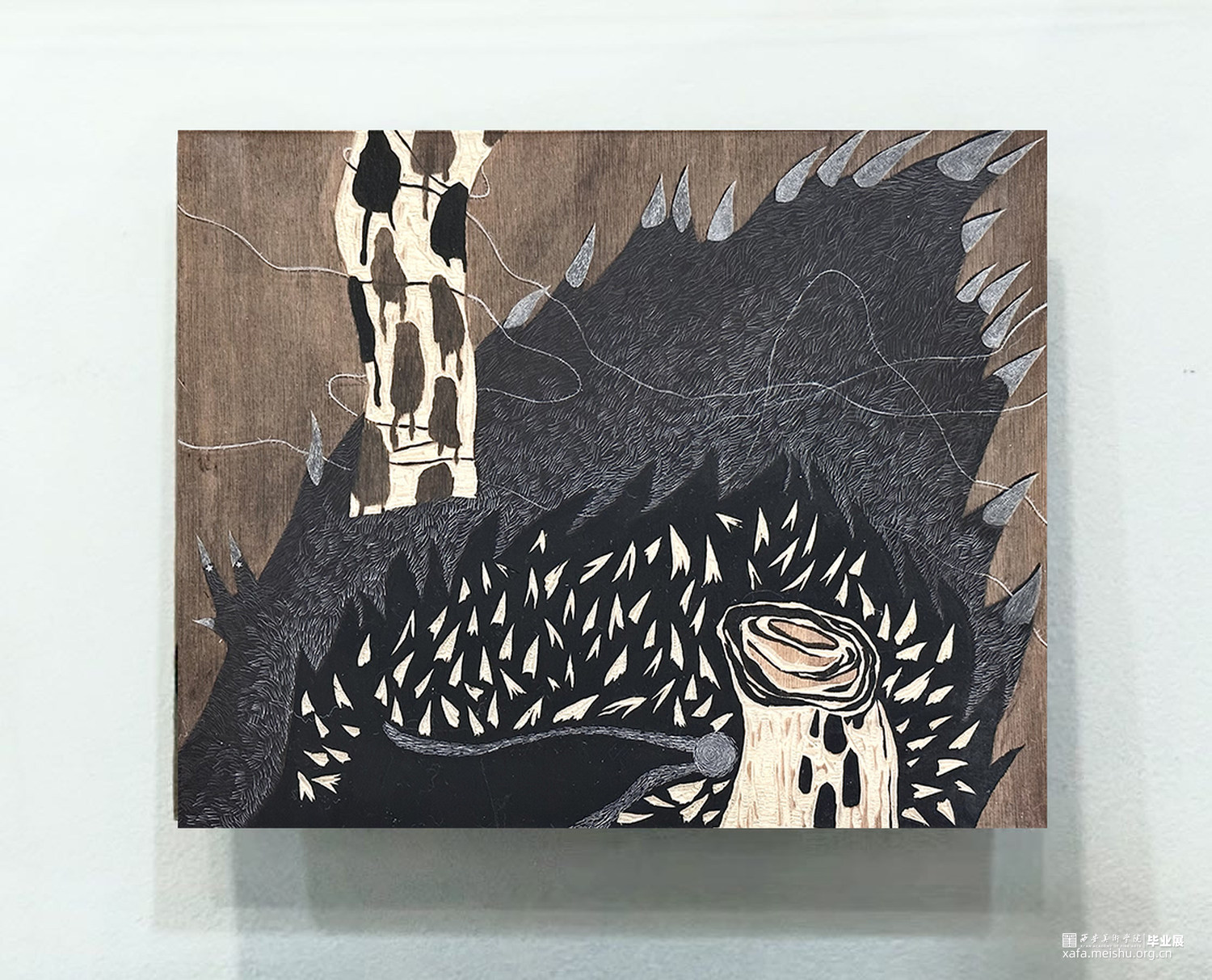 《别害怕哦》系列作品线下展览总共15幅,线上选取9幅,分别是《别害怕哦·不去听,我自得随心徜徉1》《别害怕哦·缄默是最好的回击》《别害怕哦·和朋友一起沉睡》《别害怕哦·不去听,我自得随心徜徉2》《别害怕哦·灵魂依旧不屈》《别害怕哦·不去看,我还嗅得青草香》《别害怕哦·穿梭时空的拥抱》《别害怕哦·行走在哭泣的雨滴下》《别害怕哦·锁起不开心》,将木刻和亚克力线刻叠加展示,既保留木版的韵味,又将亚克力版的灵活趣味增添其中,作品以刺猬为主要意象,五官手脚为次要意象,通过对比表达一种“可以害怕但不要害怕的想法。