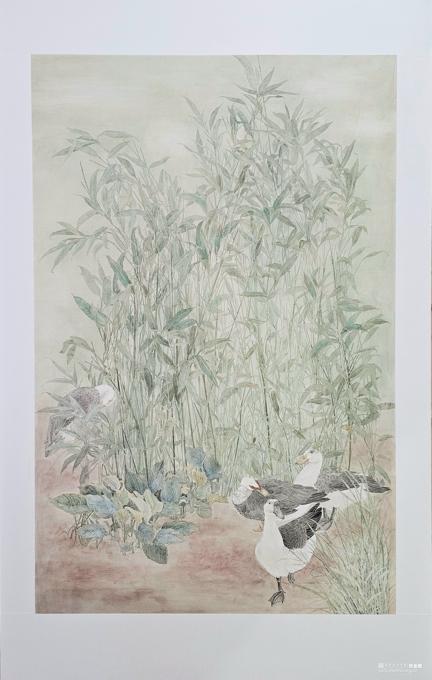 作品通过没骨技法描绘了写实的写生场景,正如所见清晨微梦朦胧之景,充满了恬静的氛围。 箬竹与鸭鹅和谐相融,春殿之中,是万物和谐的温柔。