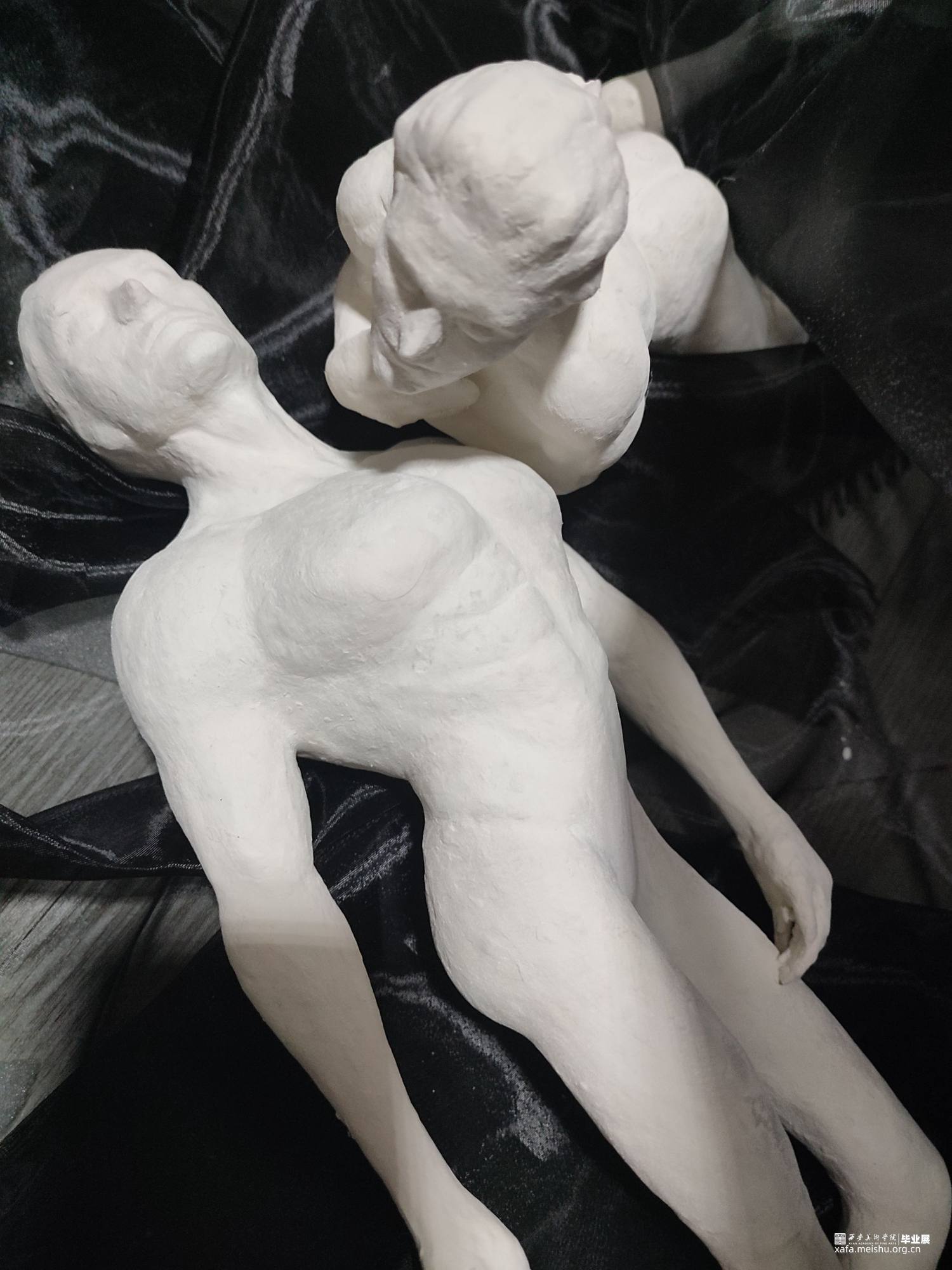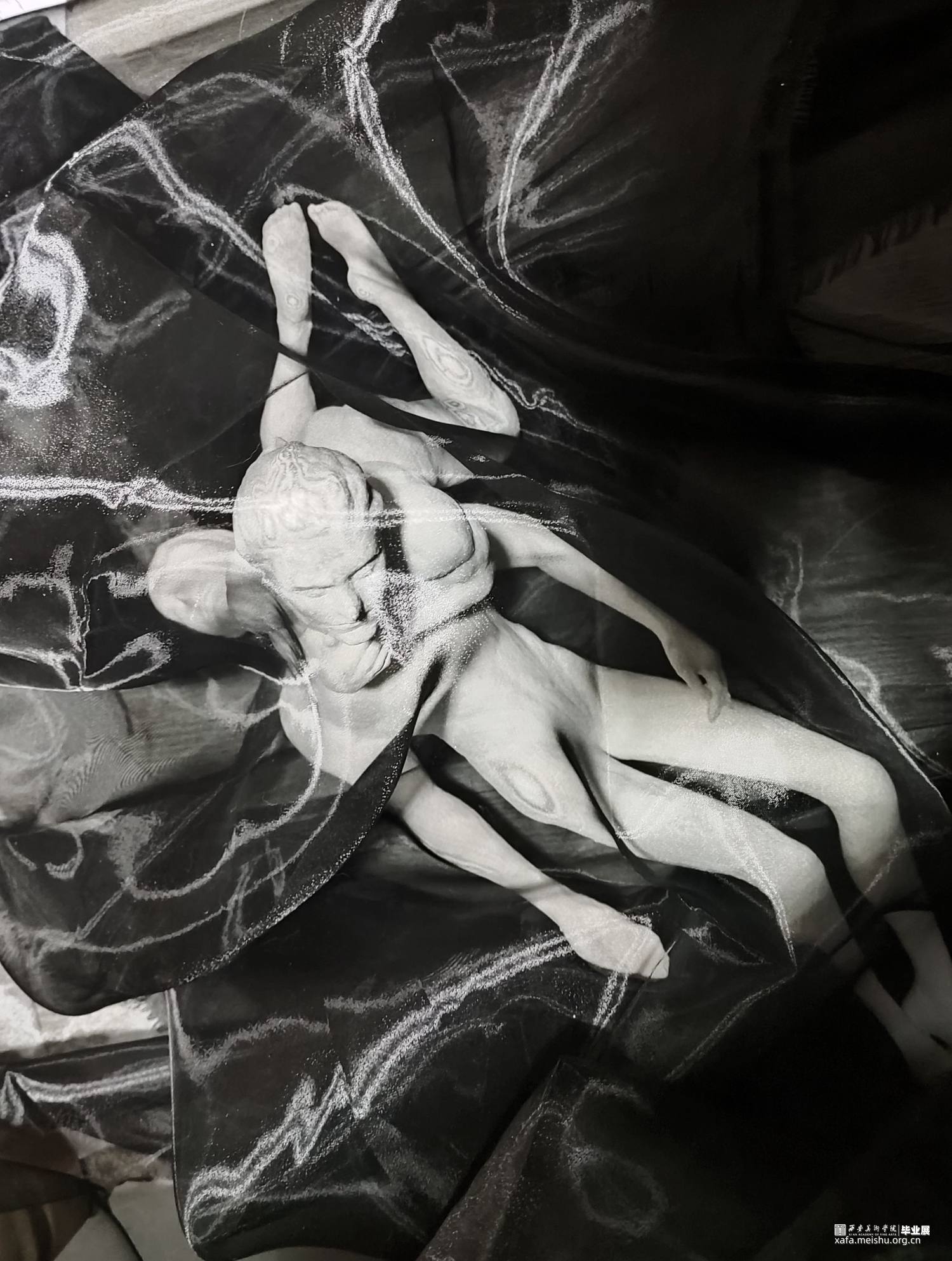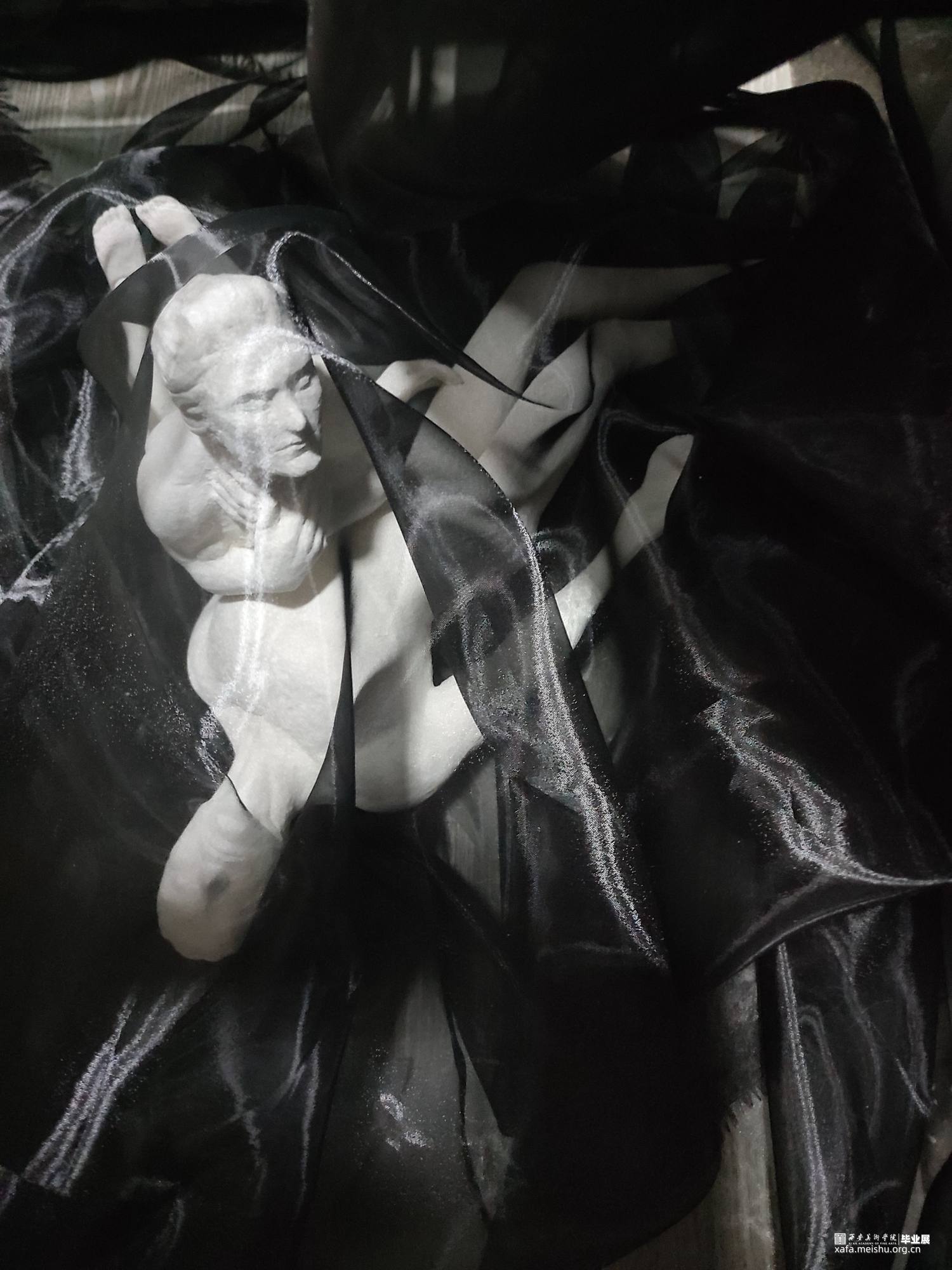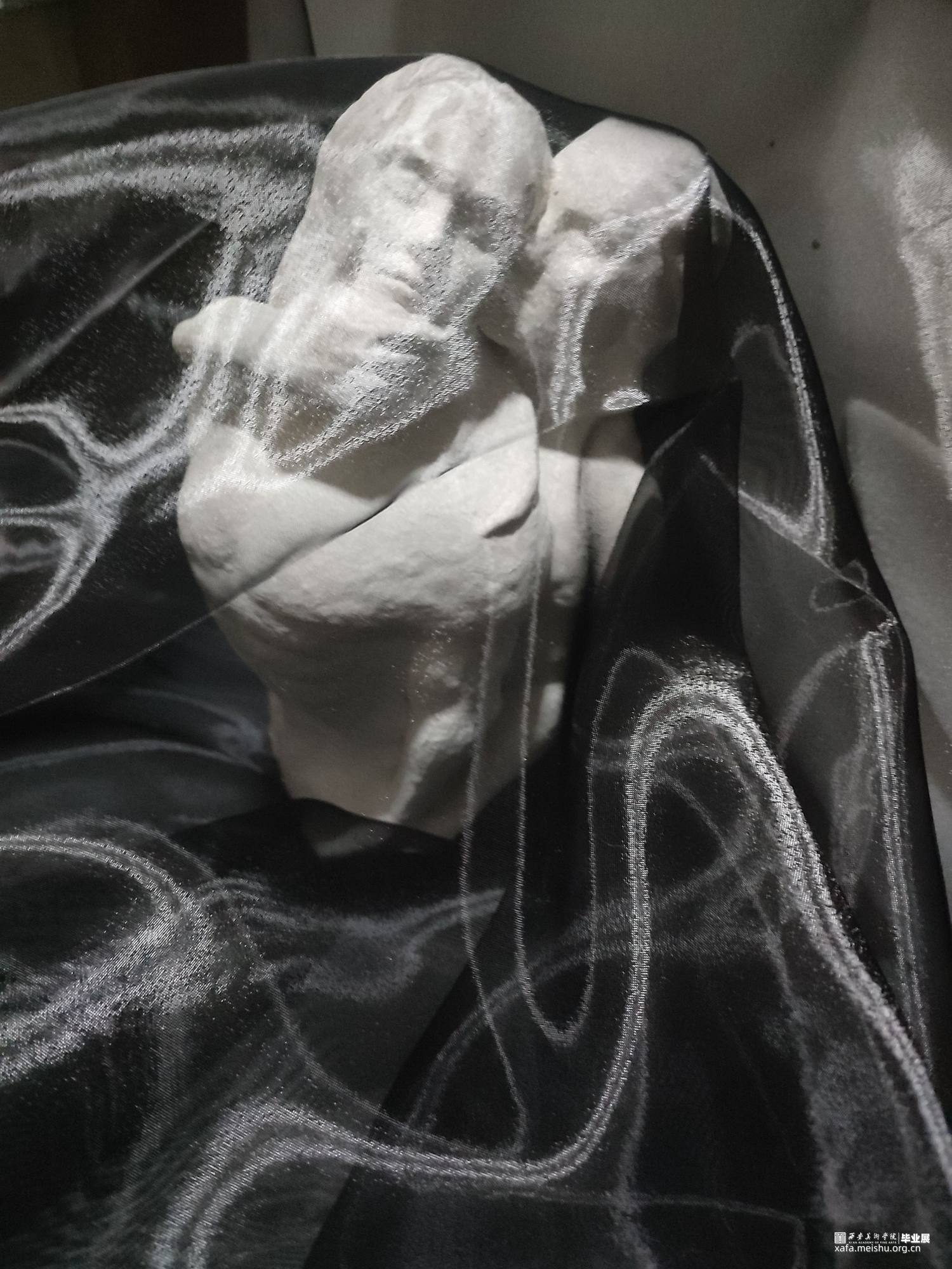 《阿卡琉斯之痛》通过表现这一场景描述传达出悲伤情绪,将古希腊少年爱的深沉与克制的表现凝聚成具象雕塑的一瞬间。跪姿的阿卡琉斯交叠的双手捂住胸口象征着失去帕特罗克洛斯的痛苦如同无法呼吸般的难咽,黑色的纱质背景如同死亡带来的阴霾,把绝望和悲伤层层笼罩无法逃离,想传达出没有你我无法呼吸。