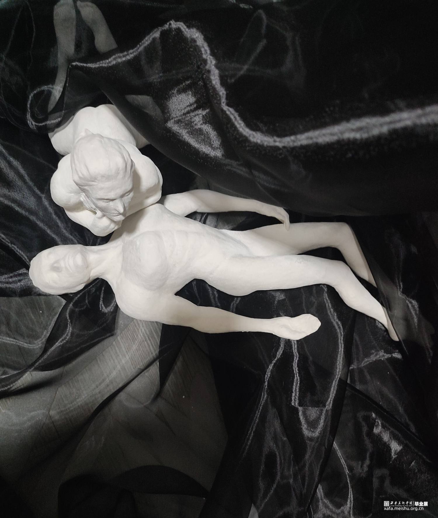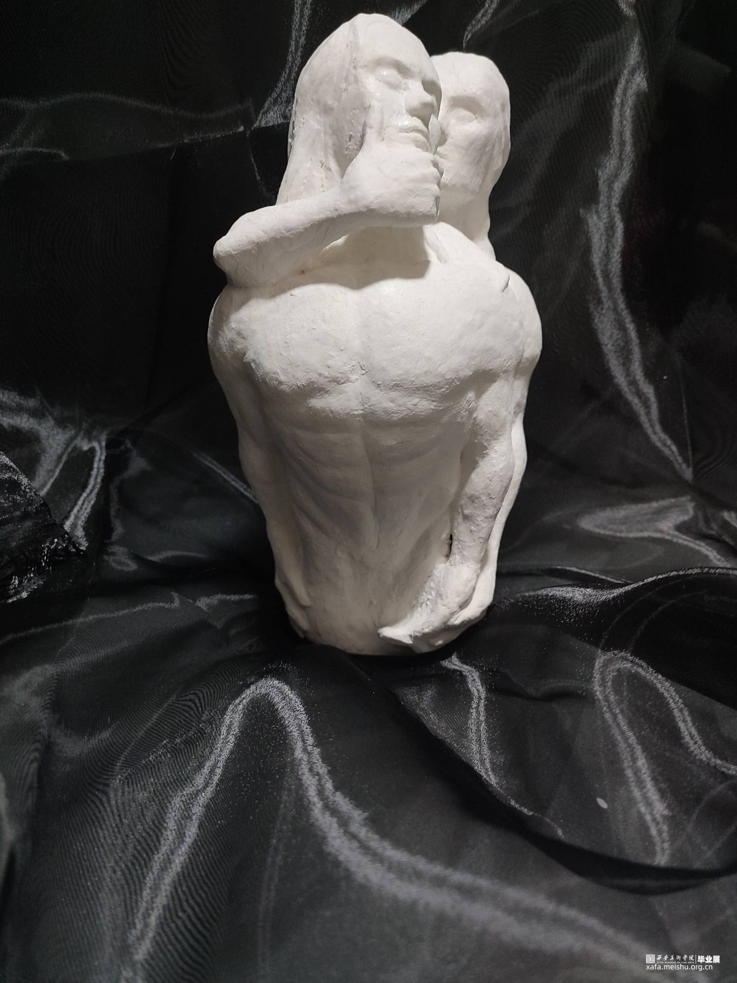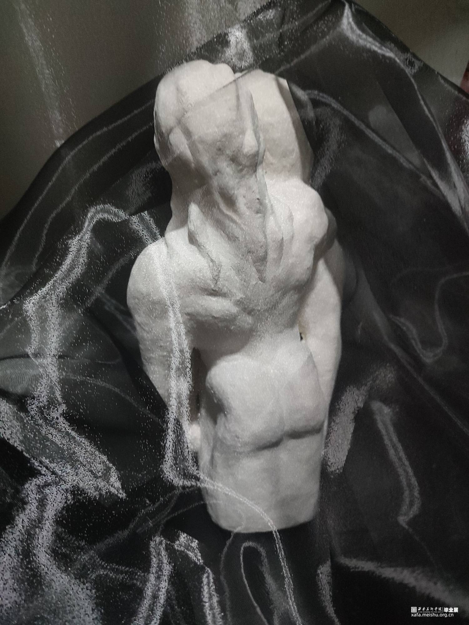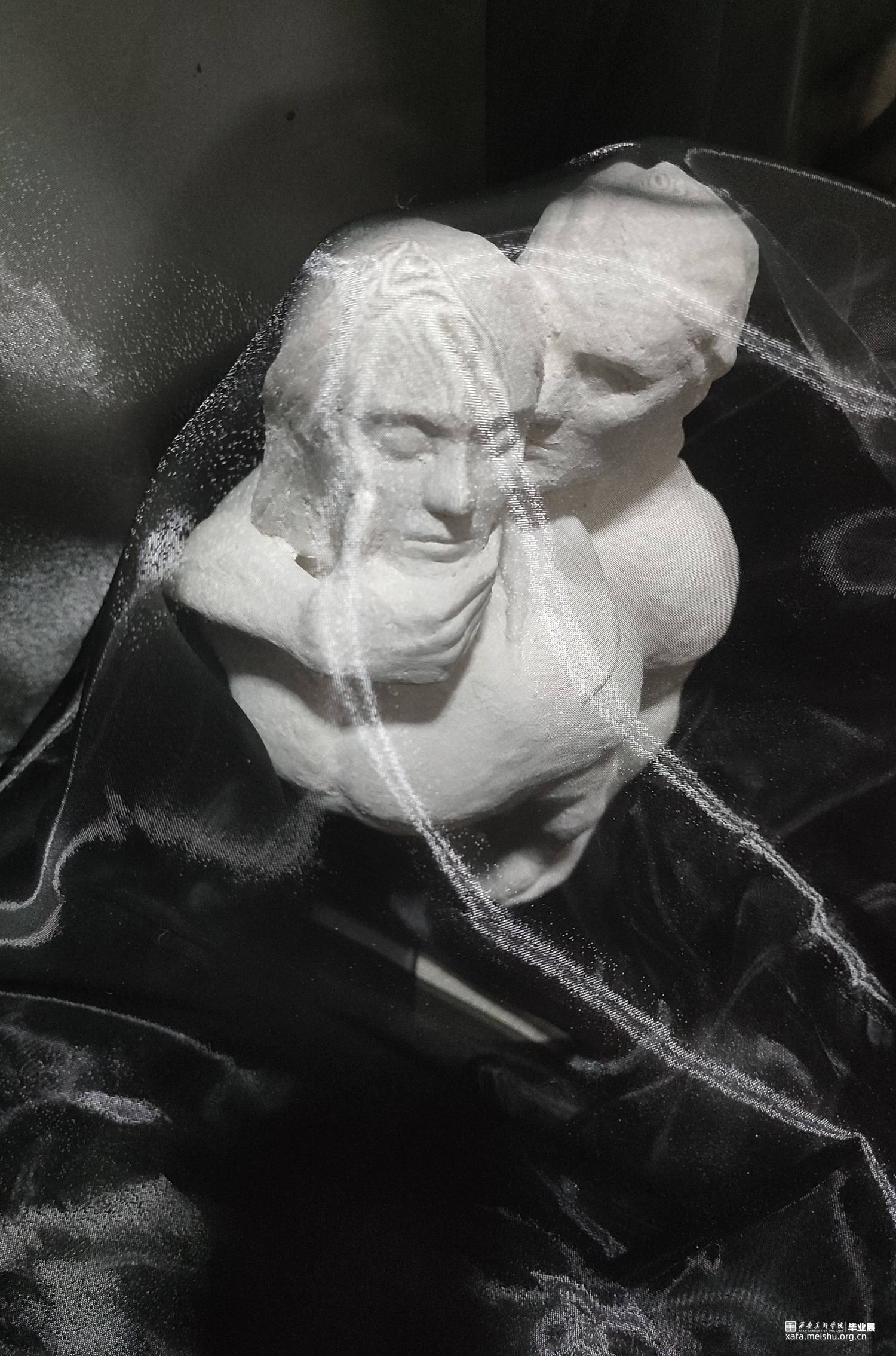 《阿卡琉斯之痛》通过表现这一场景描述传达出悲伤情绪,将古希腊少年爱的深沉与克制的表现凝聚成具象雕塑的一瞬间。跪姿的阿卡琉斯交叠的双手捂住胸口象征着失去帕特罗克洛斯的痛苦如同无法呼吸般的难咽,黑色的纱质背景如同死亡带来的阴霾,把绝望和悲伤层层笼罩无法逃离,想传达出没有你我无法呼吸。